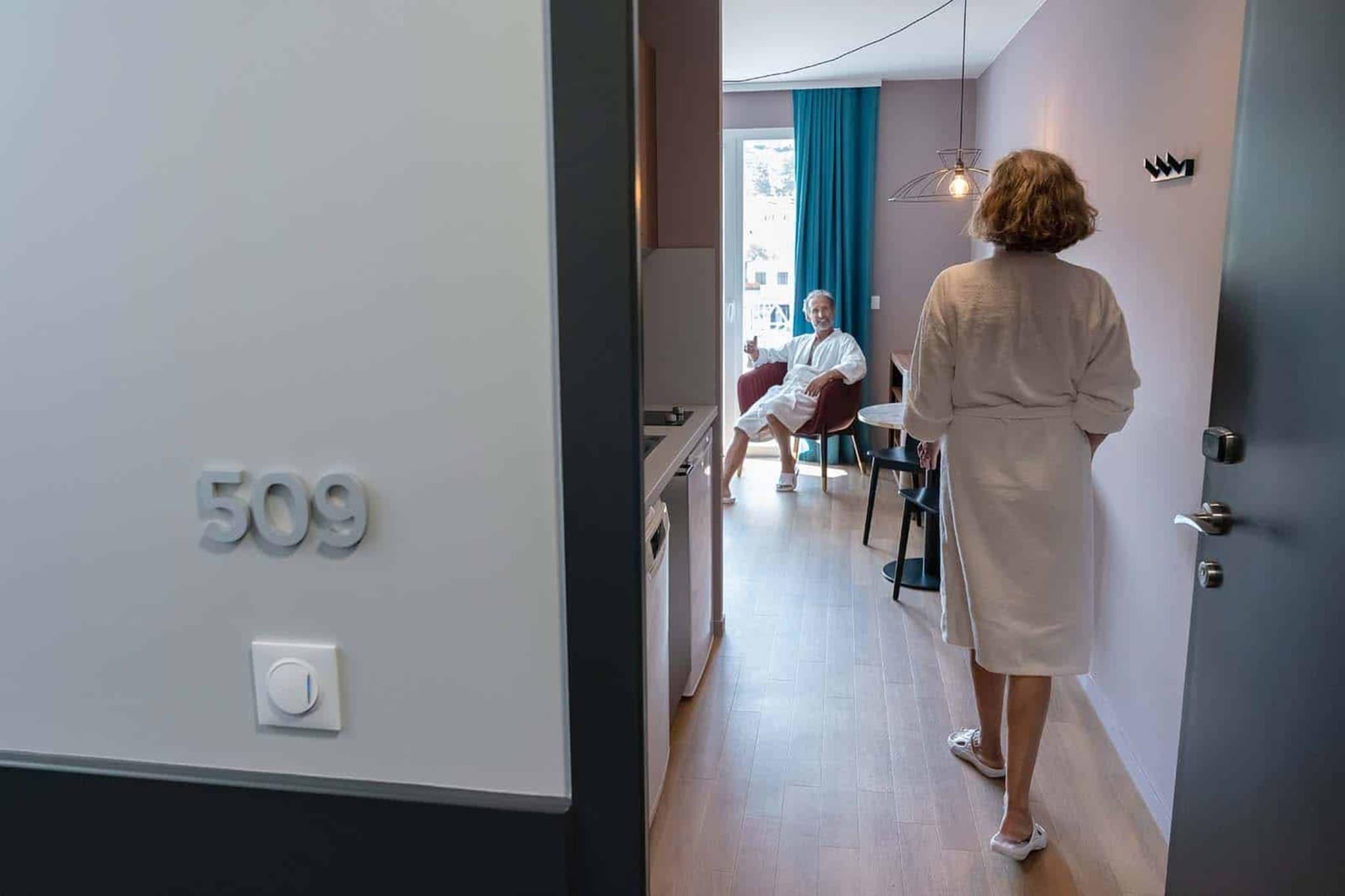 Beliggende mellem by og landskab tilbyder Aïga Resort i Châtel-Guyon en unik blanding af wellness, natur og historie, hvilket gør det til den perfekte destination for afslapning og udforskning. Beliggende ved foden af de majestætiske vulkaner i Auvergne og på UNESCOs verdensarvsliste Chaîne des Puys - Faille de Limagne, er denne charmerende termiske kurby en ideel base for at opdage Auvergnes naturlige vidundere. Dette resort har 90 hyggelige, fuldt udstyrede lejligheder, der tilbyder moderne komfort og direkte adgang til den termiske spa for en foryngende oplevelse. Nyd resortets omfattende wellness-faciliteter, herunder en 150 m² termisk pool, udendørs spabad, hammam, termisk mudderpool, udendørs solarium og et afslapningsrum med sort lys. Adgang til den termiske spa er tilgængelig mod et gebyr, og mindreårige under 16 år er ikke tilladt. Under dit ophold vil du have adgang til en række aktiviteter for enhver smag: fra vandreture, stavgang og mountainbiking til kanosejlads, yoga, qi gong og meditation. Selve byen er livlig med et kasino, teater , caféer og restauranter, alt sammen inden for rækkevidde, men alligevel giver det direkte adgang til uspoleret natur for ultimativ afslapning. Uanset om du er på besøg for en weekendtur eller et længere ophold, lover det en enestående ferie med fokus på sundhed, wellness og den betagende skønhed i Auvergne.