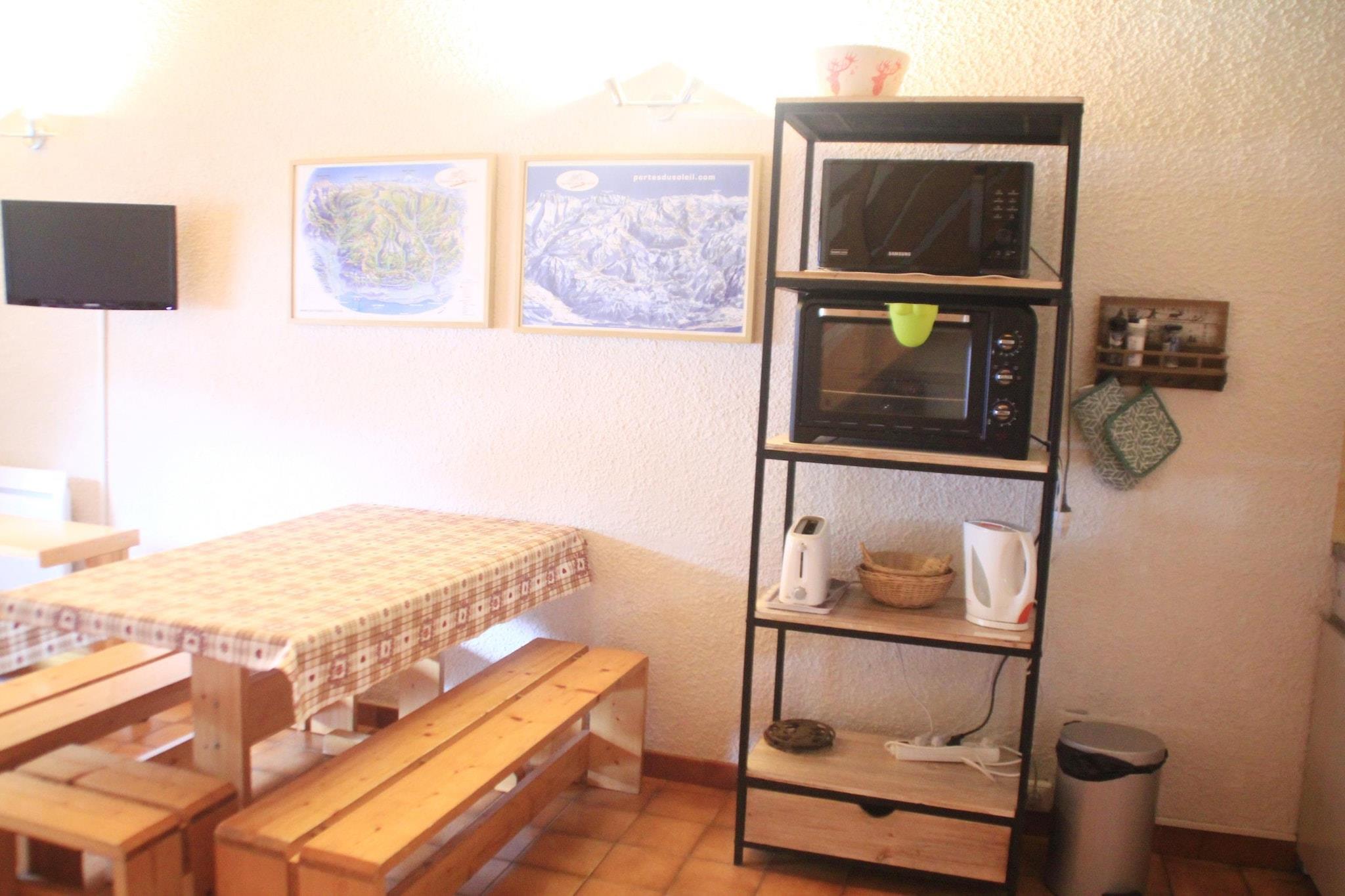 Denne ejendom, en charmerende lejlighed på 42 m², kan komfortabelt rumme op til 5 gæster. Beliggende på 2. sal, det har en stue med et fjernsyn og et hyggeligt, åbent køkken udstyret med vigtige apparater såsom et elektrisk komfur, køleskab, filter kaffemaskine, elkedel, ovn og brødrister. Sovearrangementerne omfatter en sovesofa i stuen, en køjeseng i entréen og en mezzanin med dobbeltseng og enkeltseng. Lejligheden har også en balkon med en naturskøn udsigt over søen. Desværre er der ikke noget skirum, men gæsterne kan benytte den tilgængelige udendørs parkering. Husdyr er ikke tilladt, og adgang til lejligheden sker via elevator. Alpenlake-residensen har en fremragende beliggenhed med nærhed til vigtige attraktioner i området. Svævebanestationen ligger kun 400 meter derfra og giver nem adgang til skiløjperne. Derudover er et gratis shuttle-busstoppested bekvemt placeret i nærheden. For dem, der er interesserede i at shoppe eller spise, ligger butikker og en restaurant kun 100 meter fra lejligheden, hvilket gør det nemt at udforske lokale faciliteter. Lejlighedens badeværelse er udstyret med et badekar og et separat toilet, hvilket giver en behagelig plads til gæsterne. Selvom der ikke er et skab til rådighed for skiudstyr, gør lejlighedens veludstyrede køkken og hyggelige opholdsrum det til et praktisk og indbydende sted at slappe af efter en dag med aktiviteter. Valgfri tjenester, herunder sengelinned, håndklæder og slutrengøring, er tilgængelige mod et ekstra gebyr, hvilket sikrer et problemfrit ophold. Wi-Fi-adgang kan også arrangeres med en miniboksudlejning i receptionen. Bemærk: Turistskatten opkræves på ejendommen og er ikke en del af udlejningen.