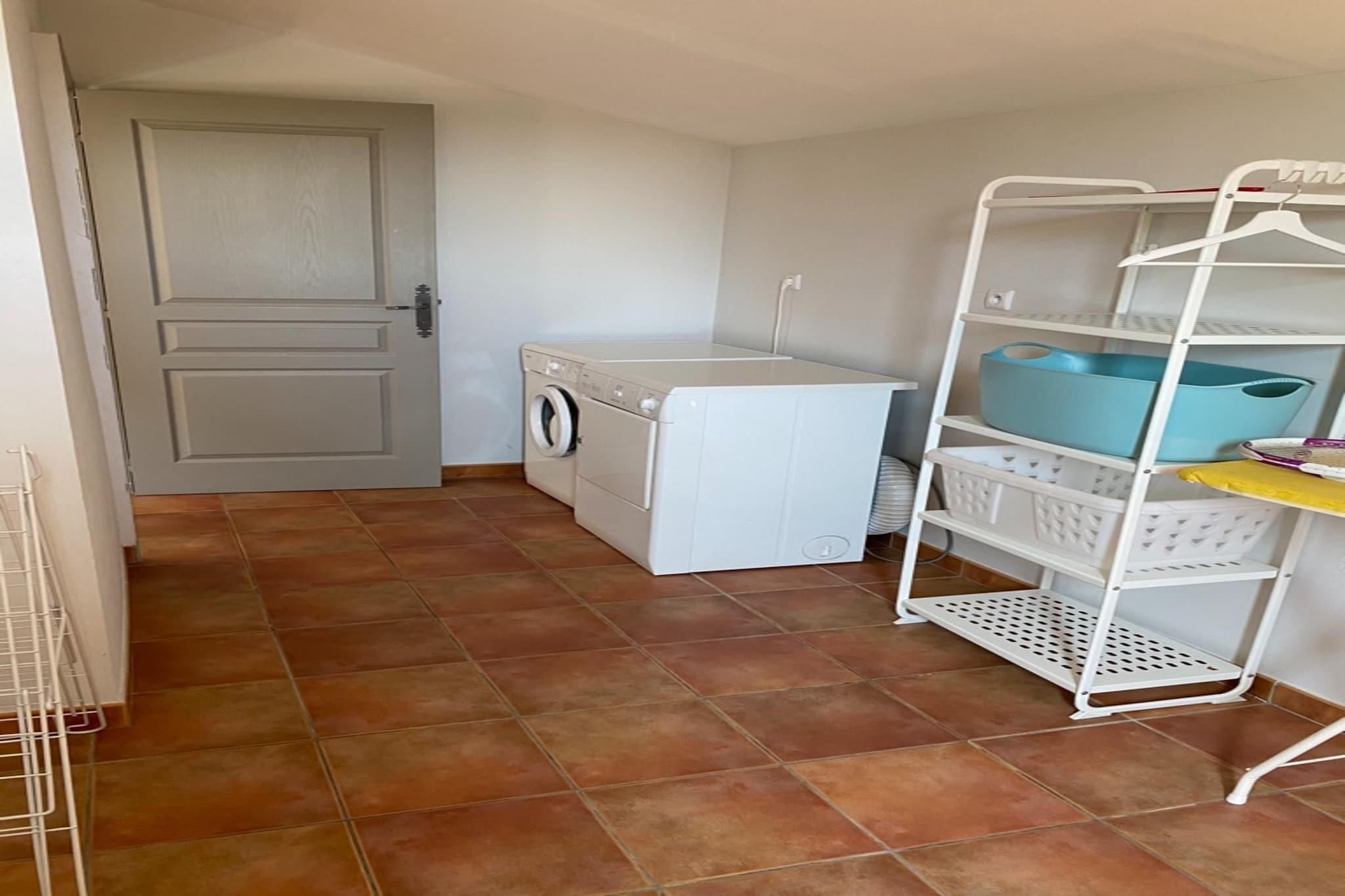 Stueetage: (åbent køkken(komfur(Komfur med fire kogeplader, elektrisk), kaffemaskine, ovn, grill, mikrobølgeovn, opvaskemaskine , køleskab(+ fryser), Blender), stue / spisestue(Fjernsyn(parabol), spisebord(8 personer), pejs, DVD-afspiller), soveværelse(2x enkeltseng), soveværelse(2x enkeltseng), soveværelse(dobbeltseng), soveværelse(dobbeltseng), badeværelse(badekar eller bruser, toilet), badeværelse(badekar eller bruser), badeværelse(badekar eller bruser), toilet, toilet, bryggers(tørretumbler, vaskemaskine), varme(elektrisk), klimaanlæg) terrasse(overdækket, 90 m2), have(privat, delvist indhegnet, 1400 m2), havemøbler, grill, parkering, swimmingpool(privat, 8 x 4 m.), tennisbane(deles med andre gæster, betalt), cykler til rådighed