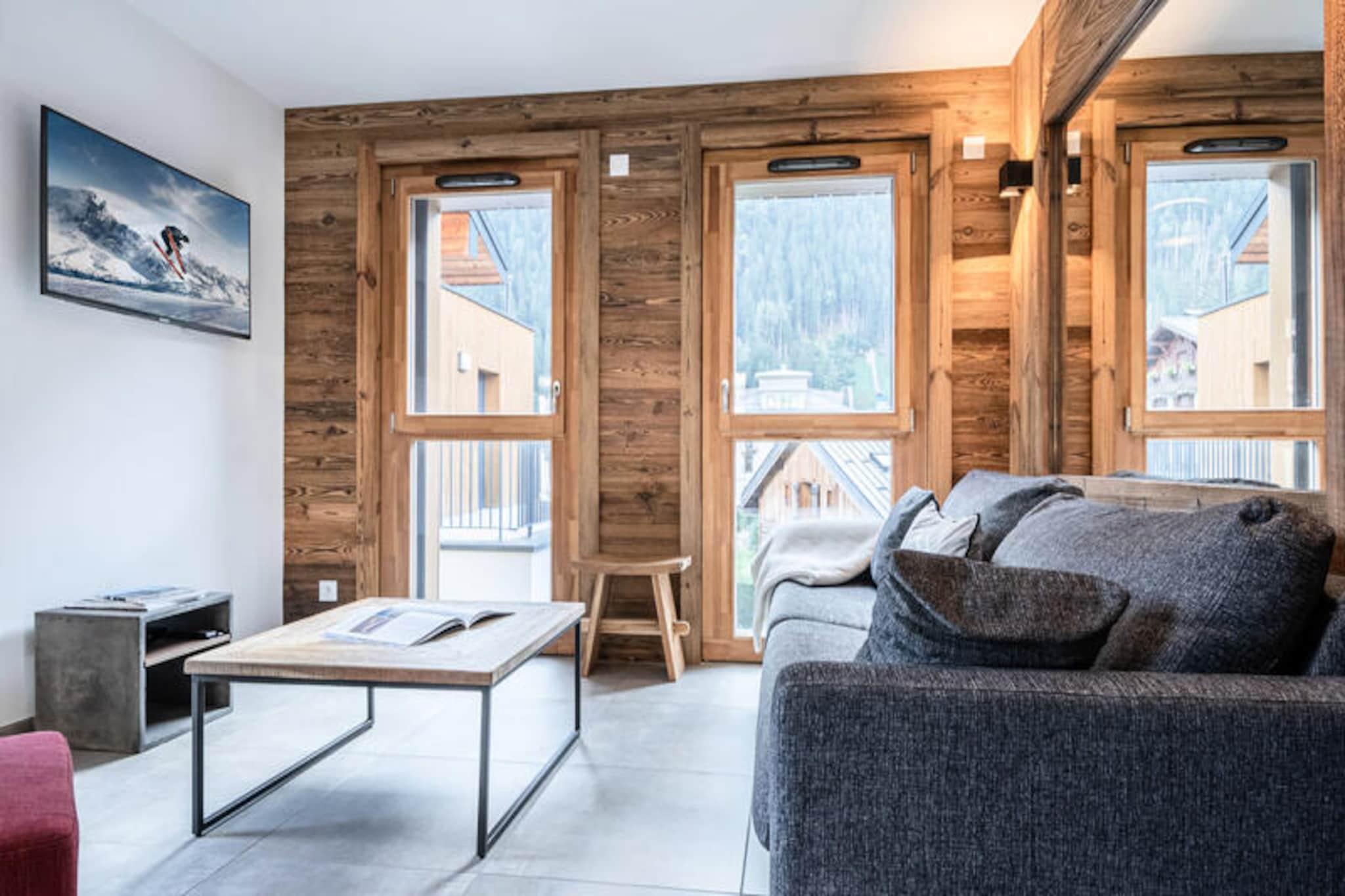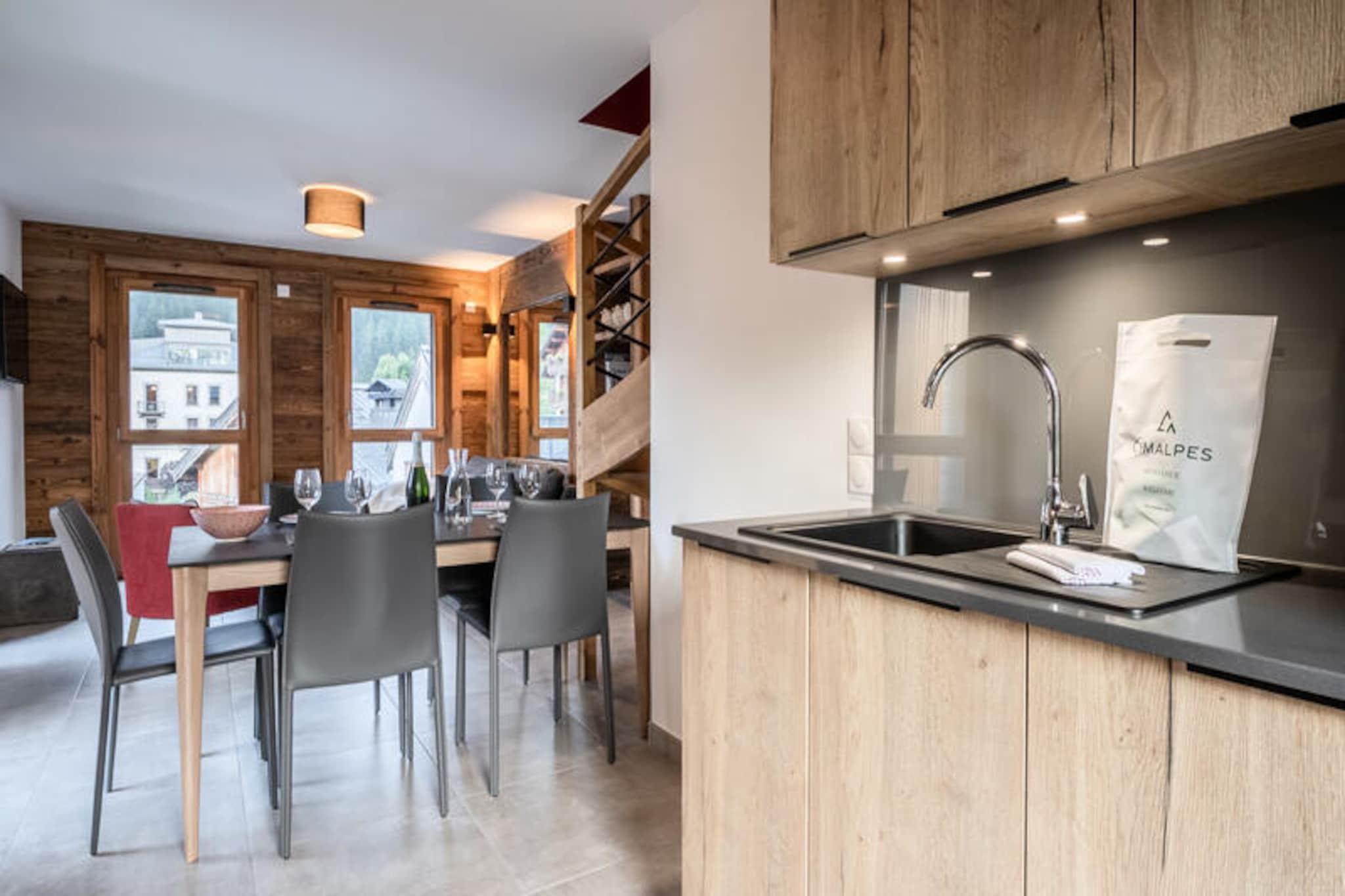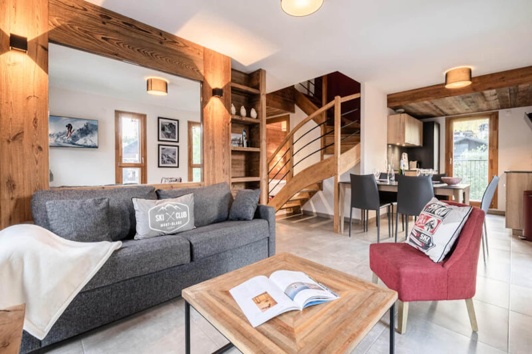 I hjertet af Chamonix, hvor Alpernes charme møder moderne komfort, tilbyder denne 3-stjernede duplexlejlighed et idyllisk tilflugtssted for op til seks gæster. Beliggende i det rolige Lyret-distrikt kombinerer denne bolig ro med bekvemmeligheden ved at være kun få skridt fra Chamonix' pulserende centrum. Fra balkonen kan du nyde de beroligende syn og lyde af Brévent-floden og skabe den perfekte kulisse for din alpine flugt. \n\nLejligheden på 77 m² er fordelt på to etager og er omhyggeligt designet til at imødekomme alle dine behov. Den nederste etage har en hyggelig tv-stue, en spiseplads og et fuldt udstyret åbent køkken med moderne apparater såsom induktionskogeplade, ovn og Nespresso-kaffemaskine. Et luksuriøst soveværelse med dobbeltseng og eget badeværelse, adgang til balkon og et separat toilet fuldender denne etage. Ovenpå finder du et fleksibelt soveværelse med to enkeltsenge, et charmerende værelse med køjeseng og et ekstra brusebad med toilet, hvilket sikrer rigelig plads og privatliv for alle gæster. \n\nMed en privat garage, skirum og Wi-Fi inkluderet er denne ejendom perfekt udstyret til både vinter- og sommereventyr. Busstoppestedet og togstationen ligger kun en kort gåtur væk, hvilket giver nem adgang til de omkringliggende skiløjper, vandrestier og den ikoniske Aiguille du Midi. Efter en dag med udforskning kan du vende tilbage til din komfortable lejlighed, hvor sengene er redt ved ankomst, og slutrengøring er sørget for. \n\nUanset om du er her for at stå på ski, vandre eller blot nyde den betagende udsigt, lover denne lejlighed i Chamonix en uforglemmelig alpin oplevelse. Med sin blanding af bekvemmelighed, komfort og naturlig skønhed er det den perfekte base for din bjergferie.