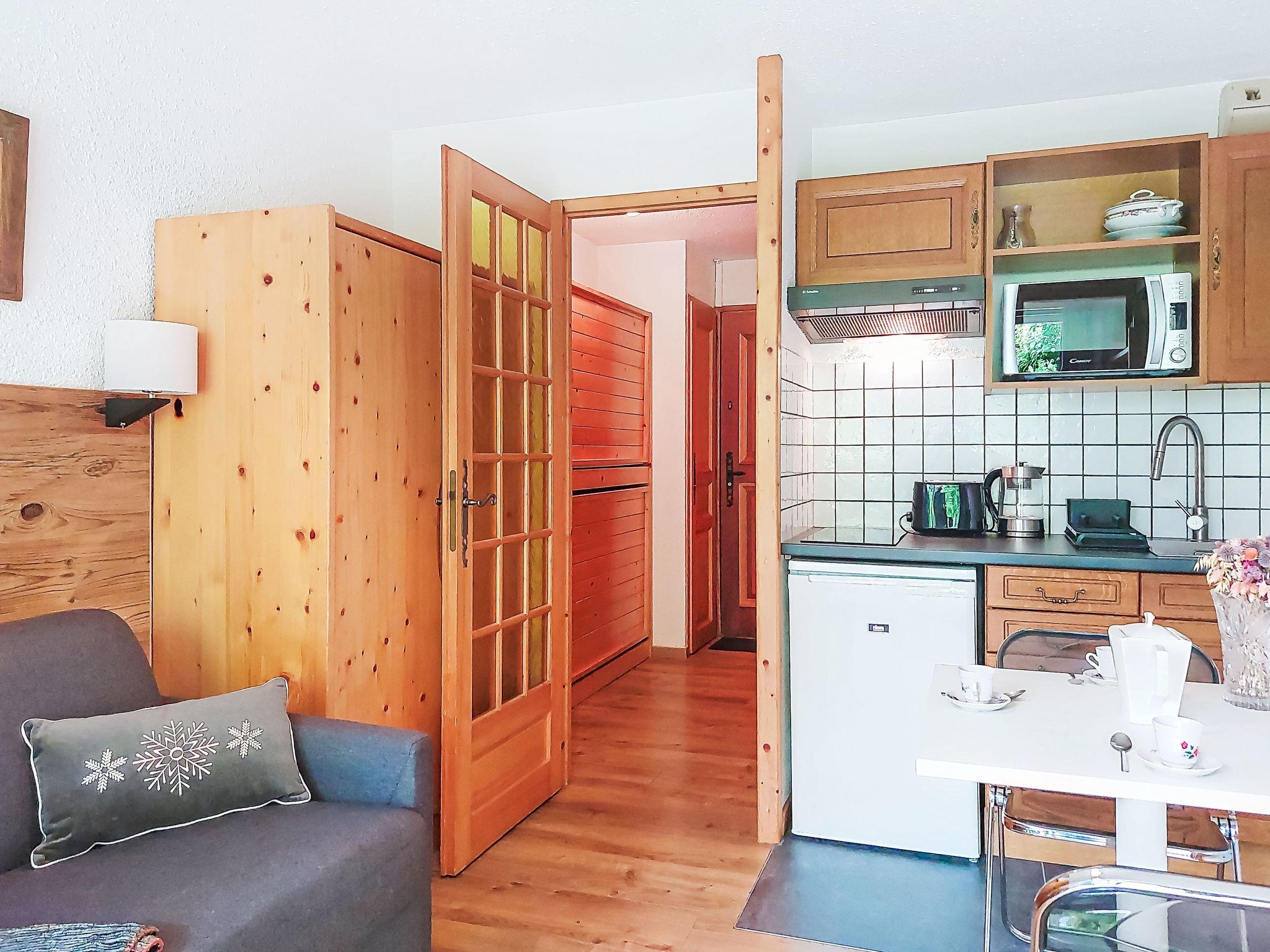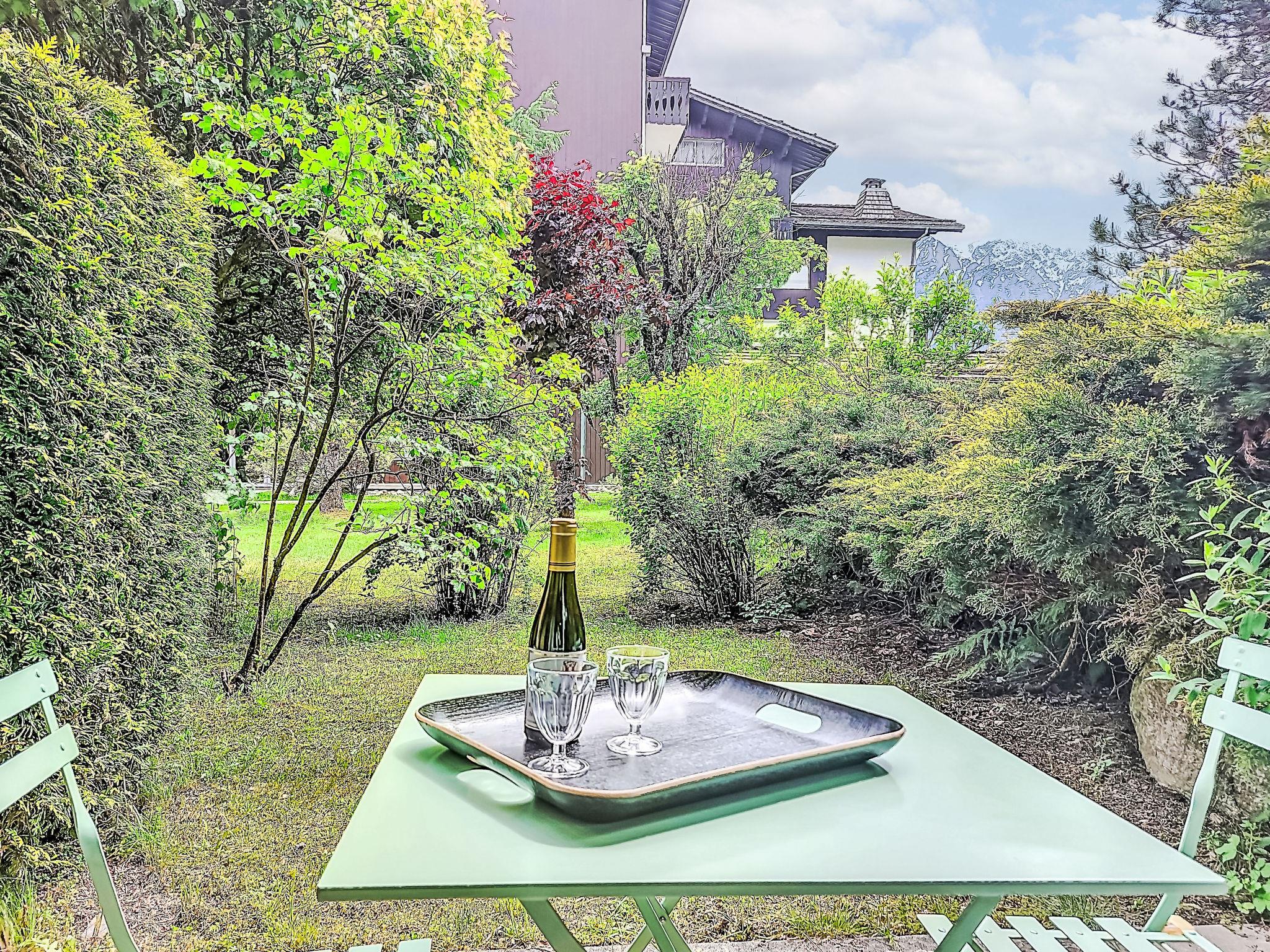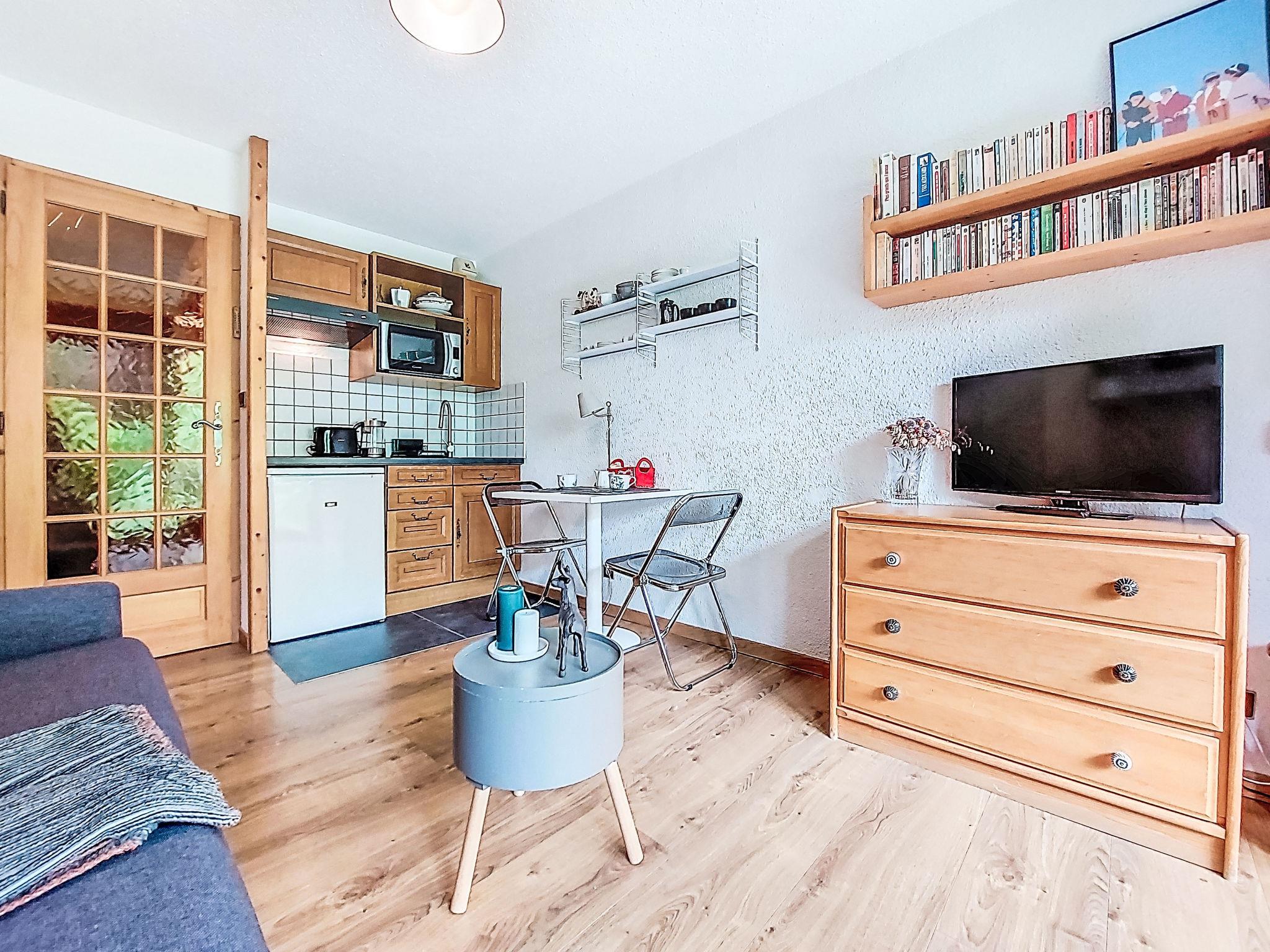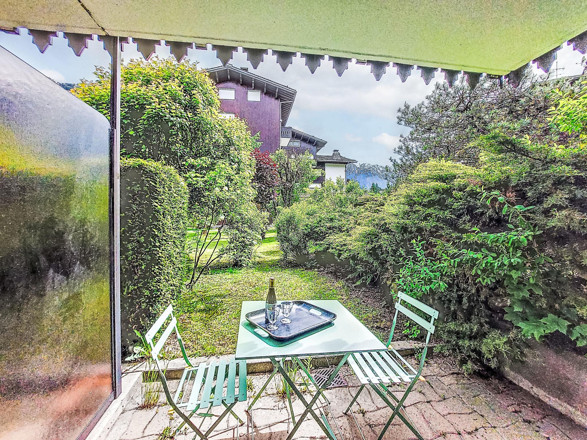 1-room studio 21 m2, on the ground floor, south facing position. Living/dining room with 1 double sofabed (160 cm, length 190 cm), TV. Exit to the terrace, to the patio. Entrance hall with 1 wall-trunk bed (80 cm, length 190 cm). Kitchenette (4 hot plates, oven, kettle, electric coffee machine). Bath/WC. Electric heating. Terrace, patio. Terrace furniture. Beautiful view of the mountains. Facilities: washing machine. Internet (WiFi, extra). Please note: non-smokers only, no parking. TV only FR. Smoke alarm. 74056 000385 ZT