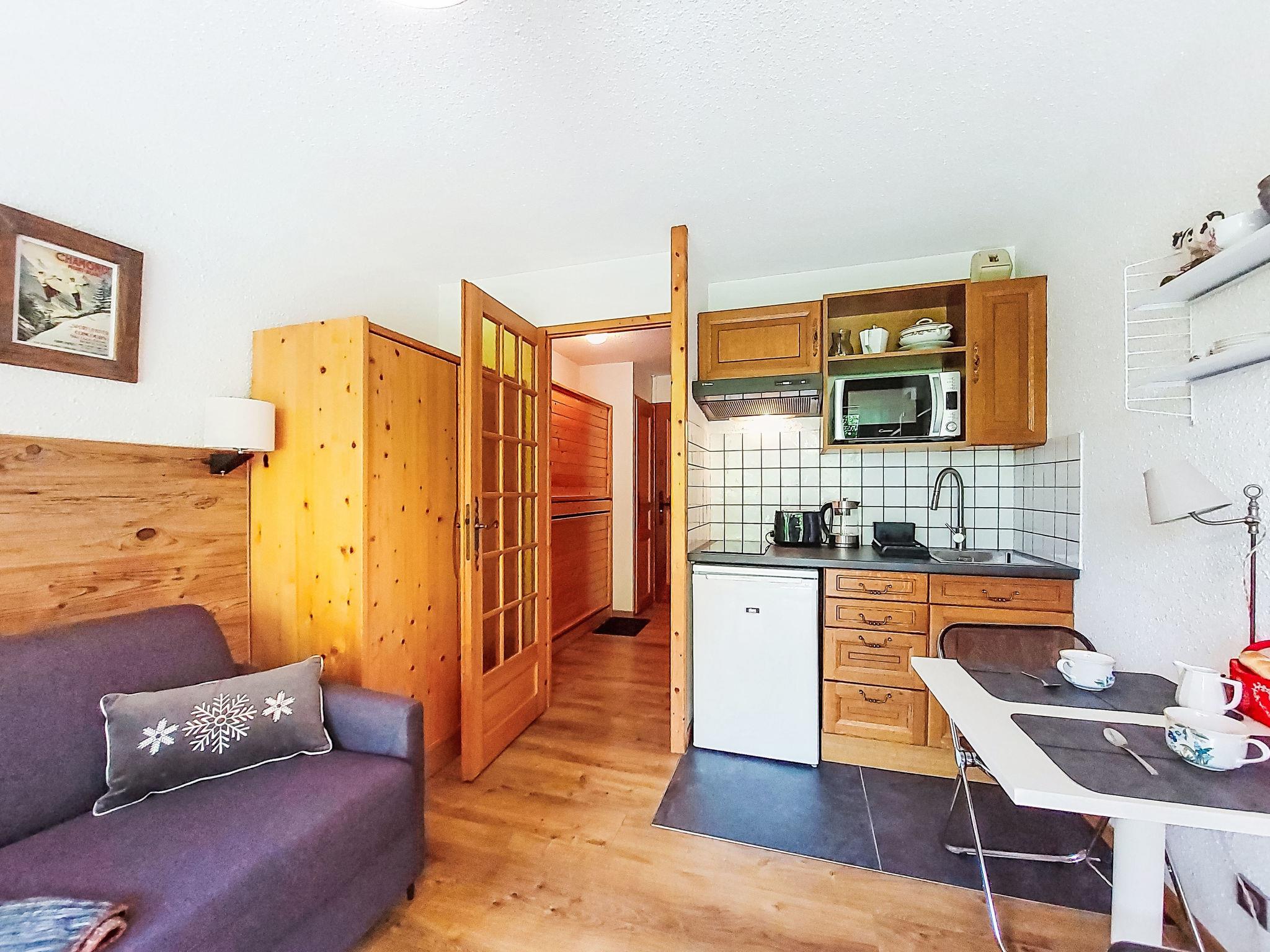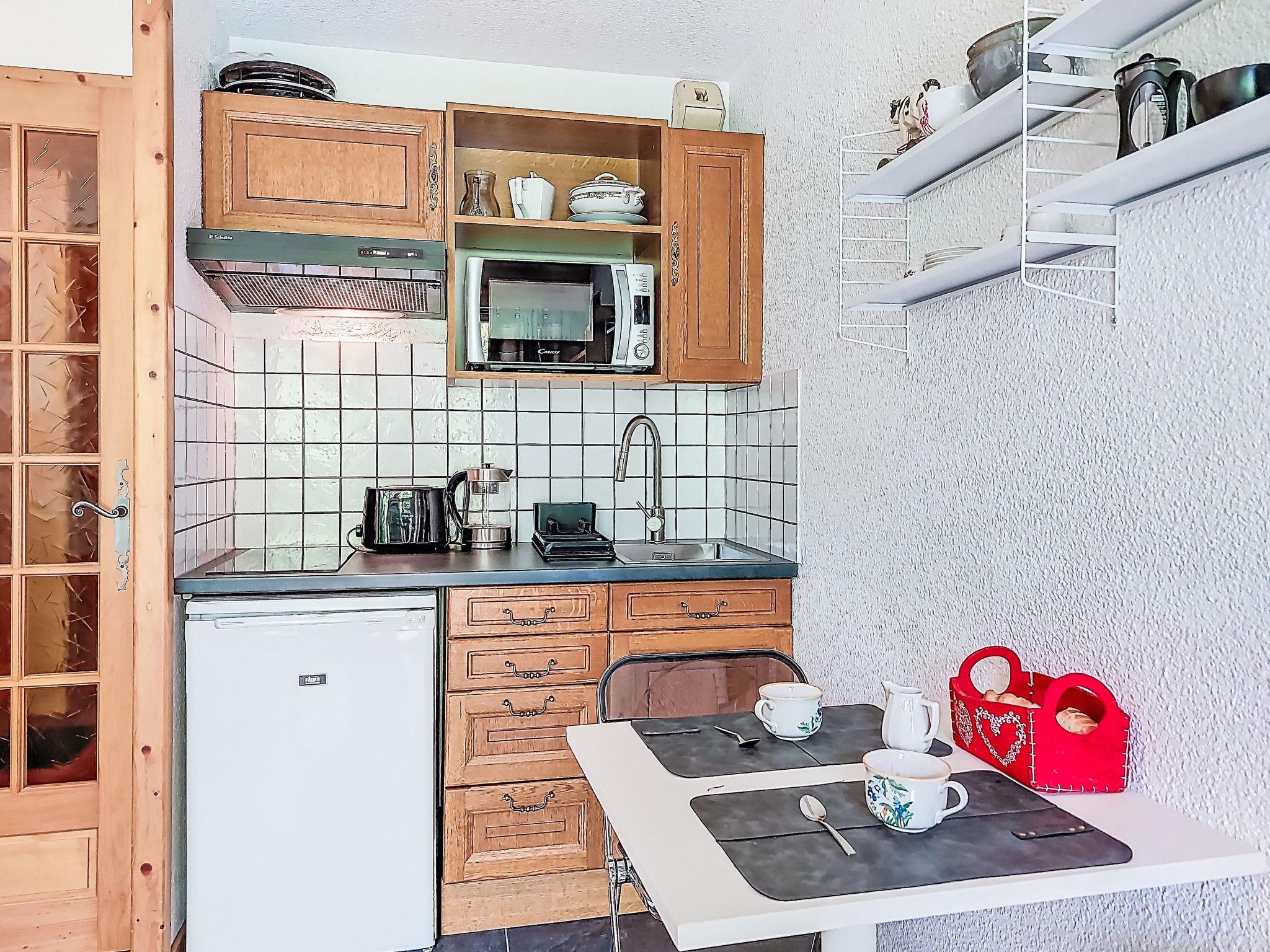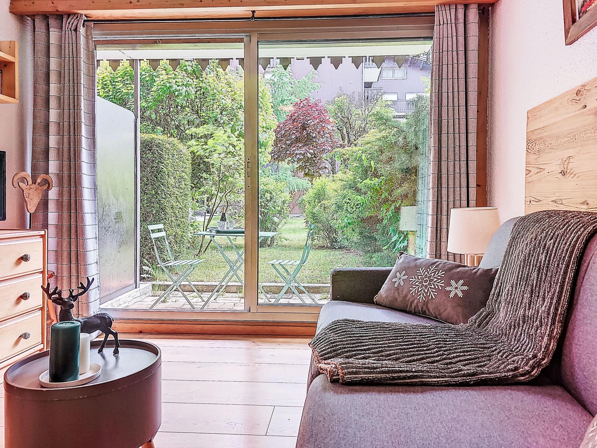 1-room studio 21 m2, on the ground floor, south facing position. Living/dining room with 1 double sofabed (160 cm, length 190 cm), TV. Exit to the terrace, to the patio. Entrance hall with 1 wall-trunk bed (80 cm, length 190 cm). Kitchenette (4 hot plates, oven, kettle, electric coffee machine). Bath/WC. Electric heating. Terrace, patio. Terrace furniture. Beautiful view of the mountains. Facilities: washing machine. Internet (WiFi, extra). Please note: non-smokers only, no parking. TV only FR. Smoke alarm. 74056 000385 ZT