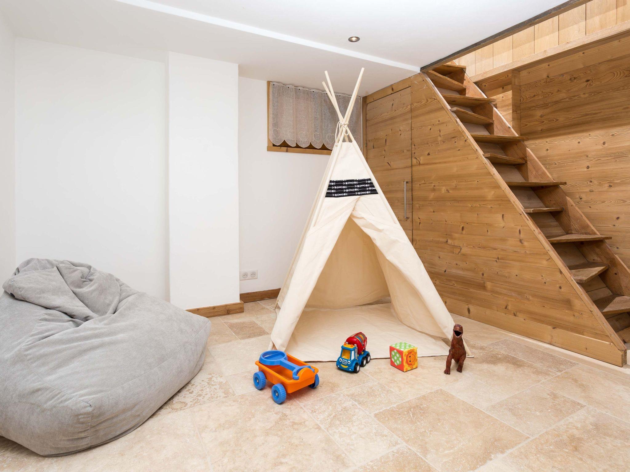Chalet des Souchettes enjoys several interesting spaces for you to explore, including a master king bedroom in the eaves, with its own staircase access and ensuite bathroom. Additionally, the lower ground floor has a great teens' bunk room with built-in, quad bunk beds, and an adjacent snug with teepee and bean bag as well as a double bedroom. All this is accessed via a clever ladder staircase (see photos), best suited to older kids and agile adults. Less mobile family members can comfortably use the bedrooms on the ground floor or the master bedroom.