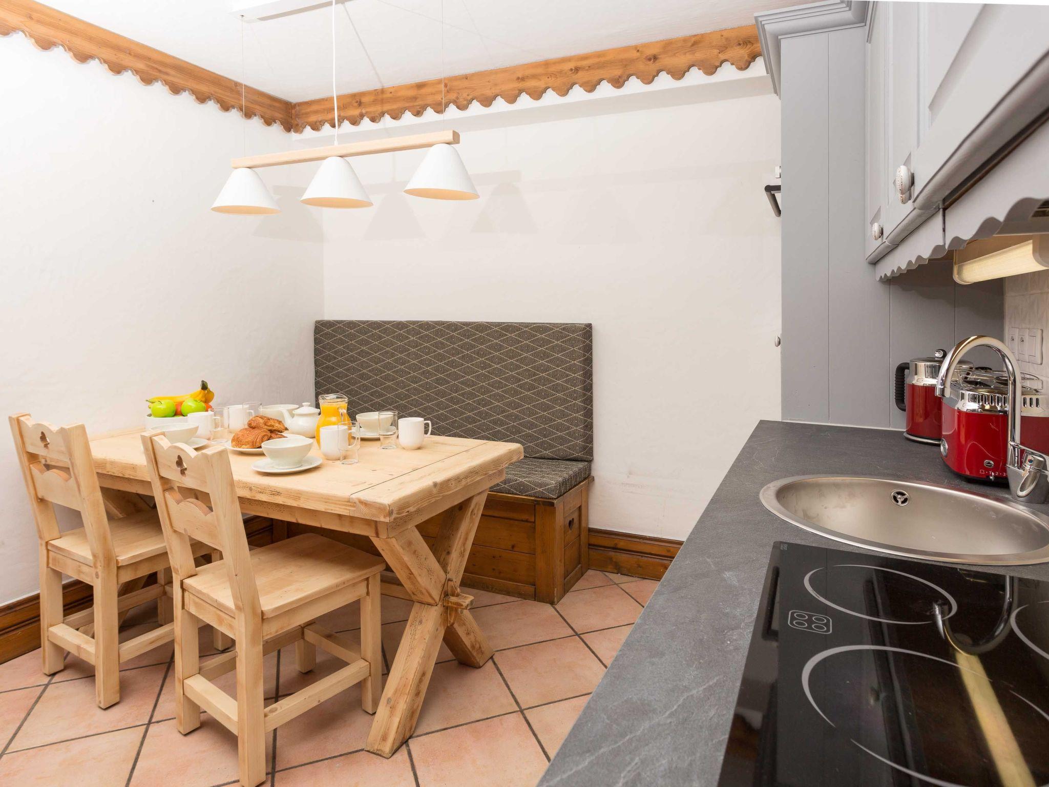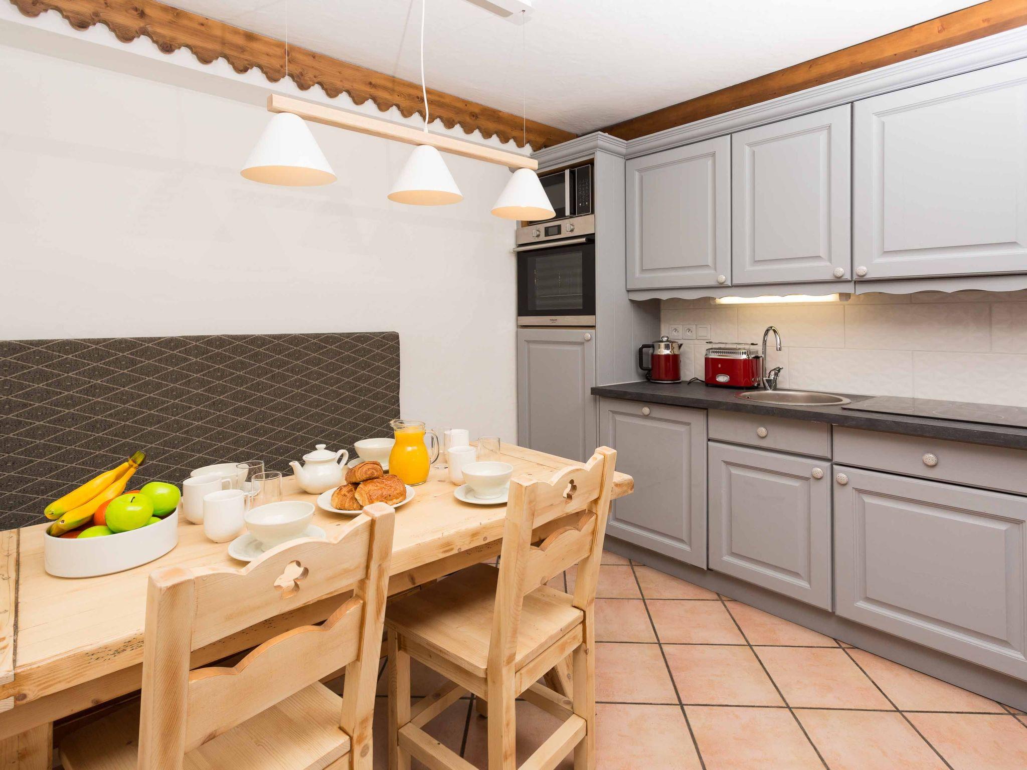Ginabelle 14 apartment is a central, 2 bedroom apartment which benefits from luxury holiday rentals amenities of swimming pool, sauna, hammam and gym access within the residence. The apartment has one master super-king bedroom with ensuite bathroom, as well as a second bedroom which can be made as a twin room or super-king. In addition there is a family bathroom with bath and overhead shower, as well as a second separate WC. In the living area are a comfy sofa, TV and games, as well as doors which open out onto a spacious balcony with sweeping views of Les Planards ski area and up the valley towards Le Tour. The adjoining dining area in Ginabelle 14 apartment has seating for 6 with three dining chairs and a bench along one side, while the kitchenette is equipped with more luxury holiday rental essentials, including dishwasher and Nespresso coffee machine. The apartment also benefits from underground parking, private ski locker and wifi internet access.