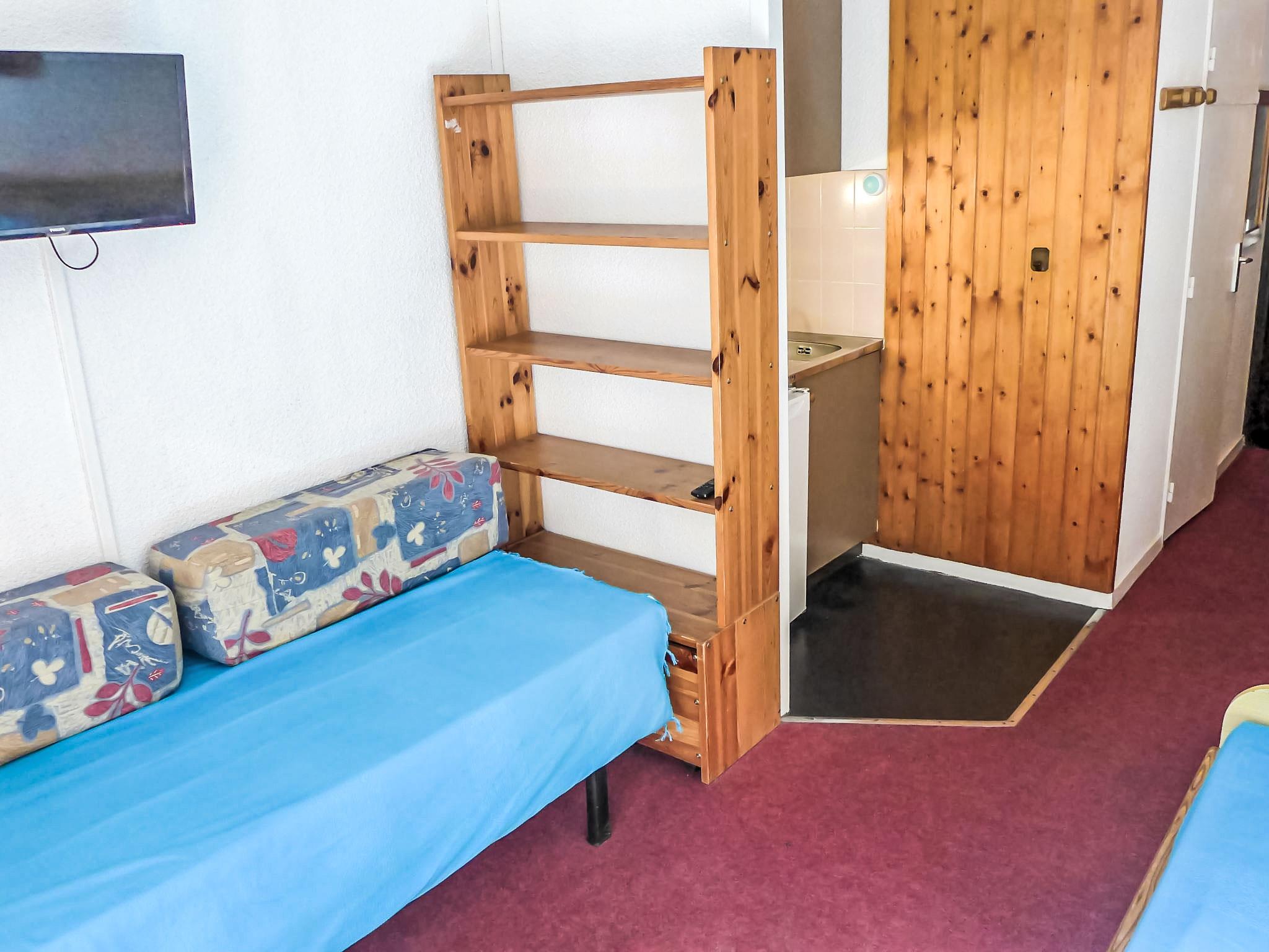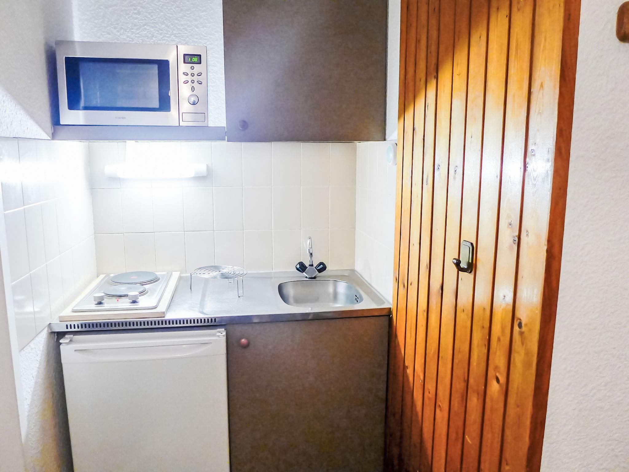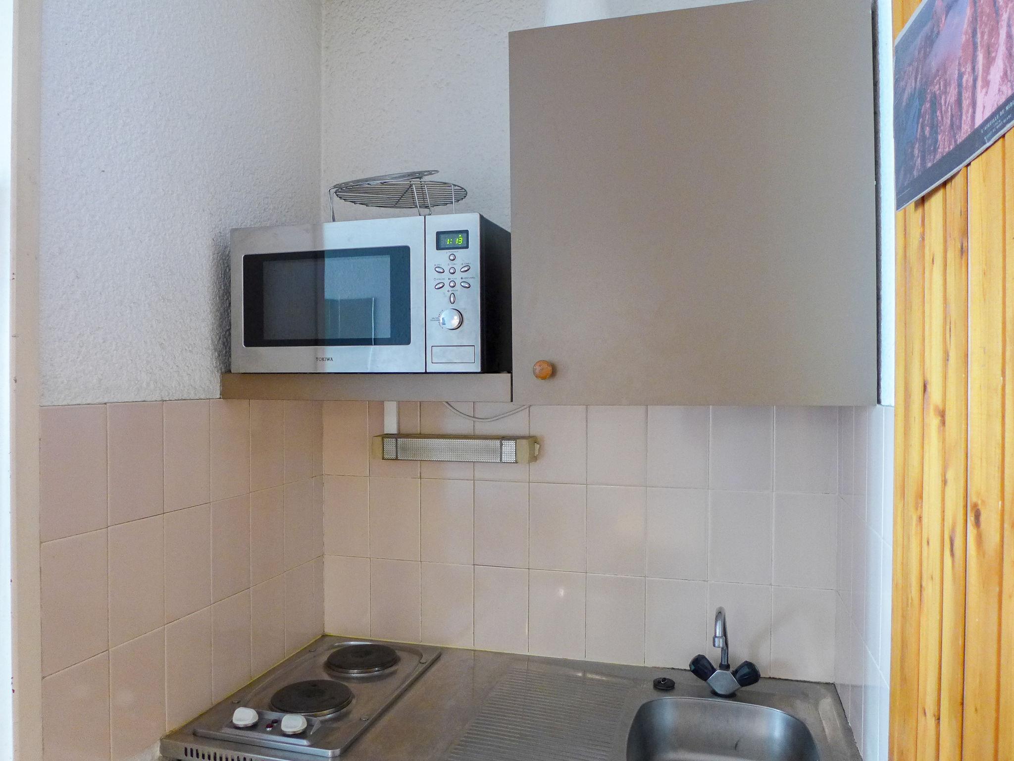 1-room apartment 18 m2 on 3rd floor. Very simple furnishings: living/dining room with 2 beds and TV. Exit to the balcony. Kitchenette (2 hot plates, oven, kettle, electric coffee machine). Bath/WC. Electric heating. Balcony, south facing position. View of the mountains. Facilities: Internet (WiFi, extra). Please note: no parking. Maximum 1 pet/ dog allowed. TV only FR. Smoke alarm. 74056 001713 Y4