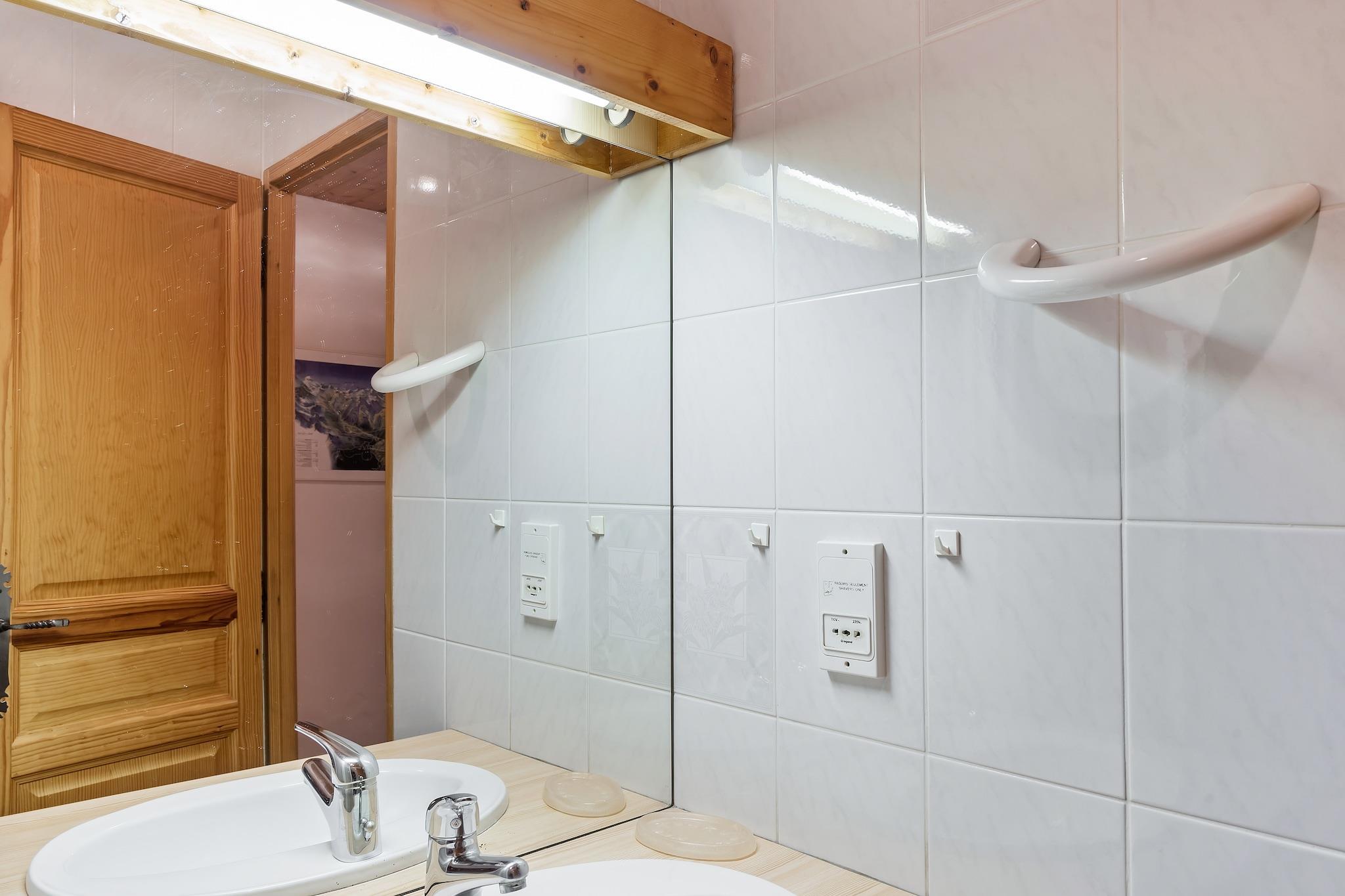 På 1. etage: (Stue(dobbeltsovesofa, Fjernsyn, sofahjørne), Køkken(komfur(glaskeramisk), ovn, mikrobølgeovn, opvaskemaskine ), soveværelse(dobbeltseng), soveværelse(dobbeltseng), soveværelse(dobbeltseng, køjeseng), badeværelse(bruser, håndvask, toilet), badeværelse(badekar, håndvask)) skiopbevaring, vaskemaskine, balkon, varme(elektrisk), havemøbler
