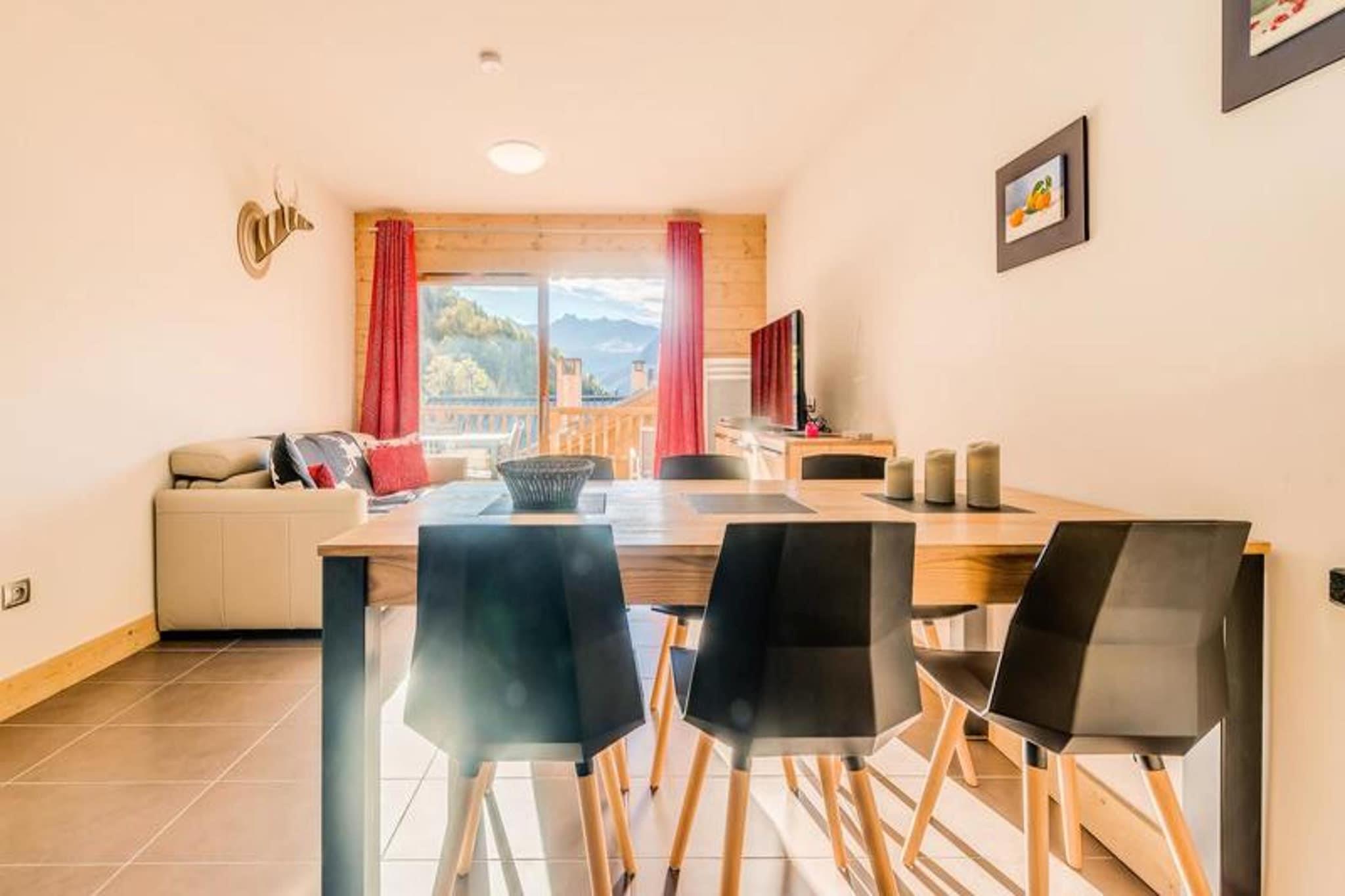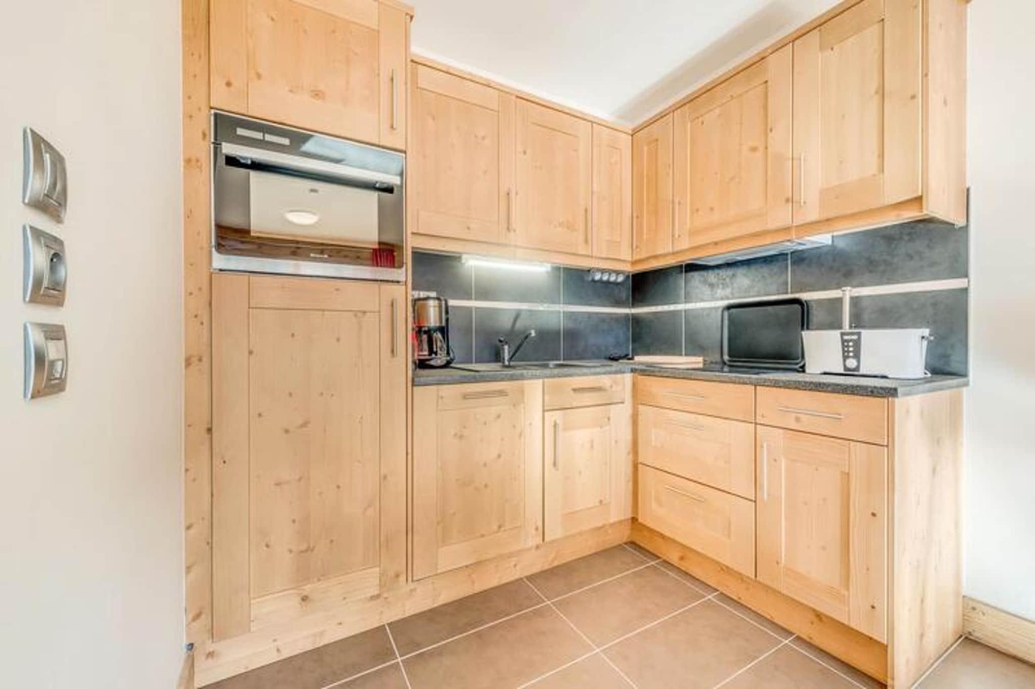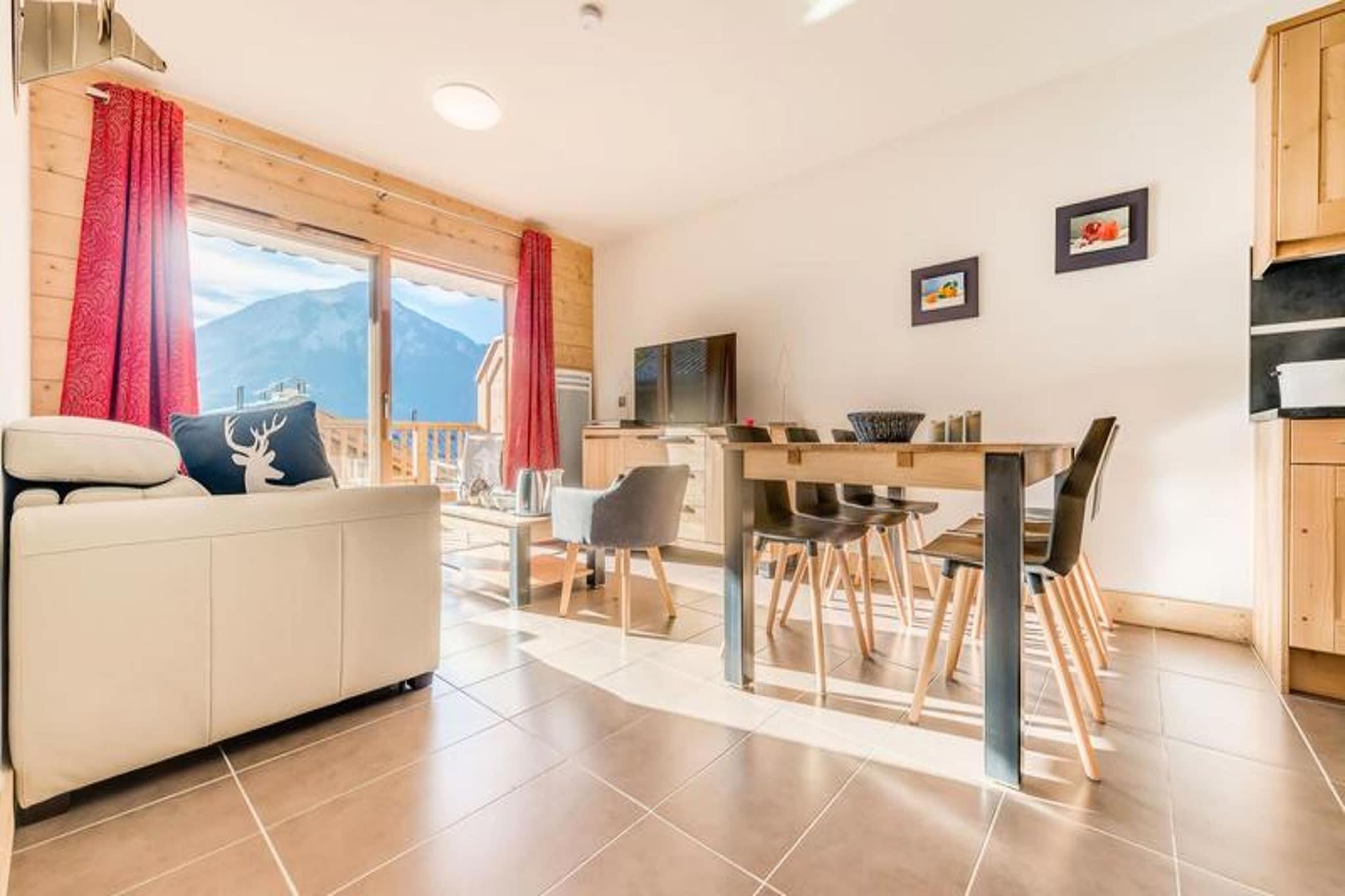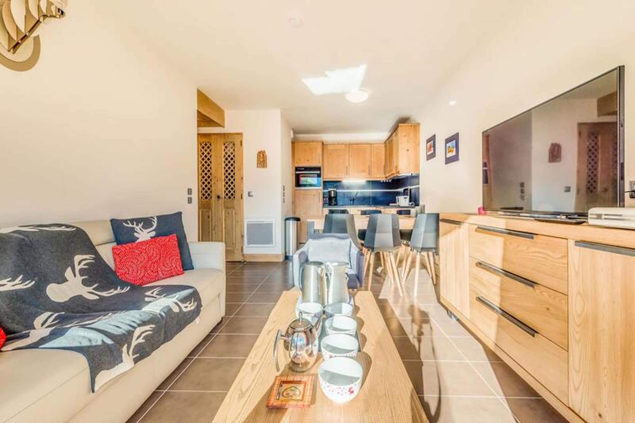 Denne rummelige lejlighed, som er en del af en hotelbolig med to hytter, tilbyder et behageligt ophold for op til 6 personer. Det har 2 soveværelser med dobbeltsenge, opholdsstue med sovesofa og 2 badeværelser. Nyd bekvemmeligheden ved et fuldt udstyret køkken med moderne apparater såsom en opvaskemaskine, Nespresso kaffemaskine og induktionskomfur. Lejligheden har en stor syd- og vestvendt altan med en fantastisk udsigt over landsbyen og Vanoise-bjergene. Wi-Fi, sengetøj, håndklæder og slutrengøring (undtagen køkkenet) er inkluderet i pakken. Boligen er ideelt beliggende, kun 20 meter fra gondolen og skiundervisning, hvilket giver nem adgang til pisterne. Hjertet af landsbyen og dens butikker ligger kun 100 meter væk, og tilbyder en række caféer, restauranter og lokale markeder. Det omkringliggende område er perfekt til at stå på ski og udforske Alpernes naturlige skønhed. Yderligere faciliteter omfatter en vaskemaskine-tørretumbler, skiskab og et badeværelse med både bruser og badekar. For familier er en barneseng og høj stol til rådighed efter anmodning. Denne lejlighed er ikke-ryger, og kæledyr er ikke tilladt, hvilket sikrer et fredeligt ophold.