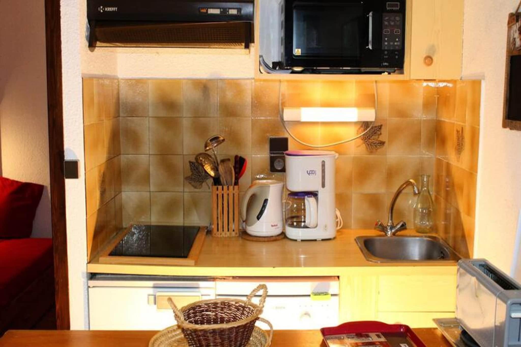Denne hyggelige studiolejlighed er perfekt til 3 personer og tilbyder en sydøstvendt balkon med uhindret udsigt over landsbyen og de omkringliggende bjerge. Lejligheden indeholder en lav seng og en ekstra seng i SNCF-stil samt en sovesofa til 2 personer i opholdsområdet. Det er en ikke-ryger enhed, og kæledyr er ikke tilladt. Der kræves et depositum på EURO300 ved indtjekning. Lejligheden ligger ved foden af ??pisterne, kun 100 meter fra gondolafgangen og ESF, med butikker kun 150 meter væk. Den fantastiske udsigt over landsbyen og bjergene giver fredelige og naturskønne omgivelser, mens den bekvemme nærhed til skiløb og landsbyfaciliteter gør dette til en ideel base for at udforske området. Lejligheden har fuldt udstyret tekøkken med opvaskemaskine, ovn, elektrisk kogeplade og køleskab. Badeværelset har badekar og separat toilet. Yderligere tjenester tilgængelige mod et gebyr inkluderer Wi-Fi, babyudstyr og slutrengøring. Lagner, håndklæder og sengetøj kan lejes, hvilket sikrer et behageligt og bekvemt ophold.