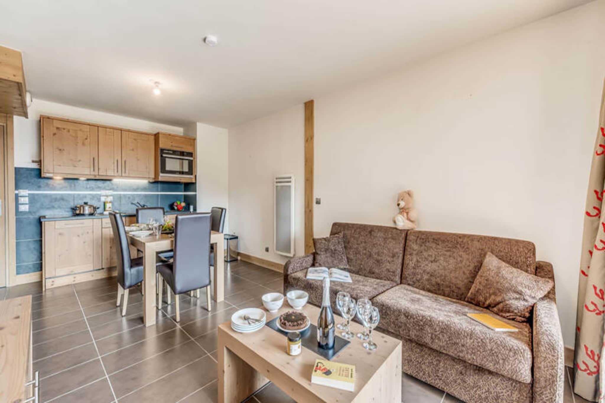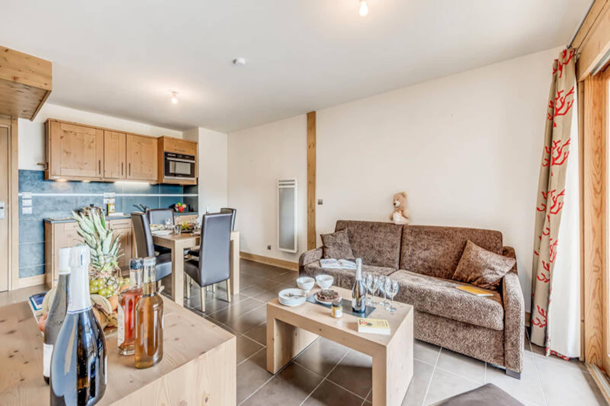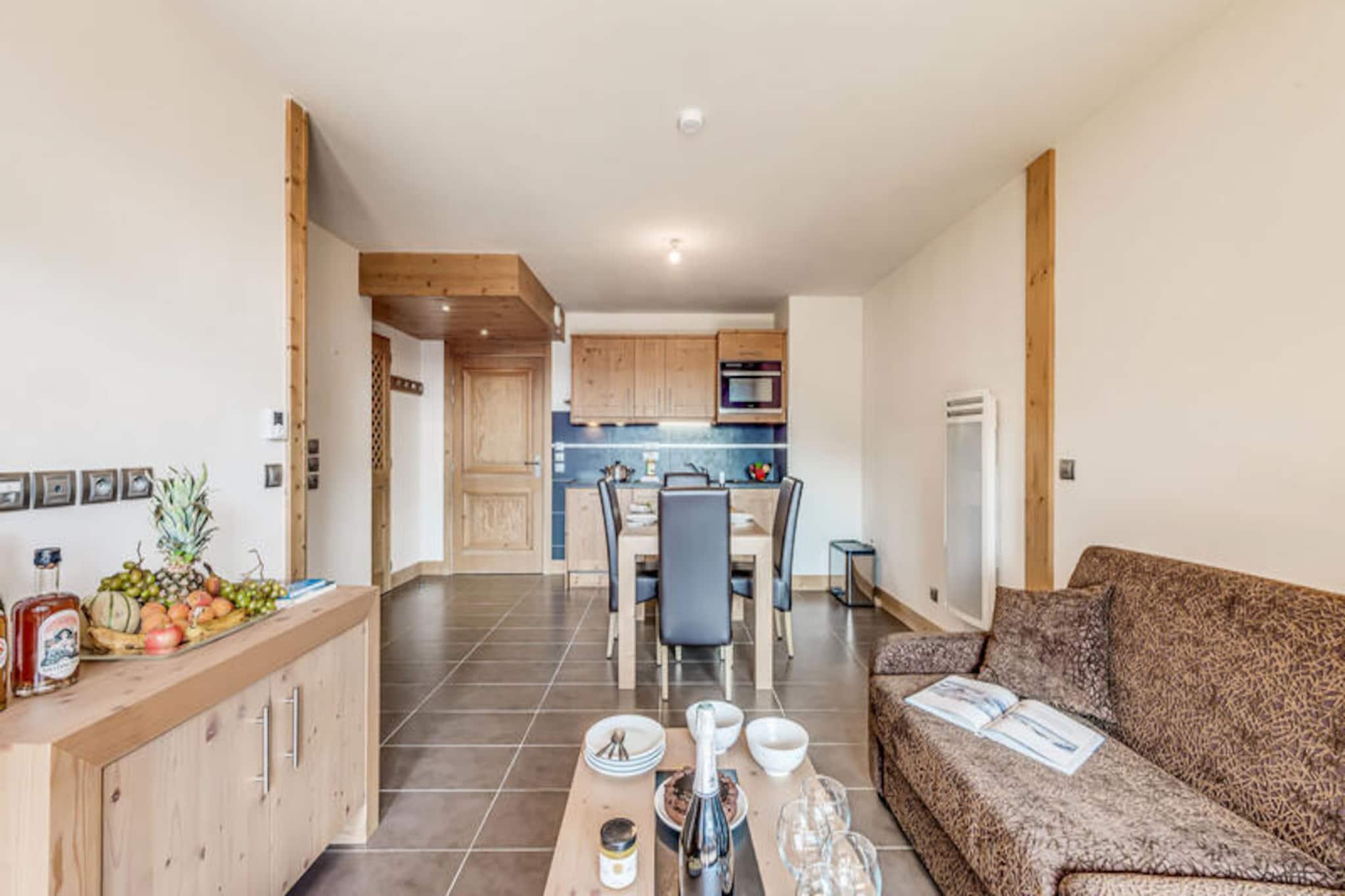 I den maleriske landsby Champagny-en-Vanoise, hvor charmen fra de franske alper møder moderne komfort, ligger den elegante residens Les Balcons Étoilés. Kun 20 meter fra svævebanen og skiskolen og en kort gåtur på 100 meter til landsbyens centrum tilbyder denne ejendom en uovertruffen beliggenhed for både vintersportsentusiaster og sommereventyrere. Fra din sydvendte terrasse kan du nyde den betagende udsigt over Vanoise-bjergene og den maleriske landsby nedenfor, hvilket skaber den perfekte kulisse for en mindeværdig alpeflugt. \n\nDenne lejlighed i stueetagen, omhyggeligt designet til op til fire gæster, kombinerer funktionalitet med hyggelig elegance. Soveværelset har en luksuriøs dobbeltseng og rigelig opbevaringsplads, mens stuen tilbyder en komfortabel sovesofa, der kan laves om til to enkeltsenge. Det fuldt udstyrede køkken med køleskab, kombinationsovn, keramisk kogeplade og opvaskemaskine gør madlavning til en leg. Efter en dag med udforskning kan du slappe af i det moderne badeværelse med bruseniche og håndklædetørrer eller slappe af i den indbydende lounge med fladskærms-tv og dvd-afspiller. Den private balkon, møbleret med havemøbler, er det ideelle sted at nyde din morgenkaffe eller et glas vin om aftenen.\n\nLes Balcons Étoilés sikrer et problemfrit ophold med inkluderede hoteltjenester såsom Wi-Fi, sengelinned, håndklæder og slutrengøring. For ekstra bekvemmelighed har boligen en elevator, private skibokse og en vaskemaskine/tørretumbler i lejligheden. Landsbyen Champagny-en-Vanoise tilbyder en dejlig blanding af butikker, restauranter og kulturelle oplevelser, mens det nærliggende Paradiski-område giver adgang til skiløb, vandreture og cykelstier i verdensklasse.\n\nUanset om du søger spændende udendørs eventyr eller et roligt tilflugtssted i hjertet af Alperne, lover denne bolig en uforglemmelig oplevelse. Lad de majestætiske tinder i Vanoise-bjergene inspirere din næste ferie.