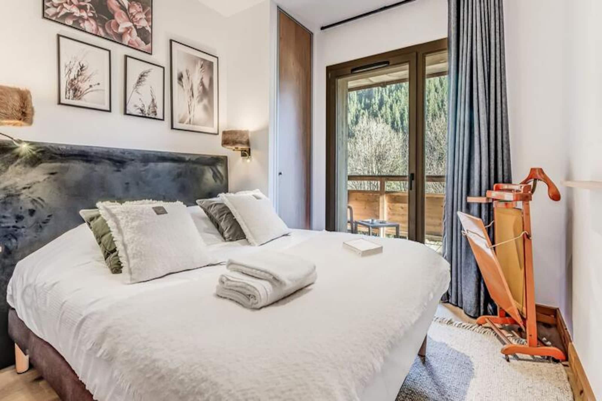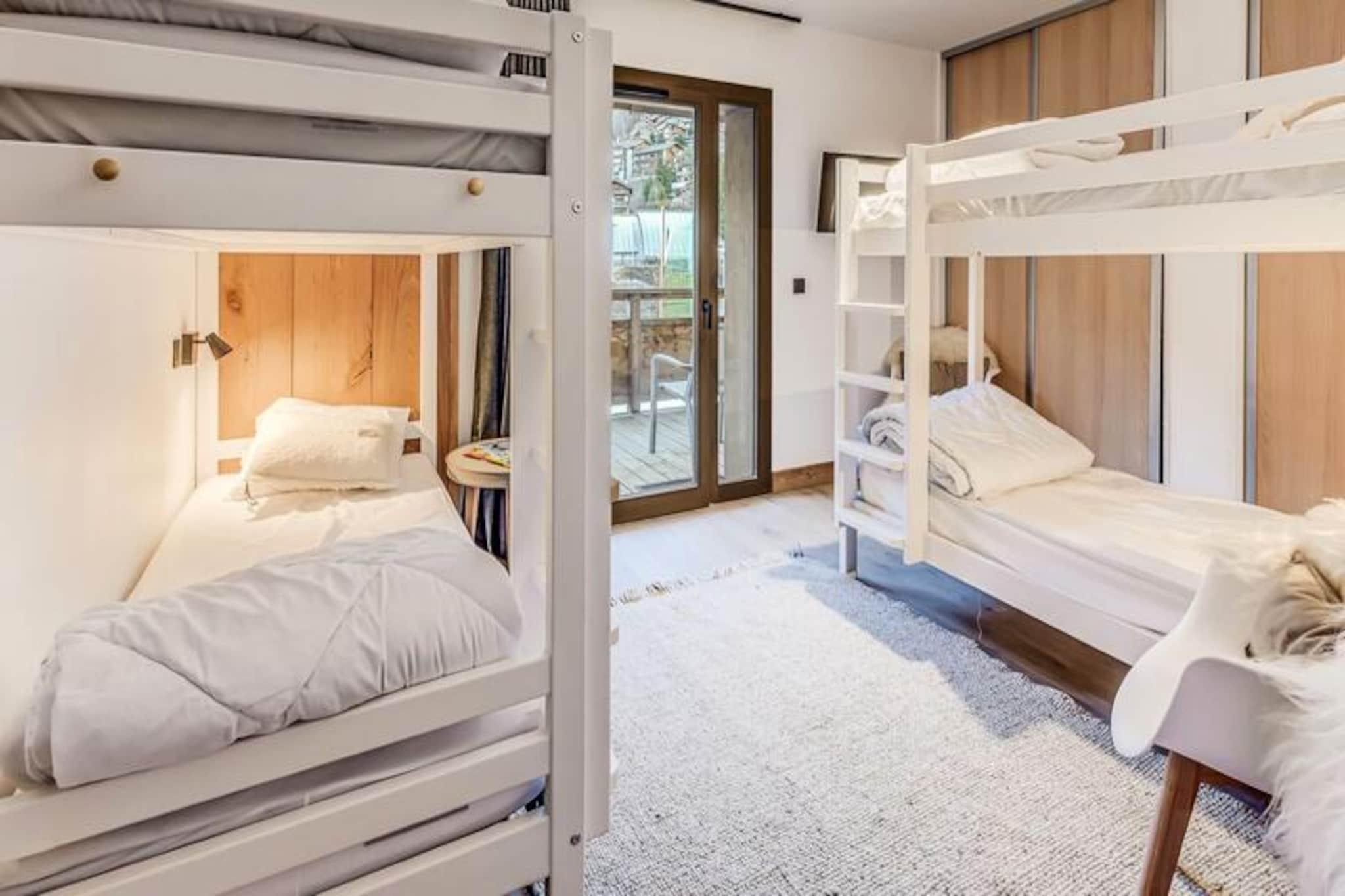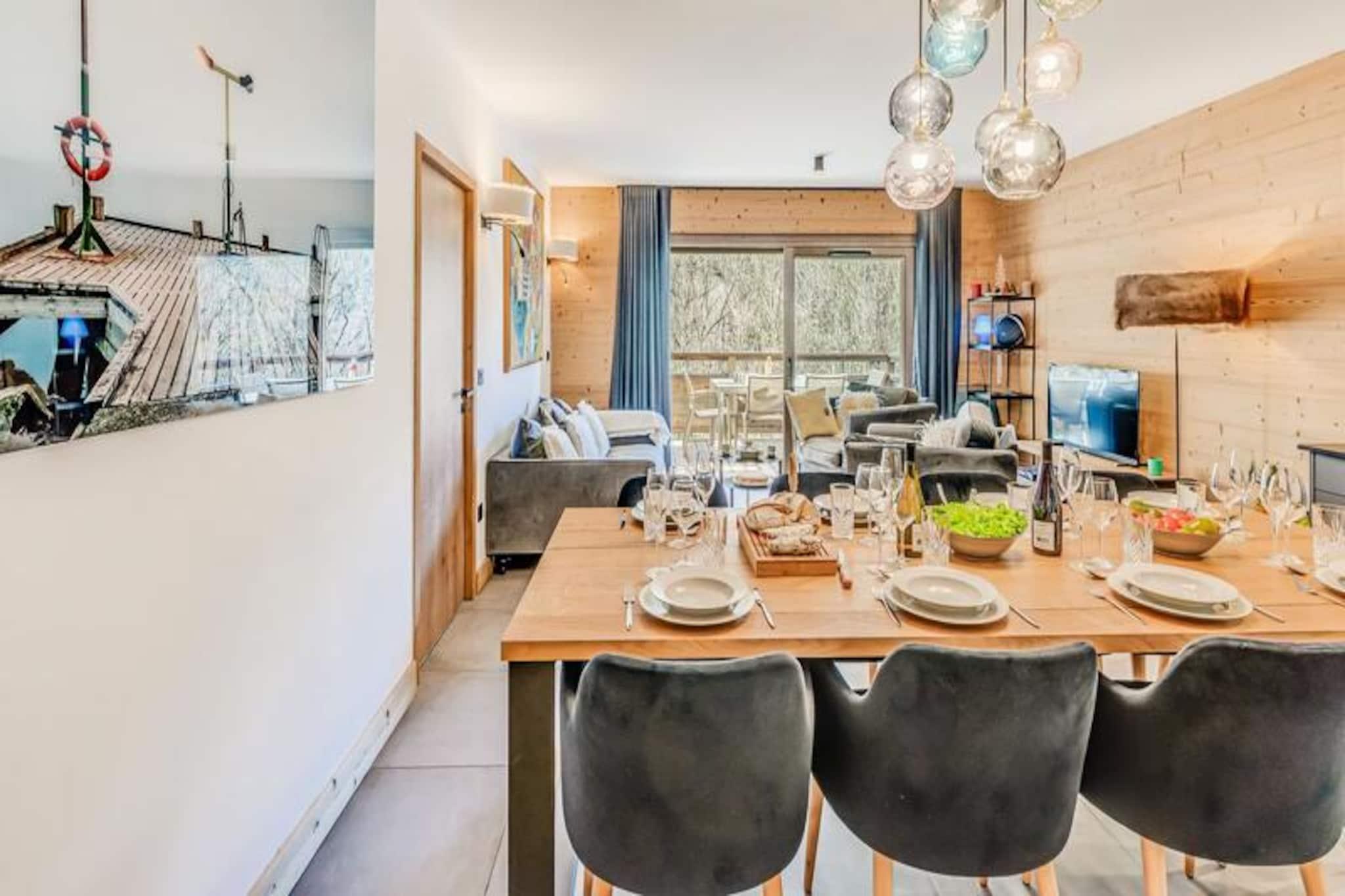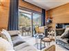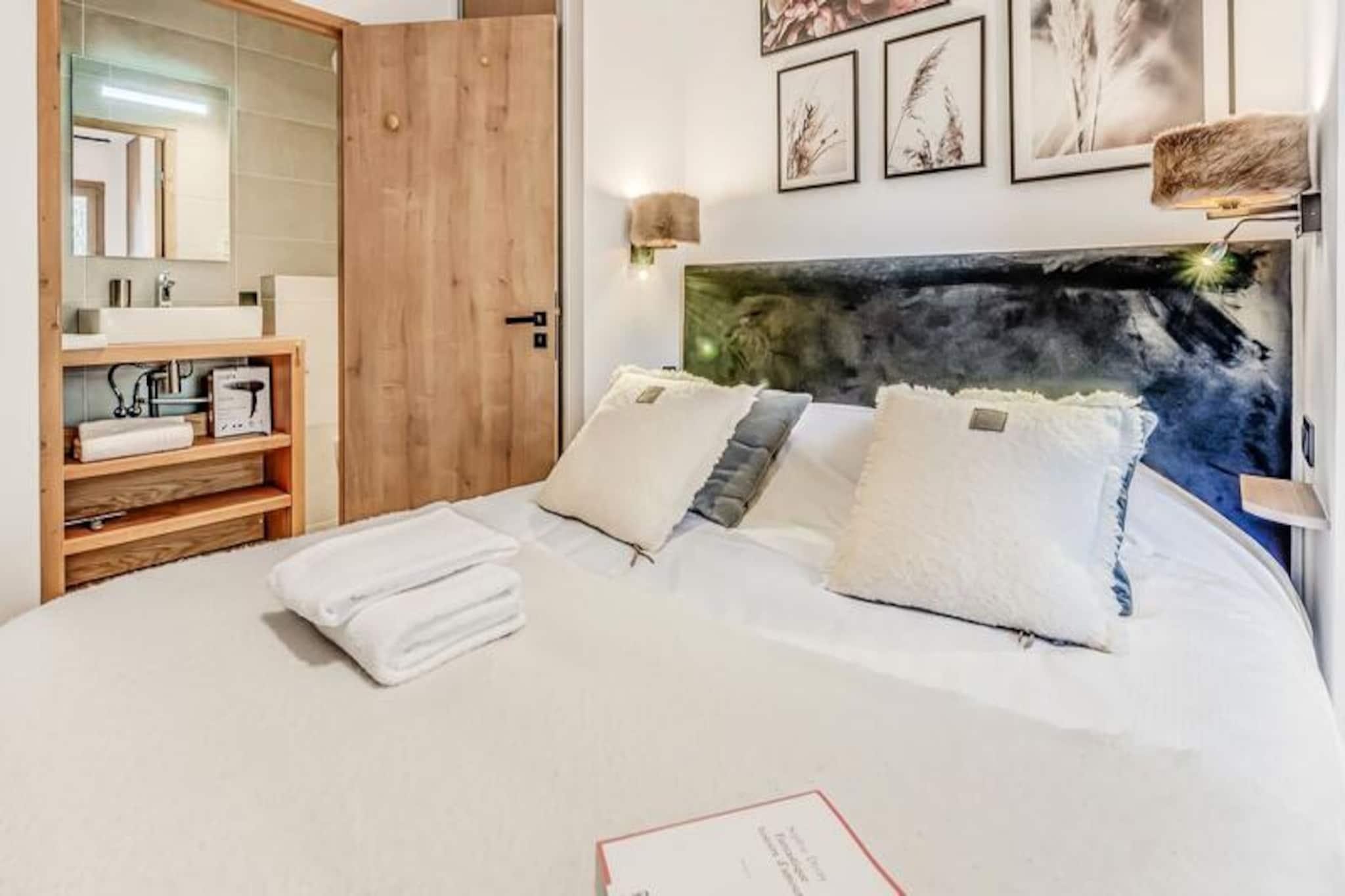 Denne luksuriøse lejlighed i Terrasses de la Vanoise-residensen ligger i udkanten af ??den fredfyldte Vanoise-bjergkæde og tilbyder et uovertruffent alpint tilflugtssted. Med en betagende udsigt over de omkringliggende tinder og den charmerende landsby Champagny en Vanoise lige på den anden side af dalen inviterer denne moderne, men hyggelige indkvartering dig til at opleve de franske alper med stil. Uanset om du besøger dem om vinteren for at stå på ski eller om sommeren for at vandre, er beliggenheden ideel til at fordybe dig i natur og eventyr. \n\nLejligheden er på 94 kvadratmeter og er omhyggeligt designet til at rumme op til otte gæster. Den har tre elegante soveværelser, herunder en nordvendt master-suite med eget brusebad og et sydvendt værelse med adgang til terrassen. Opholdsstuen er varm og indbydende med et fuldt udstyret køkken, en rummelig spiseplads og en komfortabel lounge med en Harman Kardon Bluetooth-højttaler og brætspil. Gå ud på den sydvendte terrasse for at nyde solen eller nyde et måltid under åben himmel omgivet af fantastiske alpine udsigter. Moderne faciliteter såsom en Bosch vaskemaskine/tørretumbler, fiberoptisk internet og et skirum med støvletørrer sikrer bekvemmelighed og komfort under hele dit ophold.\n\nResidensen ligger kun 500 meter fra butikker og skilifter og tilbyder nem adgang til alle landsbyens faciliteter. Gratis kommunale shuttlebusser kører hvert 30. minut i højsæsonen og forbinder dig med Champagny-le-Haut og andre lokale attraktioner. Om sommeren tilbyder den nærliggende swimmingpool og spa afslapning efter en dag med udforskning. Med hotellignende tjenester, herunder Wi-Fi, sengelinned og slutrengøring, kombinerer denne ejendom hjemmets komfort med fordelene ved et luksuriøst ophold.\n\nVælg denne elegante lejlighed til din næste alpeferie og skab uforglemmelige minder i hjertet af de franske alper.