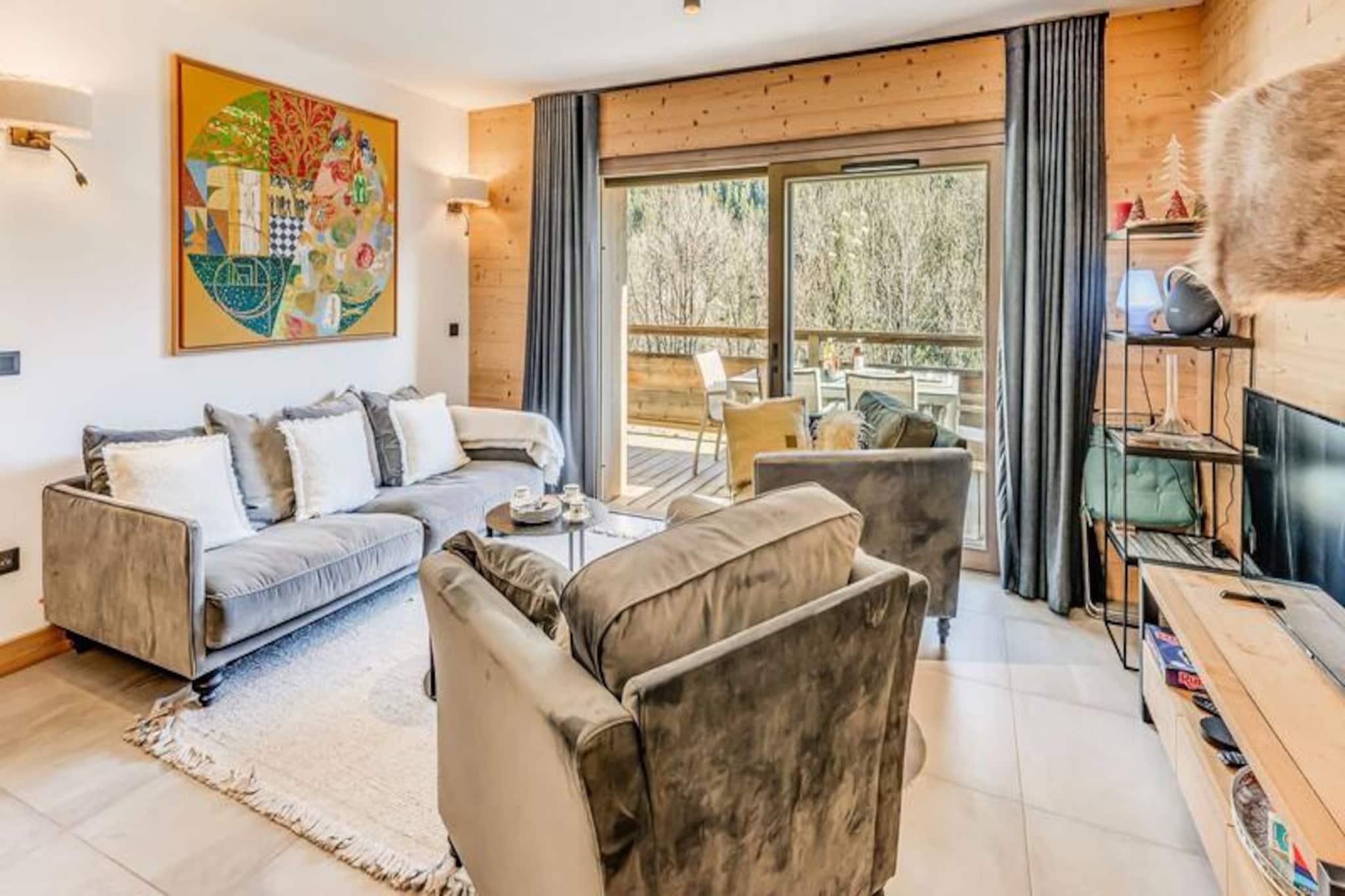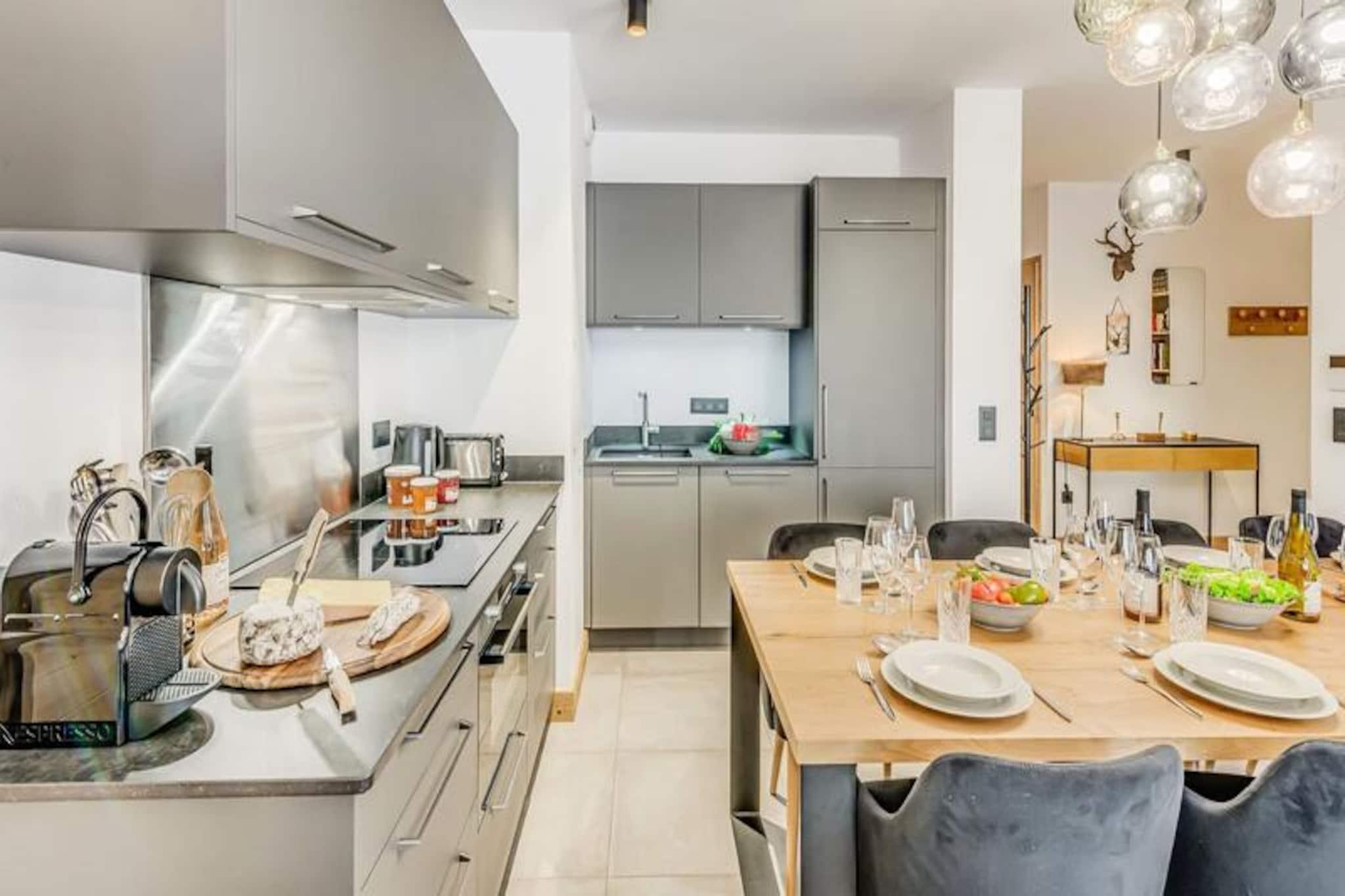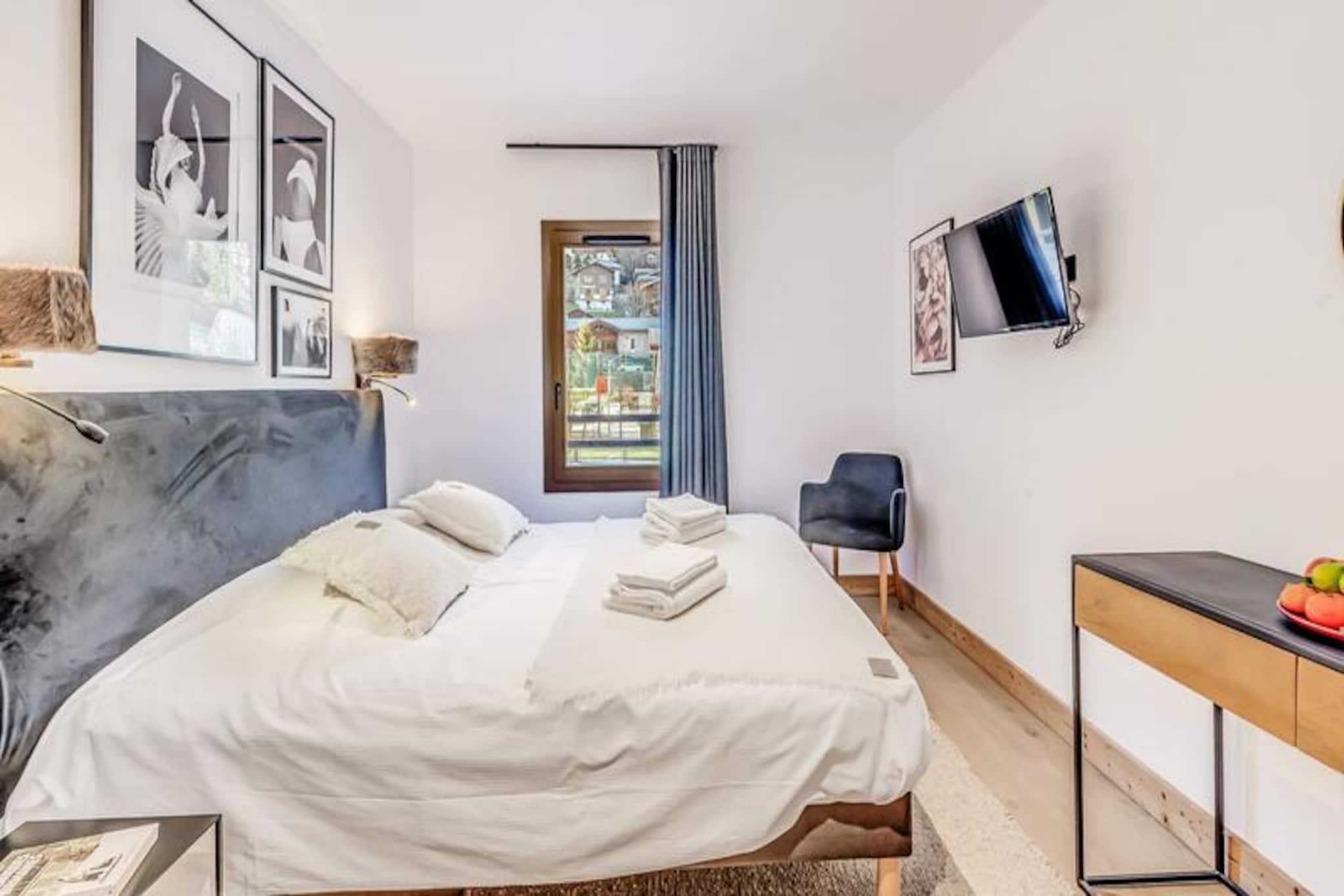 Denne luksuriøse lejlighed i Terrasses de la Vanoise-residensen ligger i udkanten af ??den fredfyldte Vanoise-bjergkæde og tilbyder et uovertruffent alpint tilflugtssted. Med en betagende udsigt over de omkringliggende tinder og den charmerende landsby Champagny en Vanoise lige på den anden side af dalen inviterer denne moderne, men hyggelige indkvartering dig til at opleve de franske alper med stil. Uanset om du besøger dem om vinteren for at stå på ski eller om sommeren for at vandre, er beliggenheden ideel til at fordybe dig i natur og eventyr. \n\nLejligheden er på 94 kvadratmeter og er omhyggeligt designet til at rumme op til otte gæster. Den har tre elegante soveværelser, herunder en nordvendt master-suite med eget brusebad og et sydvendt værelse med adgang til terrassen. Opholdsstuen er varm og indbydende med et fuldt udstyret køkken, en rummelig spiseplads og en komfortabel lounge med en Harman Kardon Bluetooth-højttaler og brætspil. Gå ud på den sydvendte terrasse for at nyde solen eller nyde et måltid under åben himmel omgivet af fantastiske alpine udsigter. Moderne faciliteter såsom en Bosch vaskemaskine/tørretumbler, fiberoptisk internet og et skirum med støvletørrer sikrer bekvemmelighed og komfort under hele dit ophold.\n\nResidensen ligger kun 500 meter fra butikker og skilifter og tilbyder nem adgang til alle landsbyens faciliteter. Gratis kommunale shuttlebusser kører hvert 30. minut i højsæsonen og forbinder dig med Champagny-le-Haut og andre lokale attraktioner. Om sommeren tilbyder den nærliggende swimmingpool og spa afslapning efter en dag med udforskning. Med hotellignende tjenester, herunder Wi-Fi, sengelinned og slutrengøring, kombinerer denne ejendom hjemmets komfort med fordelene ved et luksuriøst ophold.\n\nVælg denne elegante lejlighed til din næste alpeferie og skab uforglemmelige minder i hjertet af de franske alper.