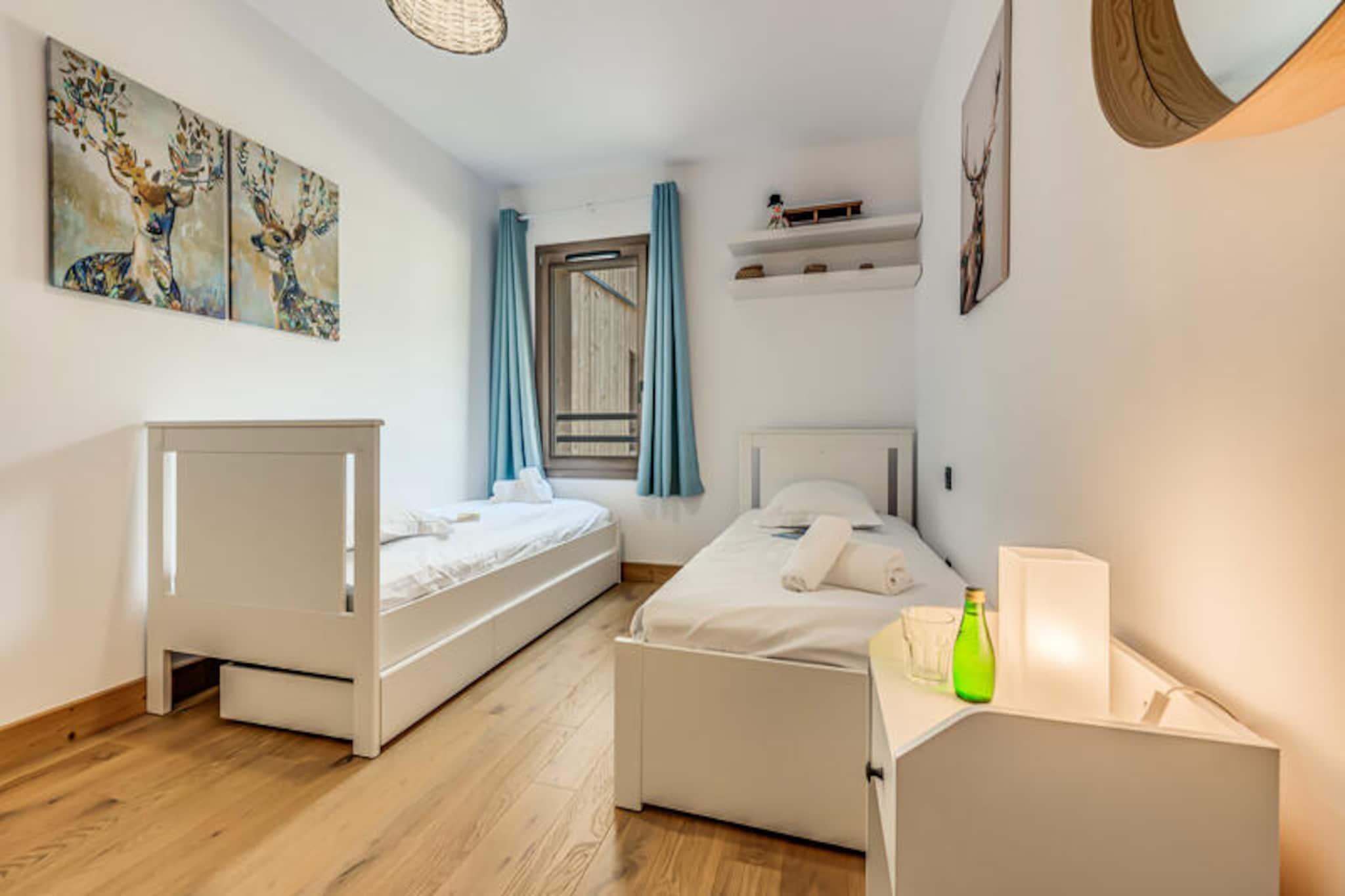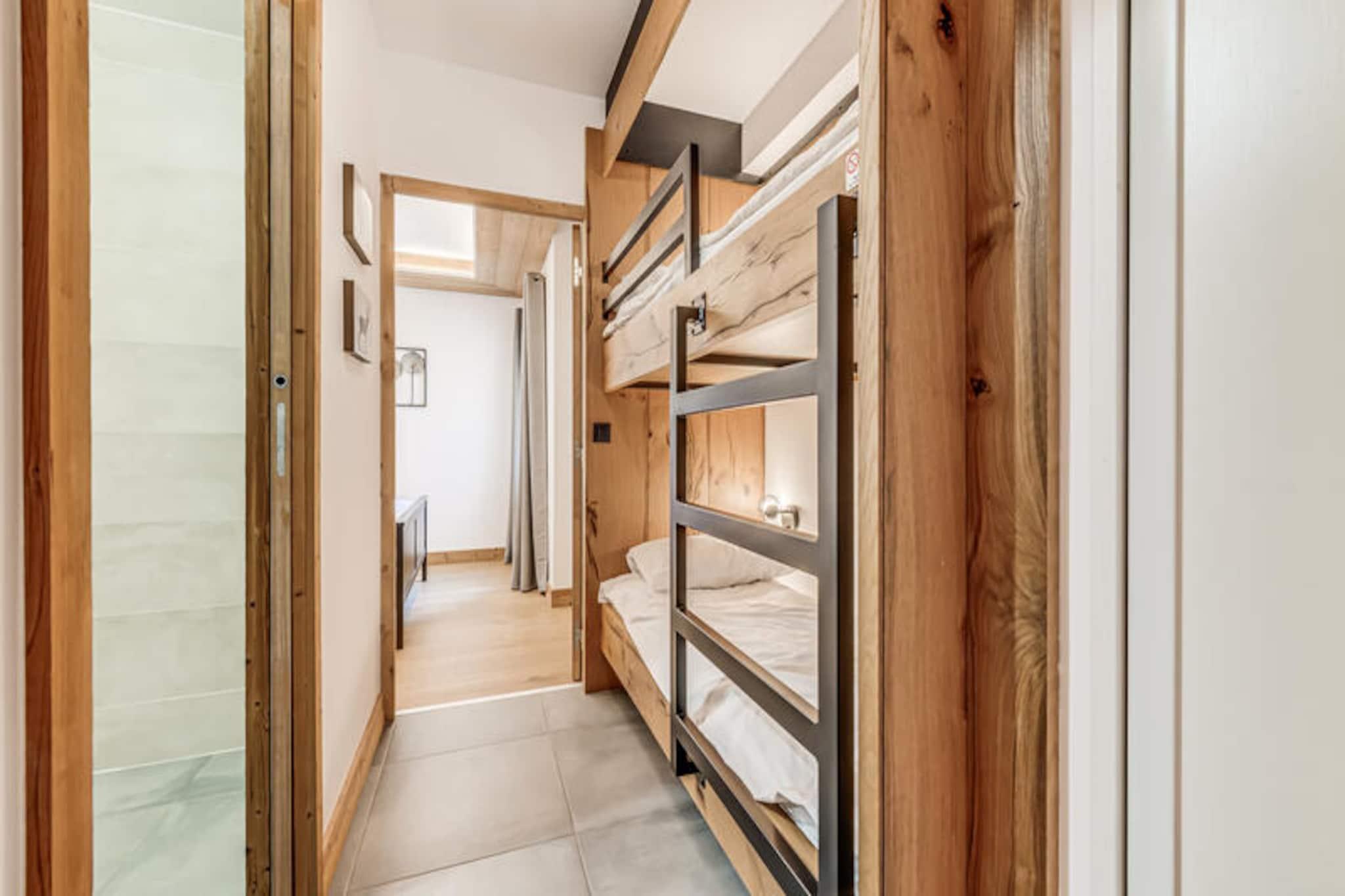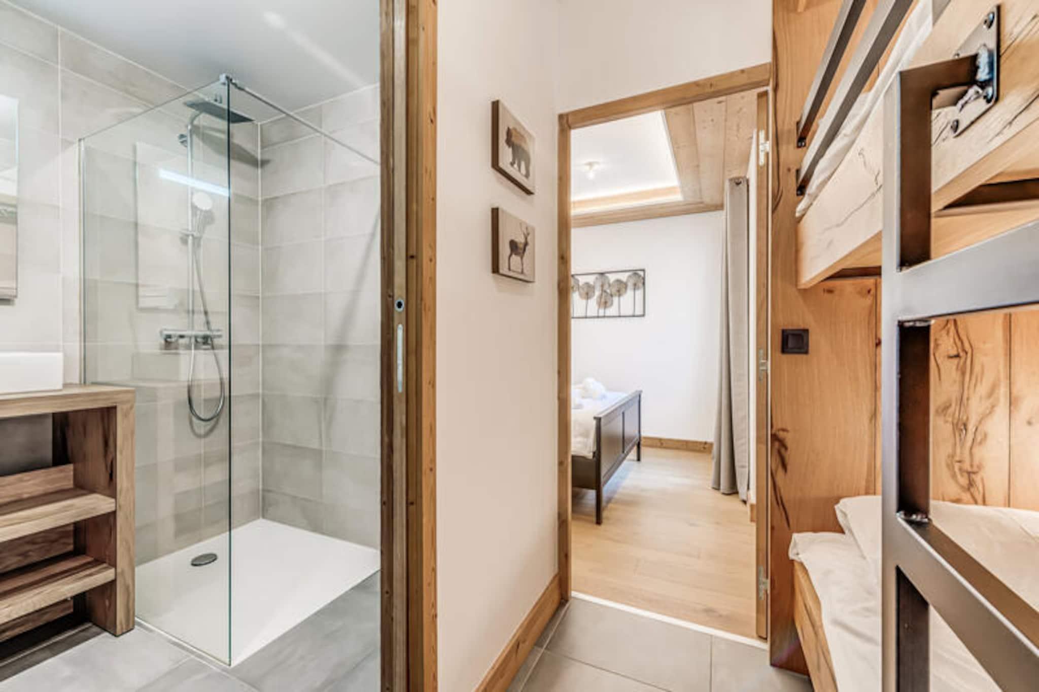 I den maleriske landsby Villard Dessous, hvor de majestætiske Vanoise-bjerge strækker sig uendeligt ud over horisonten, ligger et moderne alpint tilflugtssted, der lover både elegance og komfort. Med uhindret udsigt over bjergtoppene og den charmerende landsby Champagny en Vanoise nedenfor tilbyder denne bolig en perfekt blanding af ro og bekvemmelighed. Uanset om du søger et vintereventyrland eller en sommerflugt, inviterer denne beliggenhed dig til at fordybe dig i de franske alpers skønhed. \n\nLejligheden, der er en del af det nybyggede Terrasses de la Vanoise, kan prale af en rummelig planløsning på 102 m², der er designet til at rumme op til otte gæster. Med tre nordvendte soveværelser, inklusive en familiesuite med køjesenge, og et luksuriøst badeværelse med spabad, er hver eneste detalje omhyggeligt udformet til afslapning. Det fuldt udstyrede køkken åbner ud til en hyggelig stue, hvor du kan slappe af efter en dag med eventyr. Træd ud på den sydvendte balkon og indånd den friske alpeluft, mens du beundrer panoramaudsigten. Yderligere faciliteter inkluderer Wi-Fi, hotelservice, parkering med elektriske ladestationer og et skirum med støvletørrer, hvilket sikrer et problemfrit ophold. \n\nBeliggende kun 500 meter fra butikker og skilifter har du nem adgang til landsbyens faciliteter, herunder gratis kommunale shuttlebusser, der forbinder dig med Champagny-le-Haut. Om sommeren tilbyder den nærliggende swimmingpool og spa forfriskende fritidsmuligheder. Udforsk de omkringliggende stier, nyd lokal mad, eller slap blot af i den rolige alpine atmosfære. Med sin blanding af moderne luksus og naturlig skønhed er denne ejendom din port til uforglemmelige bjergminder.