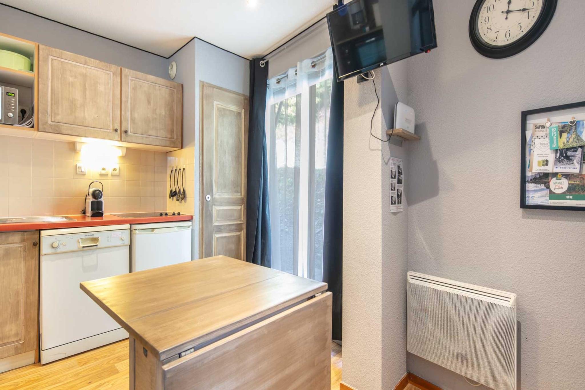 Denne hyggelige etværelses lejlighed tilbyder 30 m² komfortabelt boligareal og kan rumme op til fem gæster. Lejligheden har et fuldt udstyret køkken, hvilket gør det til et fremragende valg for dem, der foretrækker at tilberede deres egne måltider. Gæsterne kan nyde en privat terrasse, der er møbleret med udendørsmøbler, perfekt til at slappe af og nyde den fantastiske udsigt over bjergene. Yderligere faciliteter inkluderer Wi-Fi, et tv, elvarme og en hårtørrer, hvilket sikrer et behageligt og bekvemt ophold. Lejligheden er ideelt beliggende i et familievenligt område i et smukt bjergområde. Blot 50 meter væk finder du både et supermarked og skisportsstedet, som giver nem adgang til daglige fornødenheder og vintersportsaktiviteter. Uanset om du står på ski, snowboard eller blot nyder det betagende alpine landskab, tilbyder ejendommens beliggenhed det bedste af både bekvemmelighed og udendørs eventyr. Det elektriske køkken i åbent plan er veludstyret med moderne apparater, herunder køleskab, mikroovn, ovn, opvaskemaskine, brødrister og kedel, samt tallerkener, bestik og køkkenredskaber. Uanset om du forbereder et hurtigt måltid eller en fuld middag efter en dag på pisterne, har dette køkken alt hvad du behøver. Med sin fantastiske beliggenhed, tankevækkende faciliteter og hyggelige atmosfære er denne lejlighed den perfekte base for din ferie i bjergene.