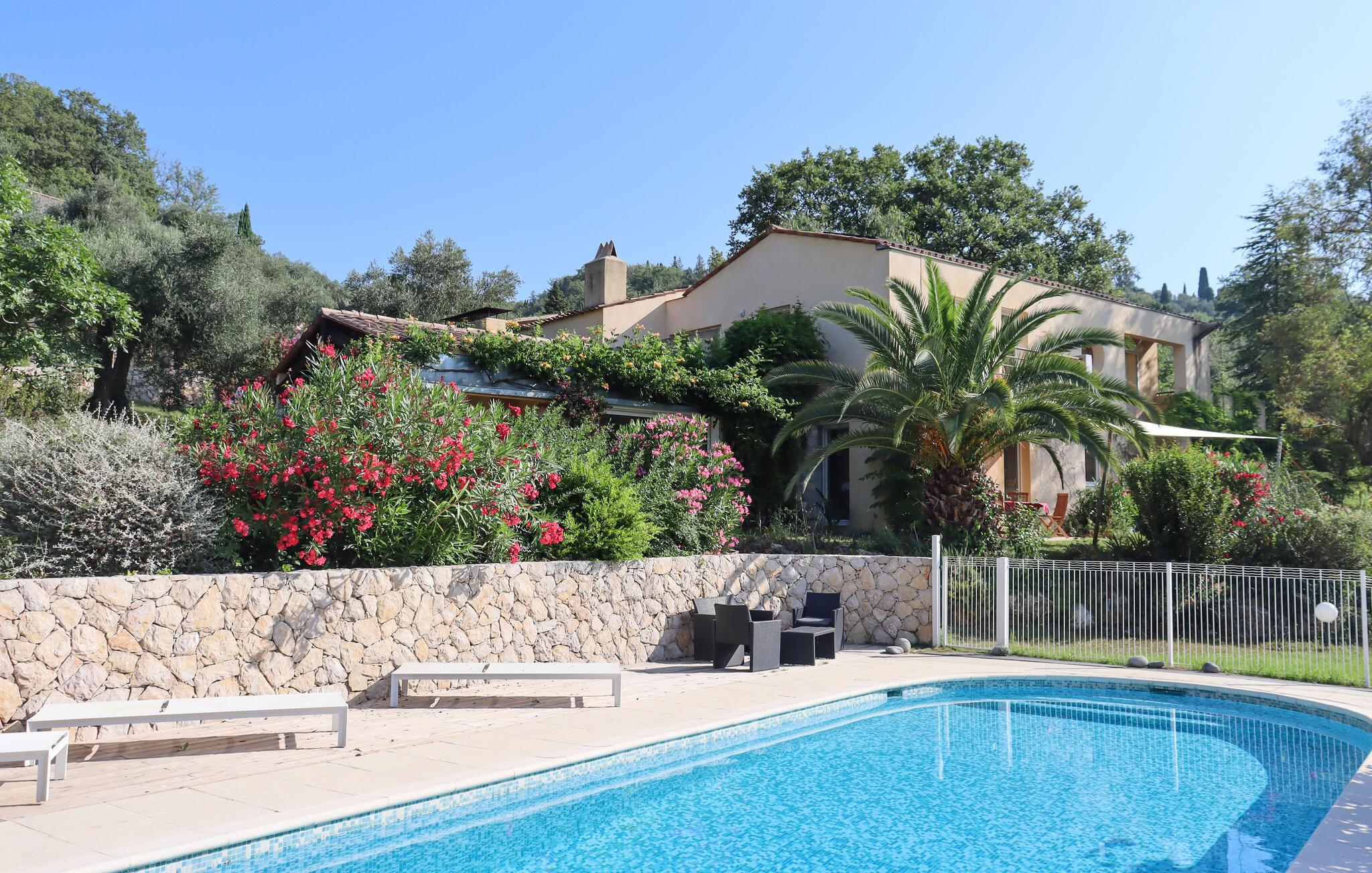 Nyd en drømmeferie i dette komfortable feriehus med pool i en idyllisk beliggenhed. Beliggende i fredelig natur byder dette rummelige feriehus jer velkommen, hvor I kan slappe af med venner eller en større familie og undslippe hverdagens travlhed. Hold sjove madlavningsaftener og hyggelige spilleaftener, eller fordyb jer i en god bog på jeres yndlingssted. Den velholdte middelhavshave lokker med en pragtfuld pool, hvor I kan nyde en afslappet svømmetur hver morgen. Genoplad batterierne på en liggestol, forkæl jer selv med en afslappende siesta i en hængekøje, og fejr kvalitetstid sammen med mindeværdige grillfester. Gå en tur gennem Grasses duftende parfumehaver og oplev de traditionelle parfumehuse, vandr gennem bakkerne i Préalpes d'Azur med betagende udsigt over Middelhavet, og vandr gennem de snoede gader i Gourdon og Saint-Paul-de-Vence med deres charmerende kunstgallerier. Prøv lokale specialiteter på markederne i Valbonne eller Antibes, tag en cykeltur gennem olivenlunde og vinmarker, eller slap af ved det turkisblå vand i Côte d'Azur.