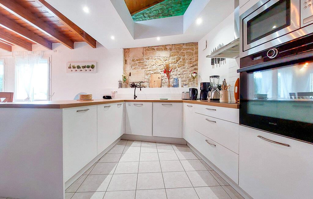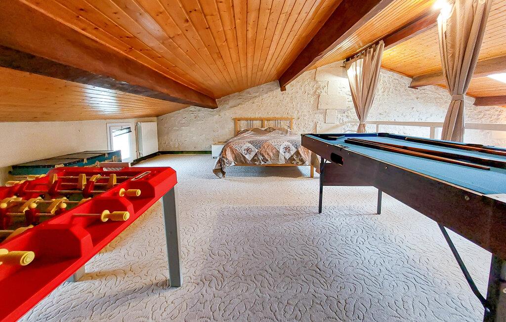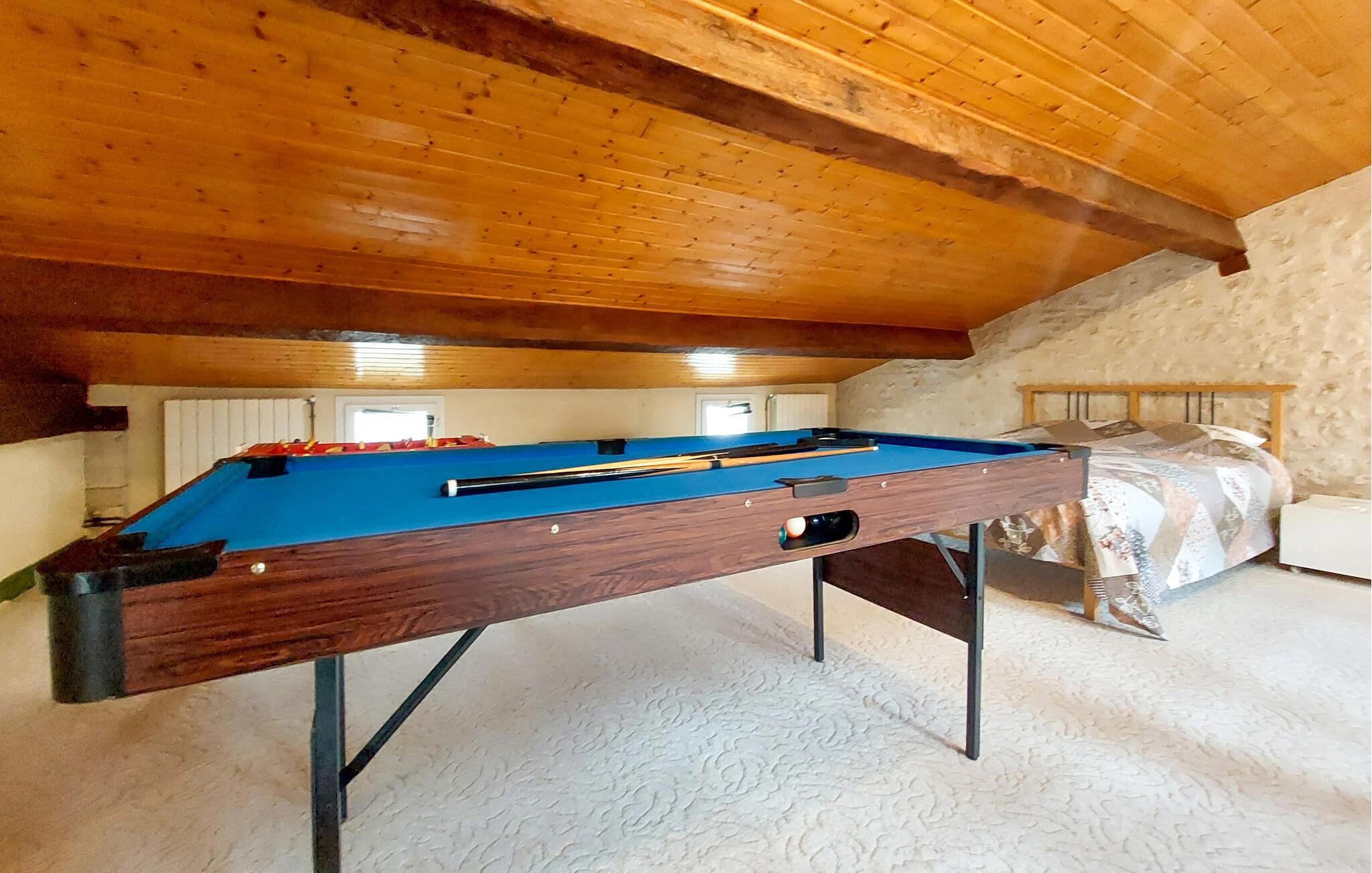 Omgivet af fred, natur og dejlige vandrestier, tilbyder dette rummelige feriehus de perfekte rammer for en uforglemmelig ferie. Træd ind i den store stues imponerende stenmur og høje træbjælker. Sæt jer godt til rette i de komfortable sofaer foran pejsen eller nyd en filmaften i den stilfulde atmosfære. Den lyse spisestue med sine store vinduer skaber en indbydende atmosfære, og det åbne køkken lægger op til at tilberede regionale delikatesser. Ovenpå finder I et ekstra tilflugtssted med et poolbord og et bordfodboldbord - ideelt til sjov og socialt samvær.