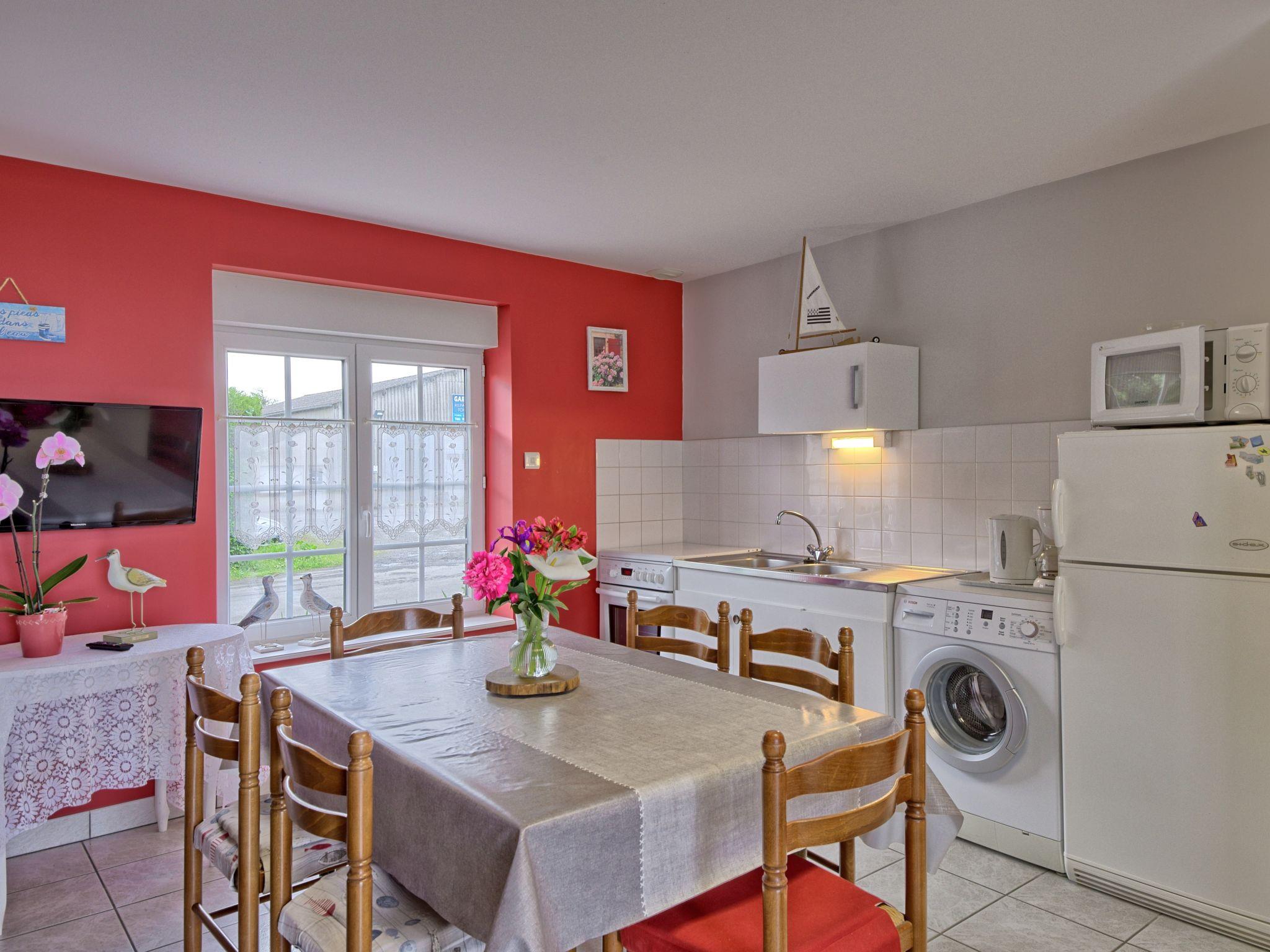 "Au Coeur de la Baie", 2-room semi-detached house 40 m2 on 2 levels. Practical furnishings: living/sleeping room with 1 double sofabed, dining table and TV (flat screen), radio. Exit to the terrace. Kitchenette (1 hot plate, oven, 3 gas rings, toaster, microwave, freezer, electric coffee machine). Upper floor: 1 room with sloping ceilings with 1 bed (90 cm, length 190 cm), 1 french bed (140 cm, length 190 cm), separate WC and shower. Electric heating. Terrace. Terrace furniture, deck chairs (2). Beautiful view of the sea. Facilities: washing machine, iron, children's high chair, baby cot. Internet (WiFi, free). Please note: non-smoking house. Smoke alarm. Bed layout is flexible. There are more sleeping options available than the maximum number of people allowed which may, however, not be exceeded.