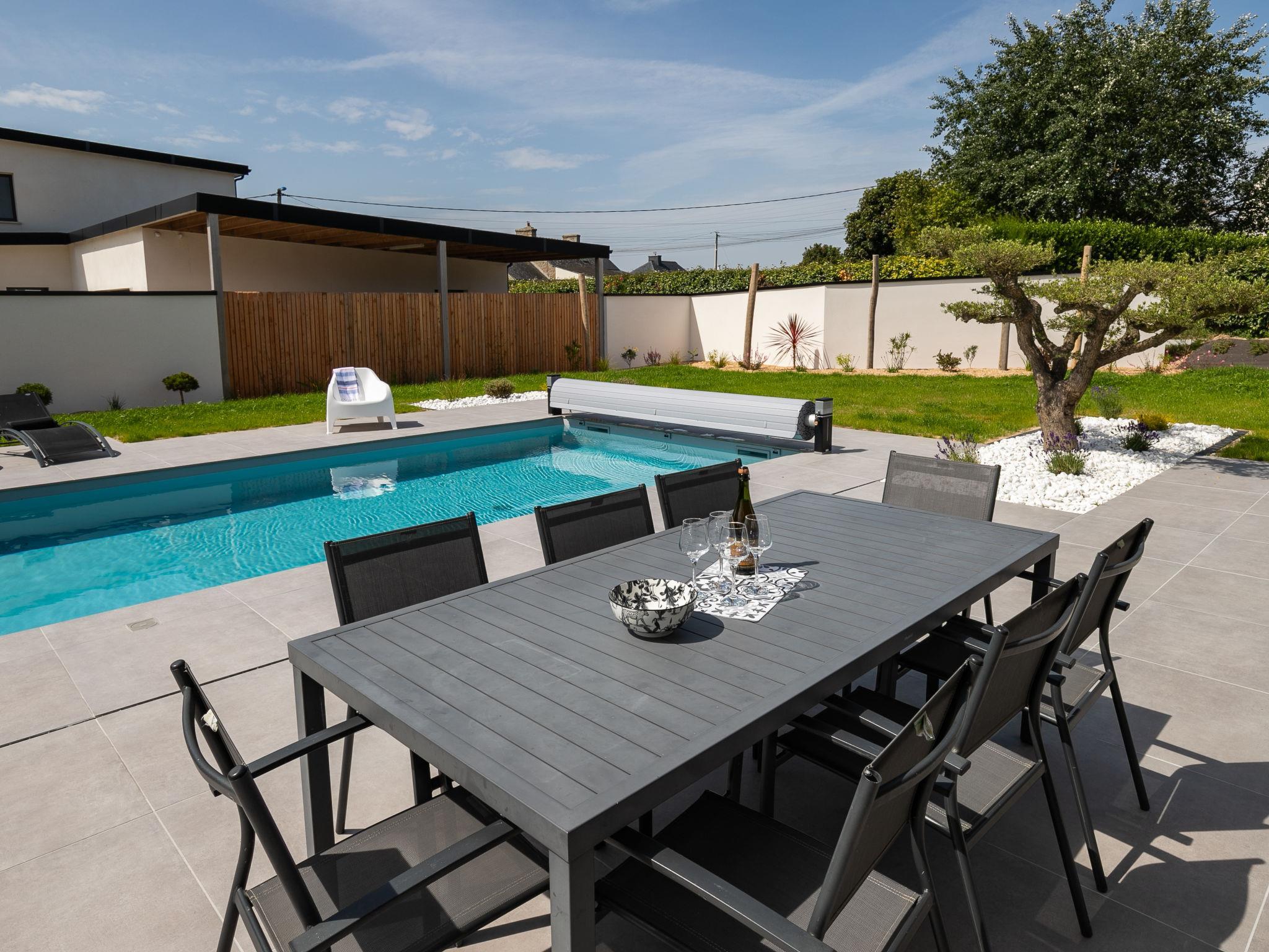 Modern, beautiful single-family house "Villa Ty Coz". In the district of Kerfissien 6 km from the centre of Cléder, in a quiet position in the residential district, 400 m from the sea, 400 m from the beach. Private: property 1'300 m2, garden with lawn and wildlife garden, swimming pool angular, heated (4 x 8 m, 32 m2, depth 150 cm, seasonal availability: 01.May. and 30.Sep.) with shutter cover. Outdoor shower, boules, parking (for 2 cars). Shop 5 km, supermarket 7 km, restaurant 5 km, bakery 5 km, café 300 m, bus stop 3.8 km, sandy beach "Les Amiets" 1 km. Golf course (9 hole) 4.5 km, surf school 7 km, sailing school 2.2 km, walking paths from the house 300 m. Nearby attractions: Roscoff et le jardin exotique 20 km, Morlaix 35 km, Château de Kerjean 15 km, Réserve ornithologique 15 km, Oceanopolis Brest 55 km. Hiking paths: GR34, sentier des douaniers 300 m.