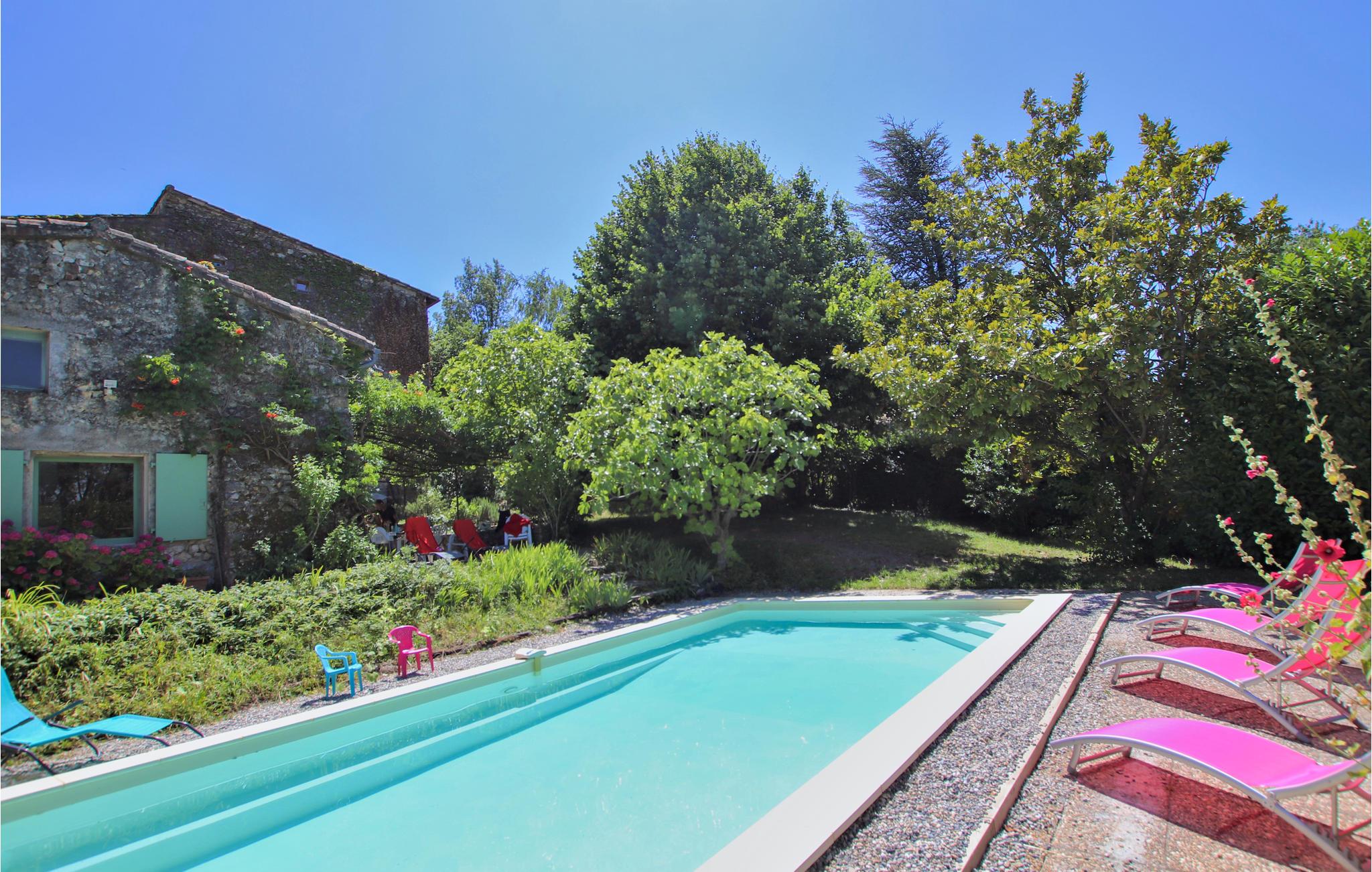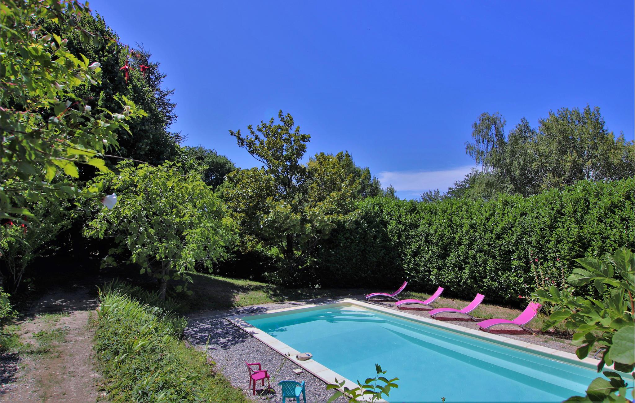 Nyd en croissant og en café au lait på den storslåede terrasse om morgenen, mens I planlægger dagens aktiviteter og udflugter. Her venter jer mange skønne timer i naturen og I kan altid finde naturlig skygge både på terrassen og den frodige, private skovpark, der omgiver huset. Når I vil køles ned eller bare have det sjovt, er det oplagt at hoppe i poolen. Nyd roen og de naturlige omgivelser og lad solen varme jer, mens I slapper af på en af liggestolene.