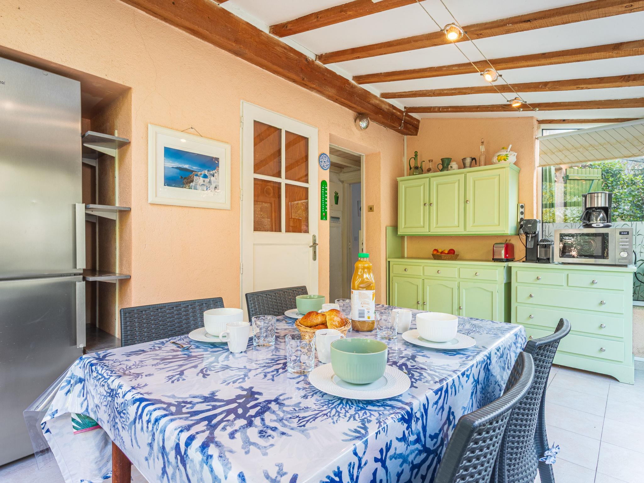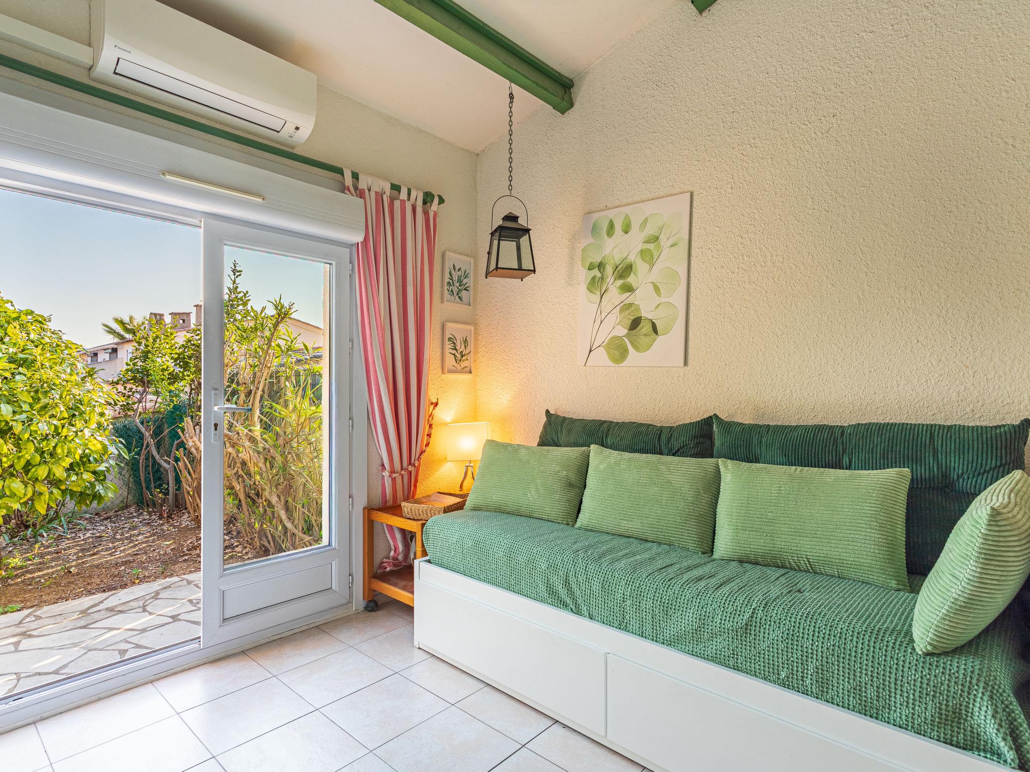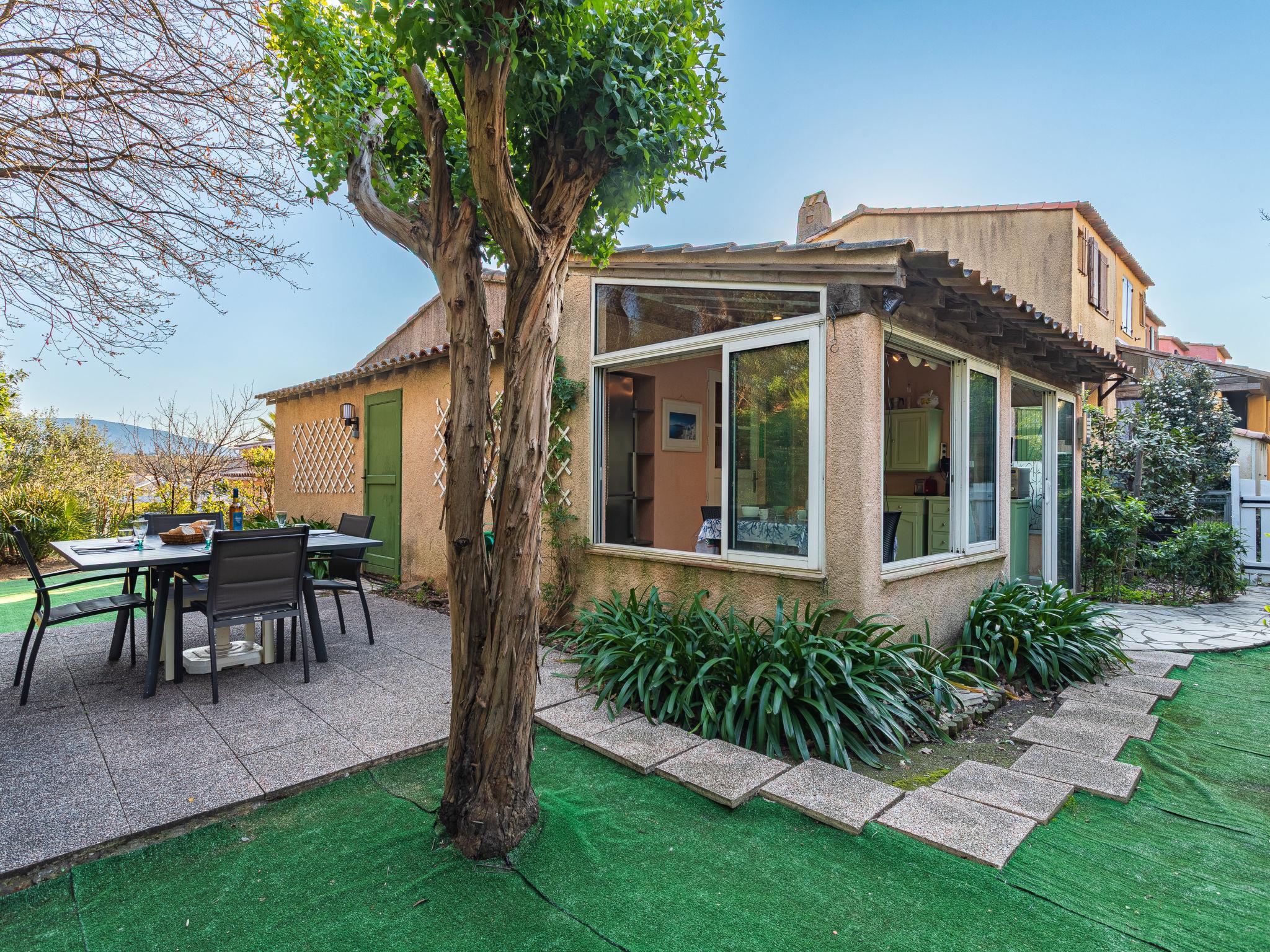 "Le Mas de Cogolin 5", 2-room terraced house 50 m2. Cosy furnishings: living room with 1 pull-out bed (2 x 80 cm, length 200 cm), TV, flat screen and air conditioning. Exit to the garden. 1 room with 1 french bed (140 cm, length 200 cm), shower/WC. Open kitchen (dishwasher, 4 ceramic glass hob hotplates, toaster, kettle, freezer, electric coffee machine, Capsules for coffee machine (Nespresso) extra, combination microwave) with dining nook. Exit to the veranda. Electric heating. Terrace 12 m2, garden 200 m2. Terrace furniture. Facilities: washing machine, dryer. Internet (WiFi, free). Parking space n E10. Please note: non-smokers only. 1 small pet/ dog allowed. Smoke alarm. Offer by a private individual according to Art. 155, IV of CGI.