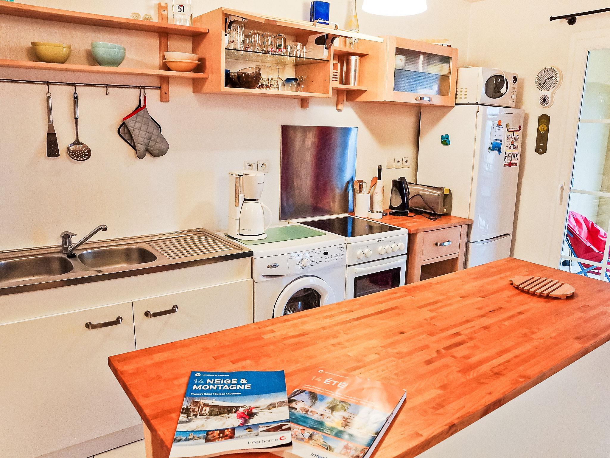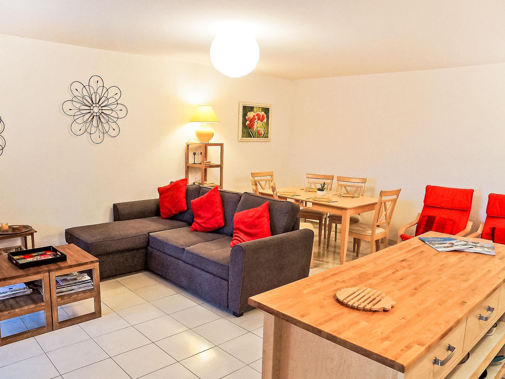 "Résidence La Boisseliere 1", 3-room apartment 60 m2 on 1st floor. Bright, comfortable and beautiful furnishings: living/dining room with 1 double sofabed (1 x 160 cm, length 190 cm), TV. Exit to the terrace. 1 room with 2 beds (90 cm, length 190 cm). 1 room with 1 french bed (140 cm, length 190 cm). Exit to the balcony. Open kitchen (4 hot plates, oven, freezer). Bathroom, sep. WC. Electric heating. Balcony, terrace. Terrace furniture. View of the resort. Facilities: washing machine. Internet (WiFi, extra). Parking space n 10 (roofed). Please note: non-smokers only, parking space for small car only. Maximum 1 small pet/ dog allowed. Smoke alarm.