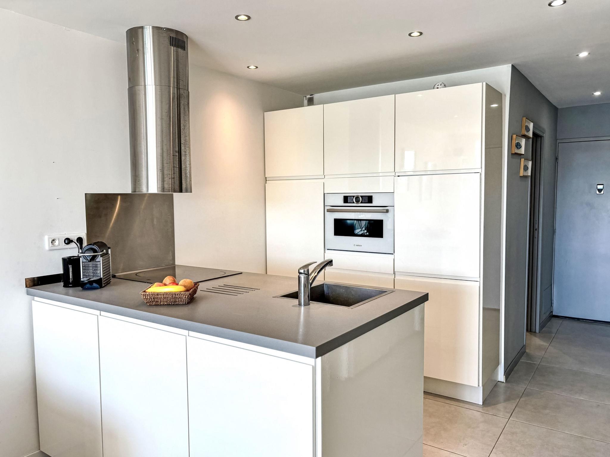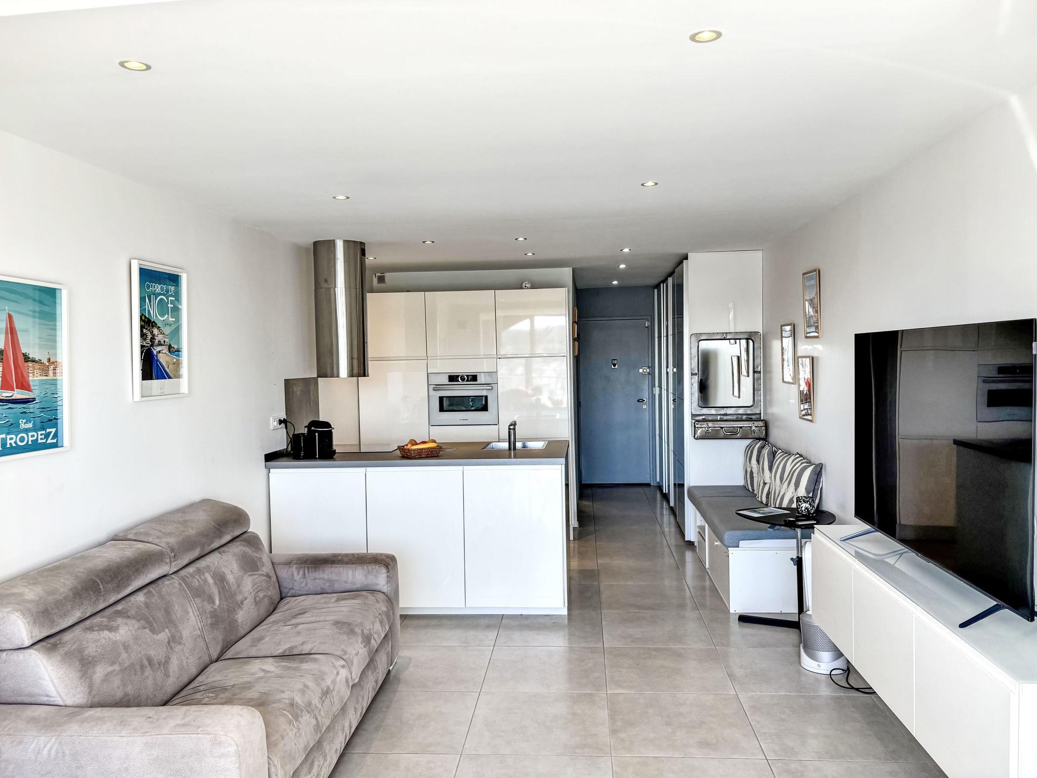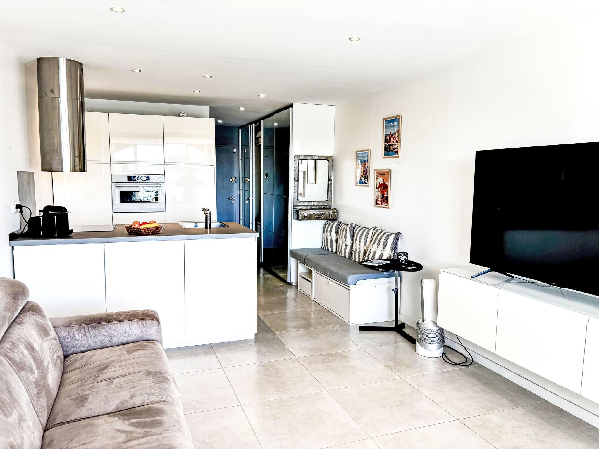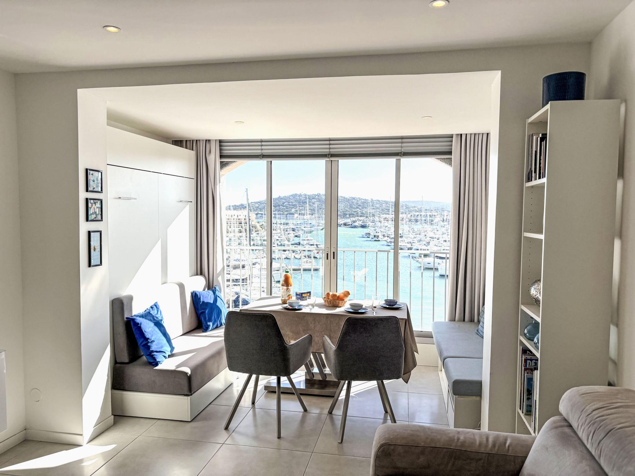 "Les Cascadelles 14", 1-room studio 28 m2 on 4th floor. Cosy furnishings: living/dining room with 1 sofabed (140 cm, length 190 cm), 1 fold-away bed (140 cm, length 190 cm), TV (flat screen). Open kitchen (dishwasher, 3 induction hot plates, toaster, kettle, freezer, electric coffee machine, Capsules for coffee machine (Nespresso) extra, combination microwave). Shower/WC. Electric heating. Beautiful view of the port. Facilities: washing machine. Internet (WiFi, free). Please note: non-smokers only. Maximum 1 small pet/ dog allowed. Smoke alarm. Offer by a private individual according to Art. 155, IV of CGI.