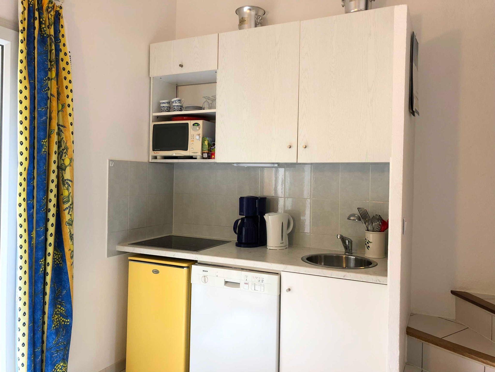 Das Haus bietet Platz für bis zu vier Personen und verteilt sich über zwei Etagen: Im Erdgeschoss befindet sich das gemütliche Wohnzimmer mit Schlafcouch und direktem Zugang zur sonnigen Terrasse. Auf halber Ebene liegt die Küche mit Essbereich, im Obergeschoss befinden sich das Schlafzimmer und das Badezimmer. Eine Klimaanlage sorgt in allen Wohnbereichen für angenehme Temperaturen ? ideal für heiße Sommertage.