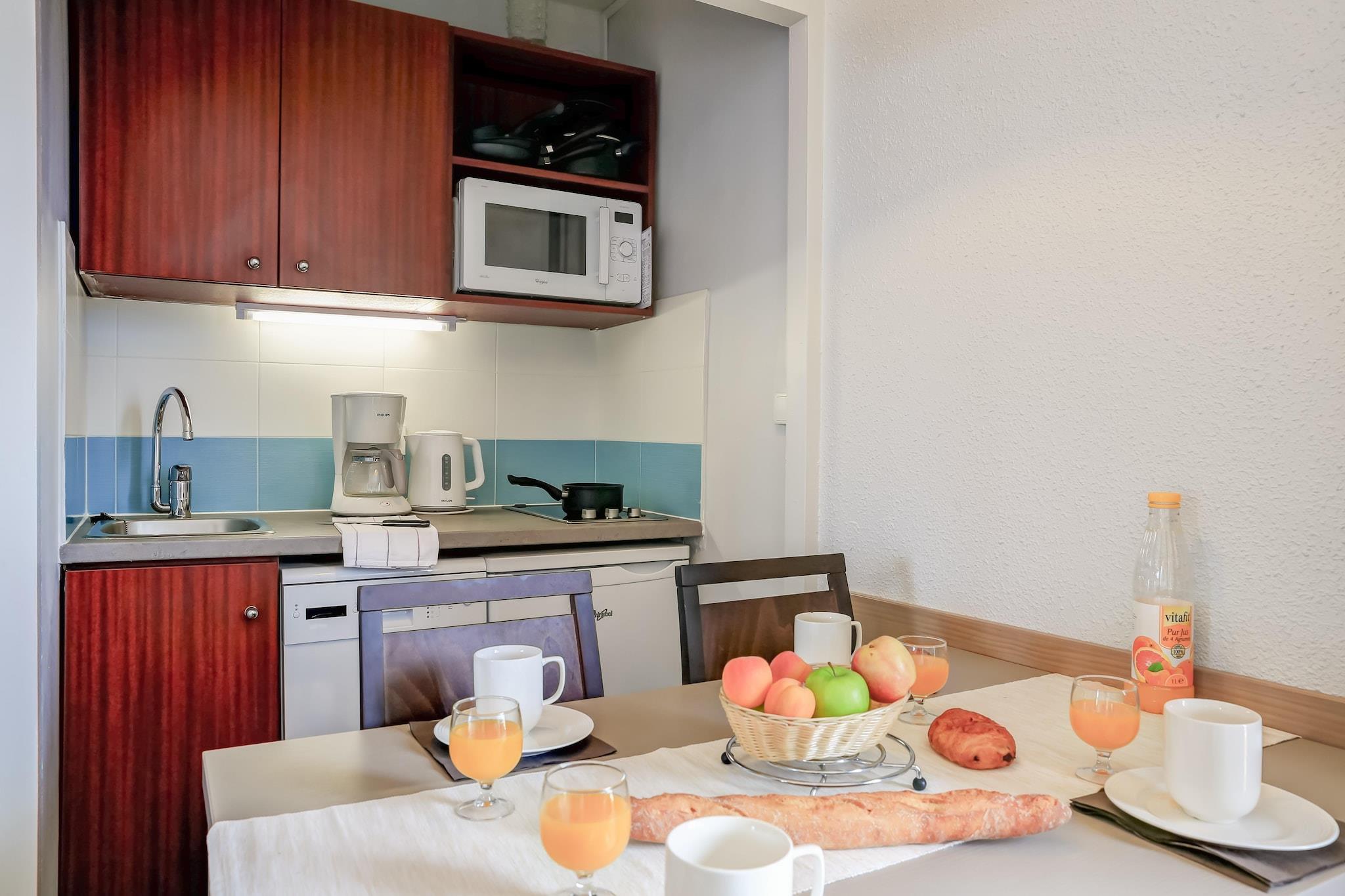 Tekøkken(elkedel, komfur(Komfur med to kogeplader), kaffemaskine, mikrobølgeovn, opvaskemaskine , køleskab), Stue/soveværelse(feltseng, enkeltsovesofa, Fjernsyn), soveniche(køjeseng), badeværelse(badekar, toilet), balkon eller terrasse, havemøbler, swimmingpool(deles med andre gæster, udendørs, opened from Apr upto and including Aug)