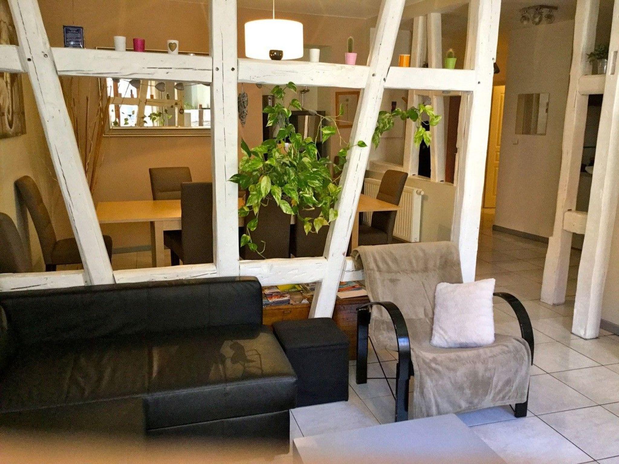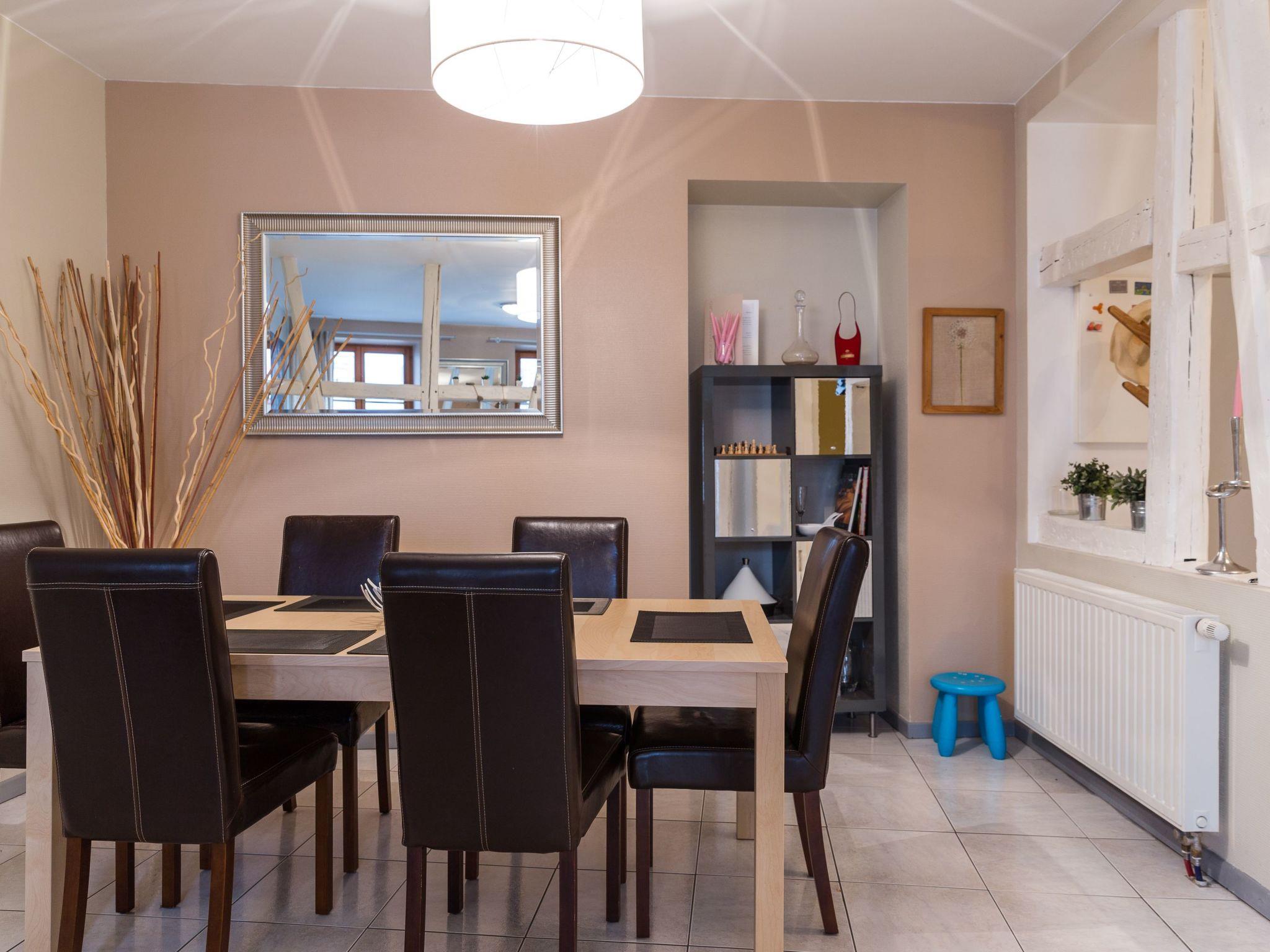 This light and spacious apartment is on the first floor of a typical Alsace house, providing 105m² of space for eight people. Two of the three bedrooms each have two single beds 80cm wide, which can also be pushed together as double beds. One of them also has a sofa bed 140cm wide. The third bedroom has two single beds 90cm wide. The living room provides a large dining table and a flatscreen TV, as well as a sofa bed for two people (140 x 20cm). The bathroom is fitted with a bath with a shower screen, a double washbasin, a WC, a clothes stand and a hairdryer. The kitchen is equipped with a fridge, freezer, ceramic induction hob, dishwasher, oven, microwave, toaster, Senseo coffee machine, citrus press and a raclette and fondue set. A washing machine with a dryer function is also available. A vacuum cleaner, iron and ironing board, cleaning products and tea towels are available for use. Towels and bed linen can be provided at a supplementary charge. Heating and high-speed wireless Internet access are available in all the rooms.