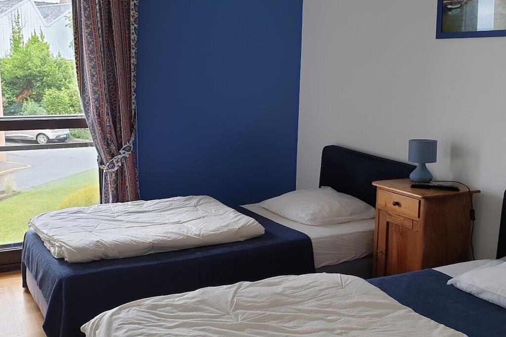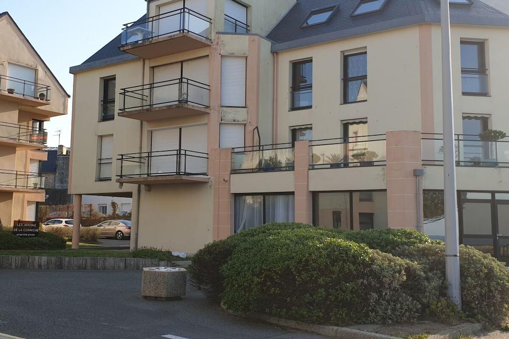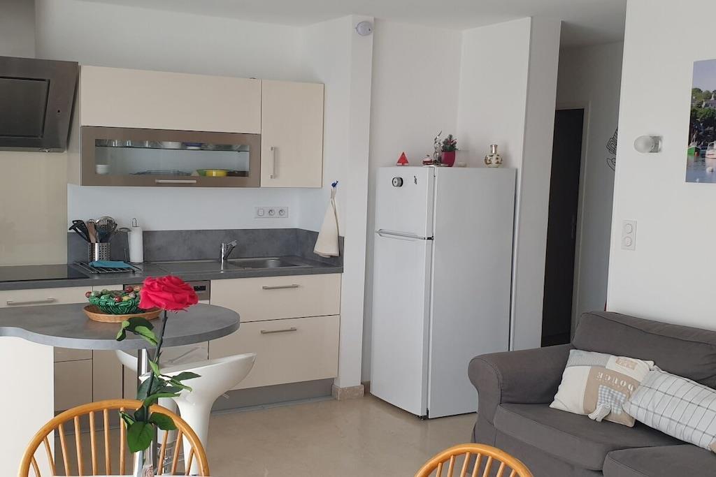 Denne renoverede lejlighed på 53 m² ligger på første sal i en ny, eksklusiv bolig i Concarneau og tilbyder en betagende havudsigt. Faciliteterne inkluderer udendørs parkeringsplads, elevator, intercom-system og internetadgang. Lejlighedens indretning er som følger: Opholdsstue: Balkon med udsigt over Concarneau-bugten, sofa, 102 cm fladskærms-tv, 4 m² balkon med havudsigt, bord og stole, spiseplads med bord og stole, fuldt udstyret tekøkken med elektrisk ovn, mikrobølgeovn, induktionskogeplade, opvaskemaskine, køleskab med integreret fryser og morgenmadsbar med to barstole. Soveværelse 1: To senge, garderobe, parketgulv. Soveværelse 2: En seng (1,60 m), vaskeskab, kommode, parketgulv. Badeværelse: Brusekabine, håndvask, vaskemaskine, separat toilet og håndvask. Karderobe i entréområdet.