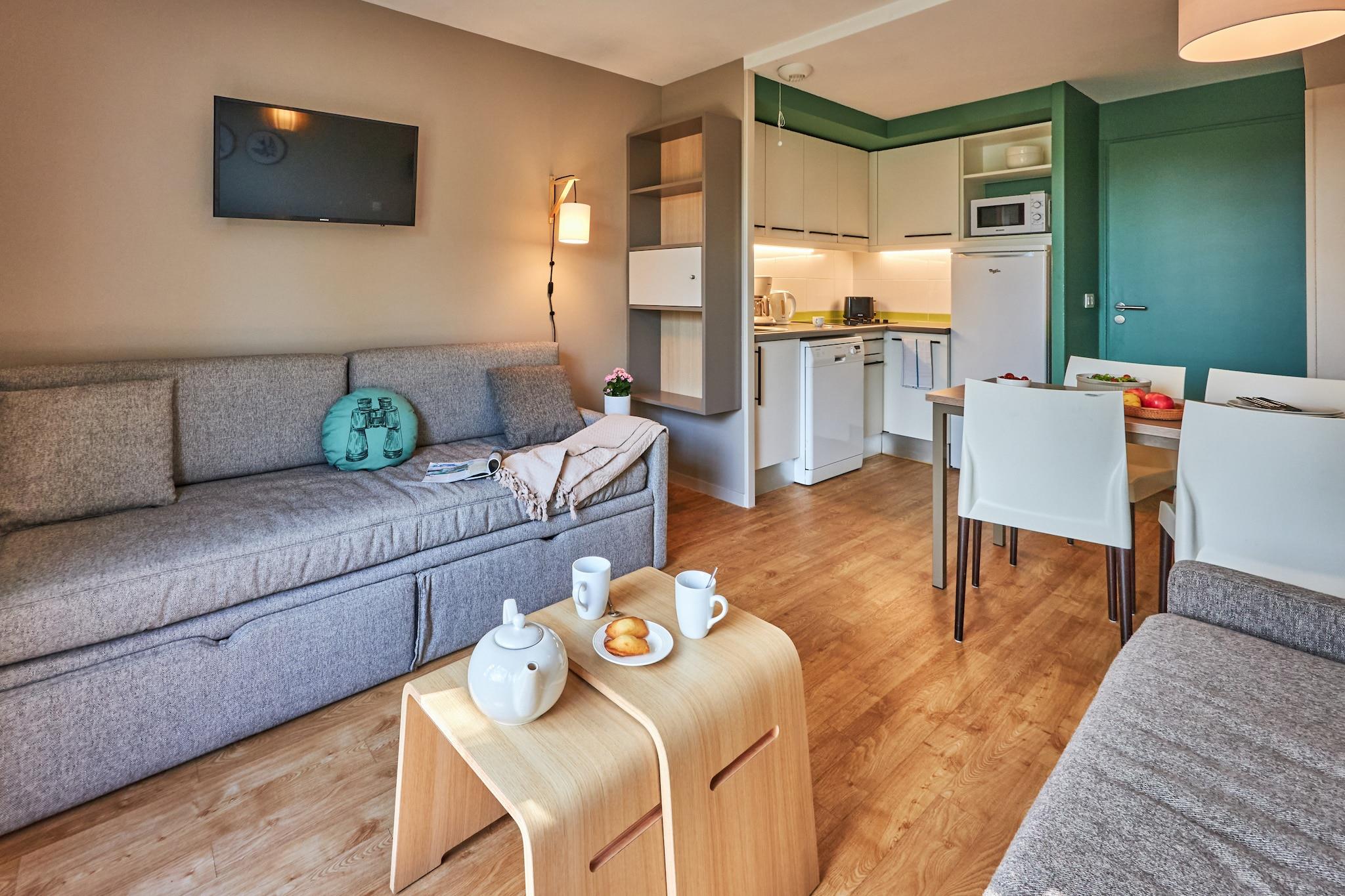 Tekøkken(kakkelovn, kogeplade(glaskeramisk), brødrister, kaffemaskine, mikrobølgeovn, opvaskemaskine , køleskab(+ fryser)), Stue/soveværelse(enkeltsovesofa, enkeltsovesofa, Fjernsyn), soveværelse(dobbeltseng), soveværelse(køjeseng), badeværelse(badekar, toilet), badeværelse(bruser, toilet), vaskemaskine(deles med andre gæster, betalt), balkon eller terrasse, havemøbler, parkering, swimmingpool(deles med andre gæster, indendørs, herunder en del for børn (maks. dybde 50 cm)), legeredskaber(deles med andre gæster)