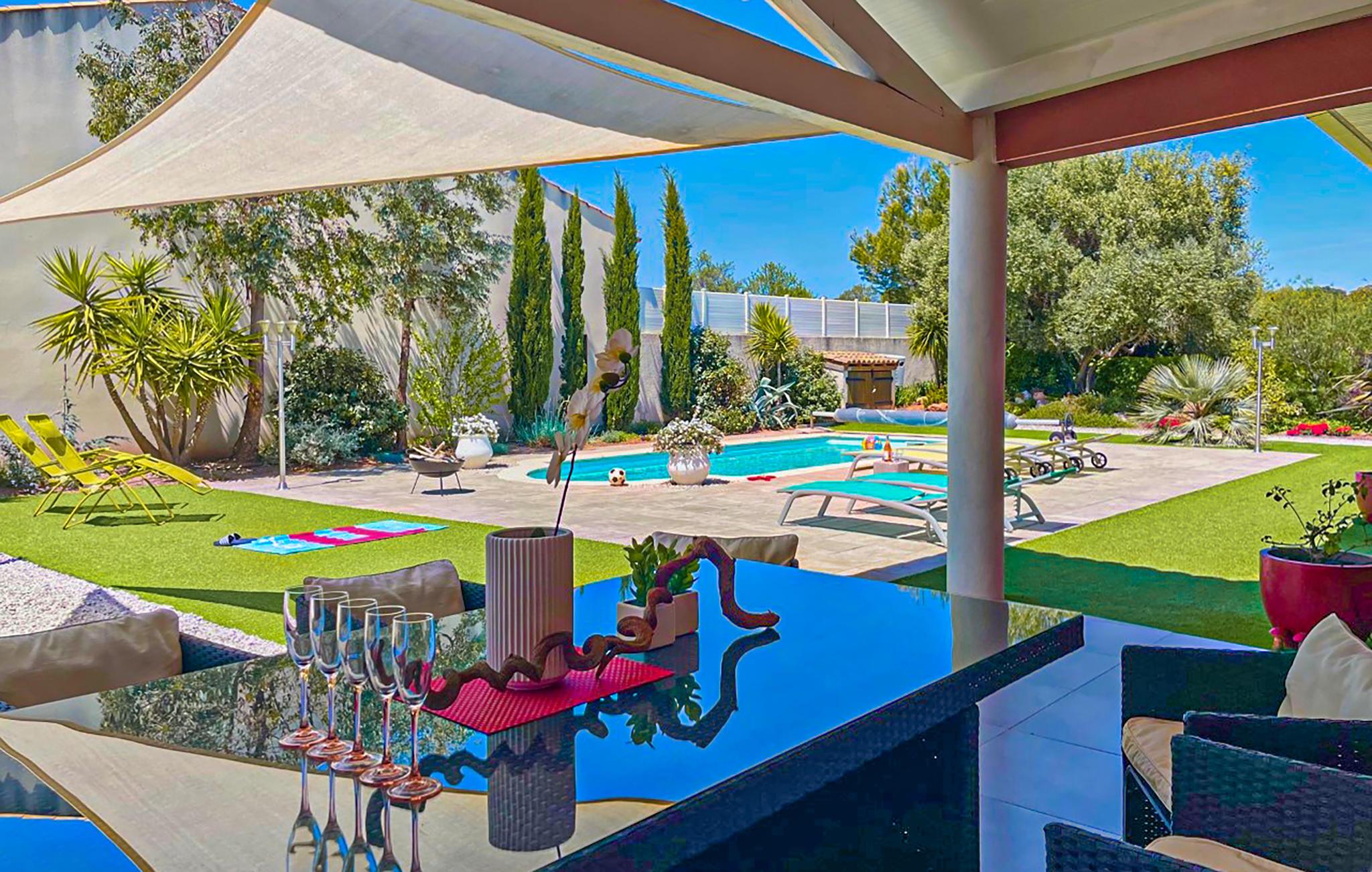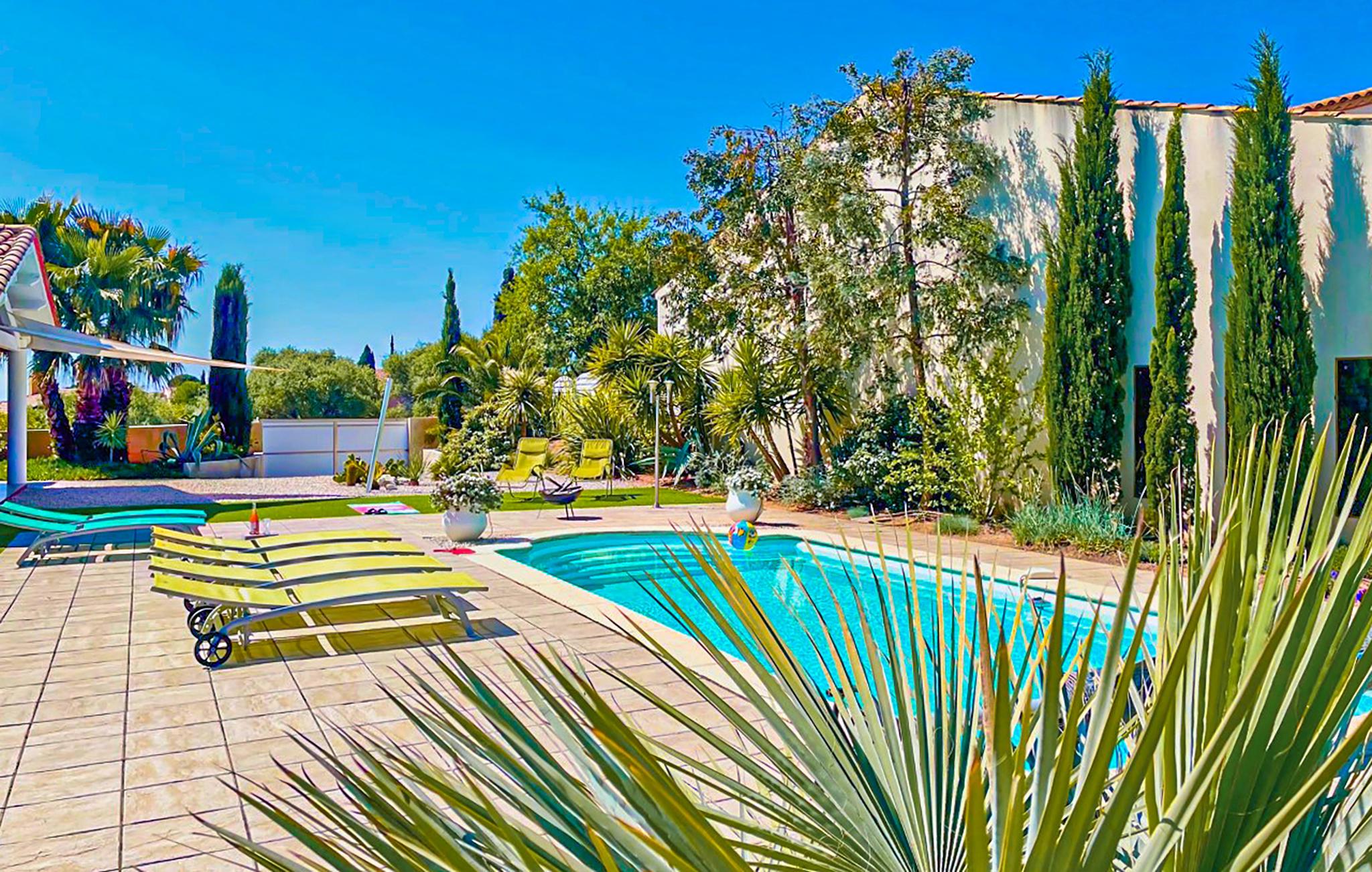 Skønt, moderne feriehus med opvarmet swimmingpool samt terrasser på en flot, indhegnet grund i Creissan, en vinlandsby i Languedoc.