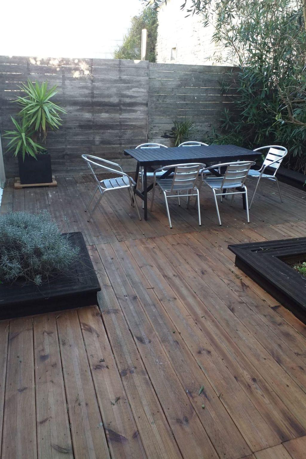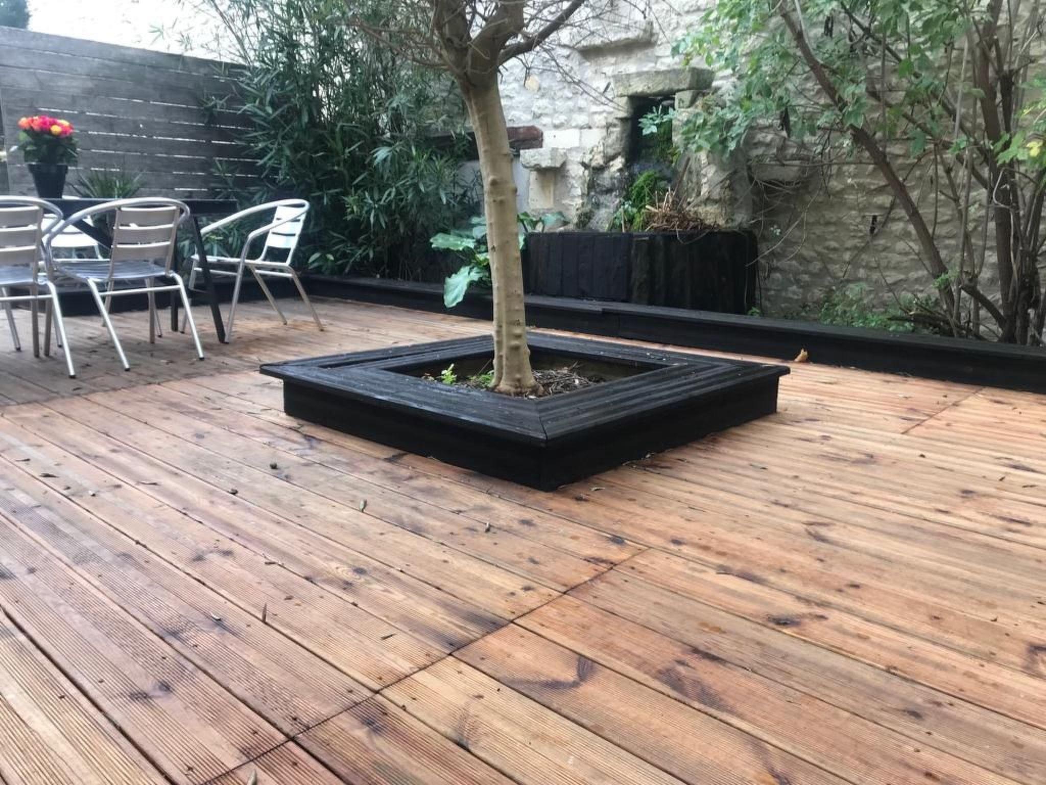 Large 30 m2 wooden terrace and small garden with 2 garden furniture and fountain