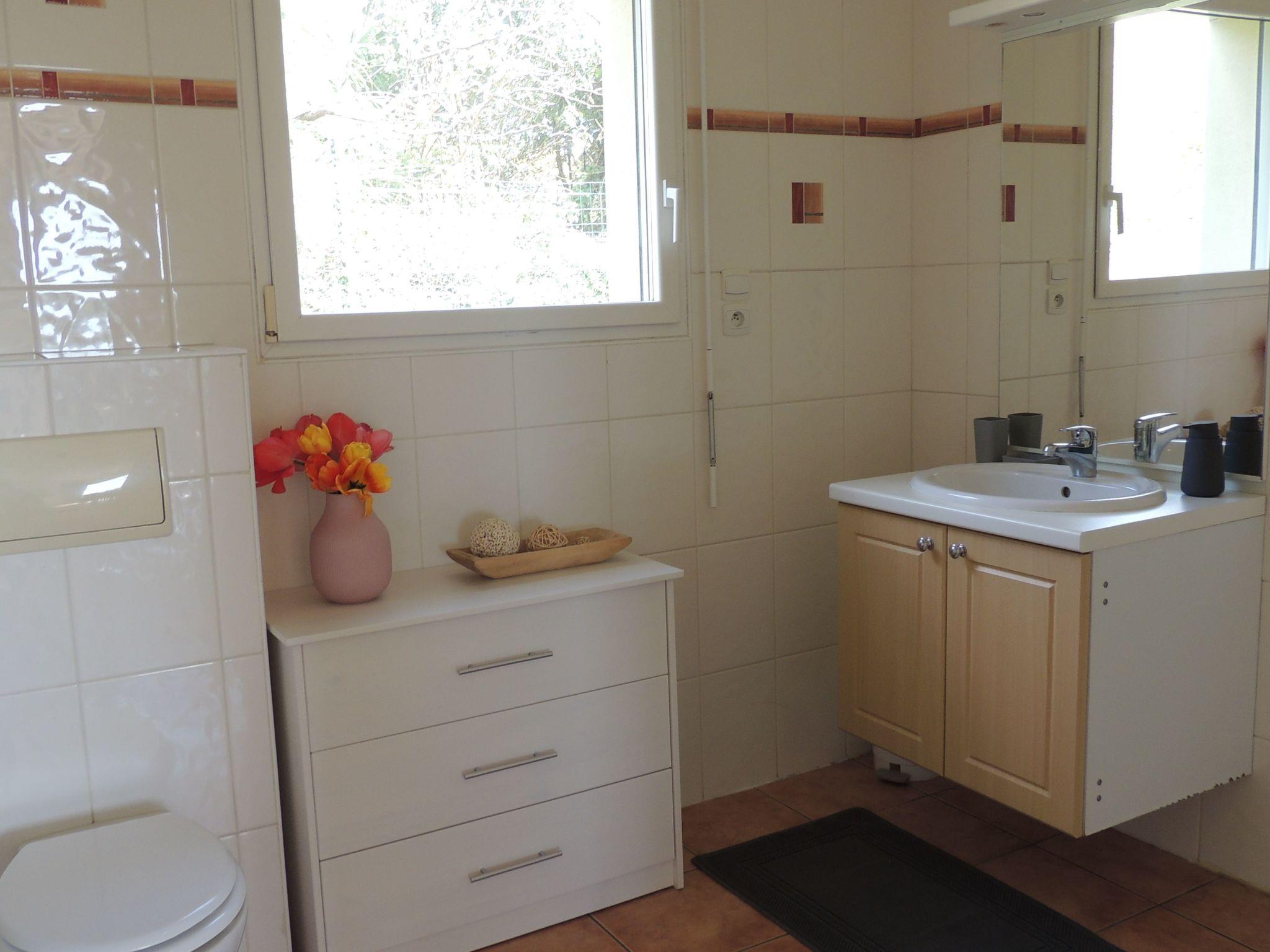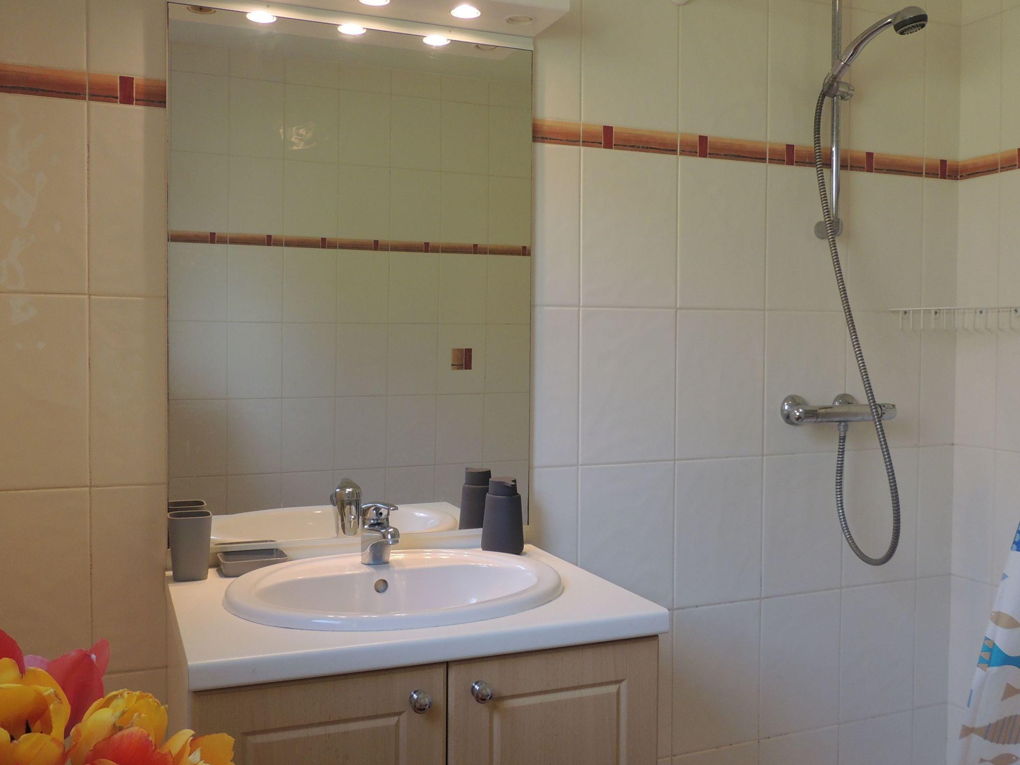 Enclosed garden of 600m2 with gate, wooden terrace of 26 m2 equipped with gas barbecue, teak table and 8 chairs. Parasol. Basket and football goal.