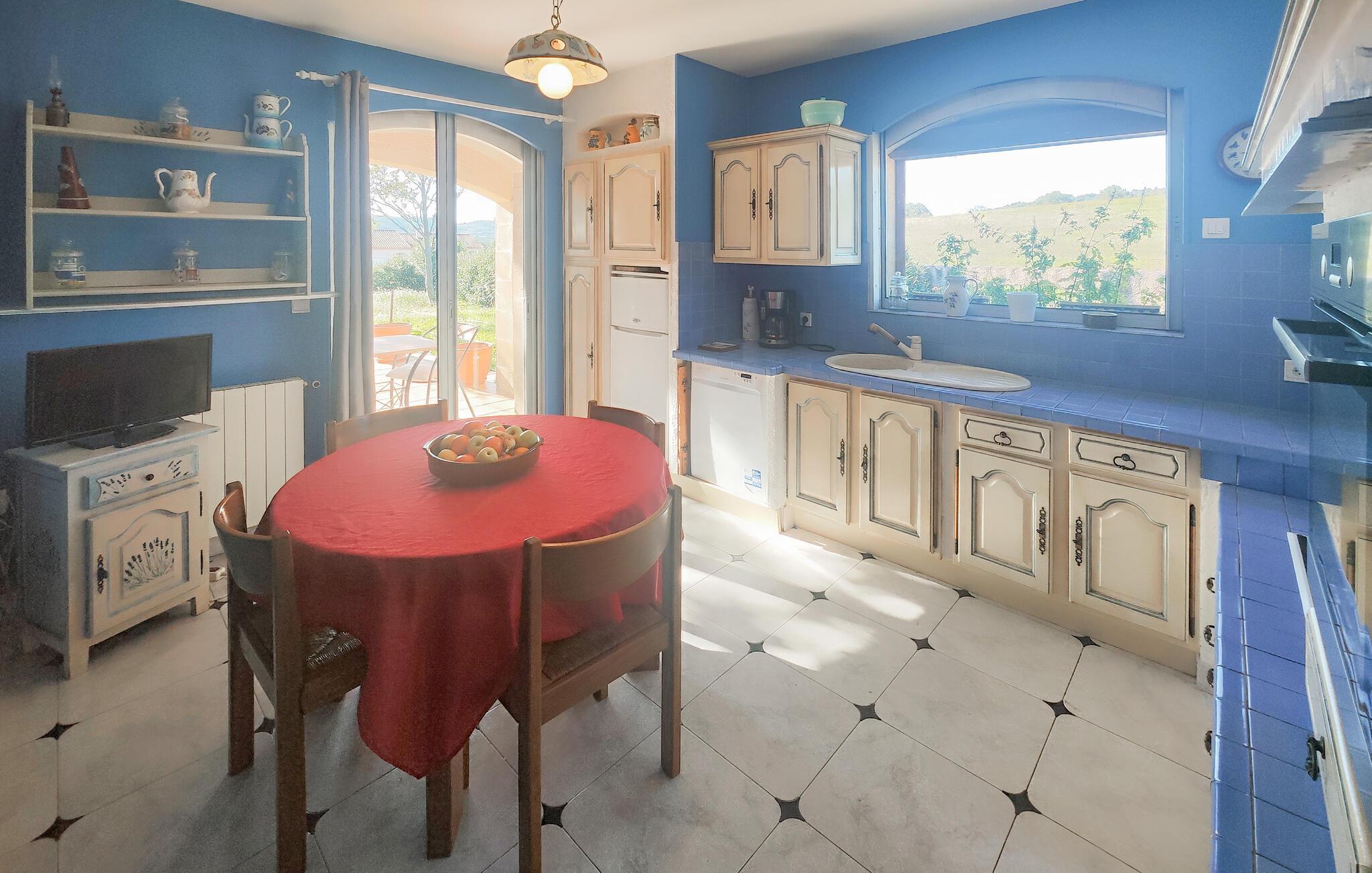 som ligger i det maleriske Languedoc-landskab er dette charmerende feriehus det ideelle sted at nyde uforglemmelige ferieøjeblikke med familie eller venner. Eksperimenter med urter fra Provence i det rustikke, fuldt udstyrede køkken og server resultaterne i den elegante spiseplads. Kig efter en spændende bog og gør jer godt tilpas i den hyggelige stue med panoramavindue.