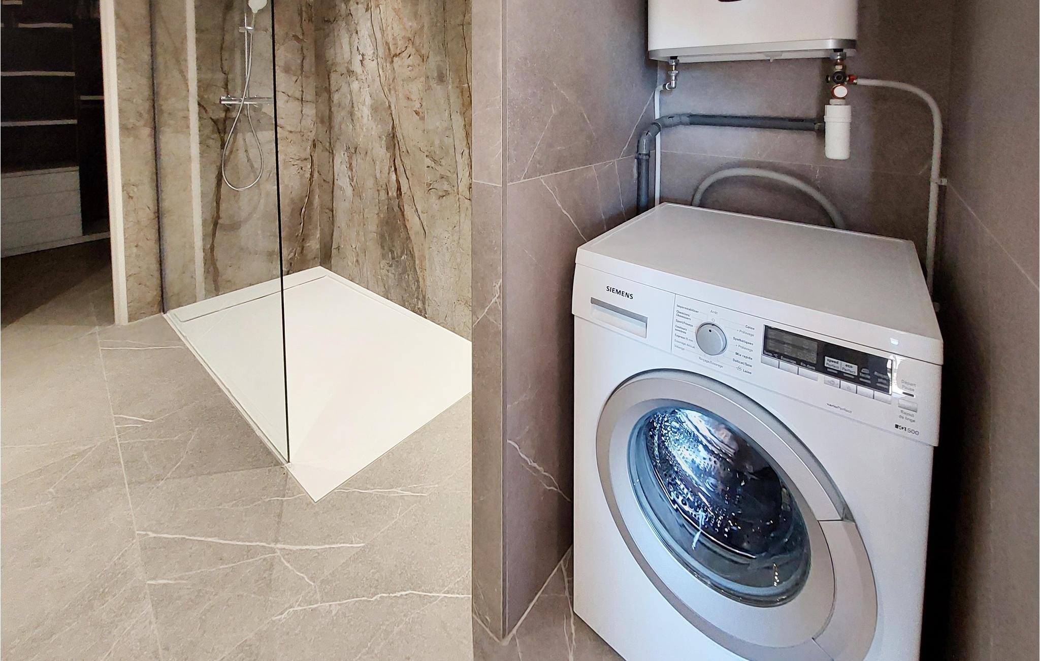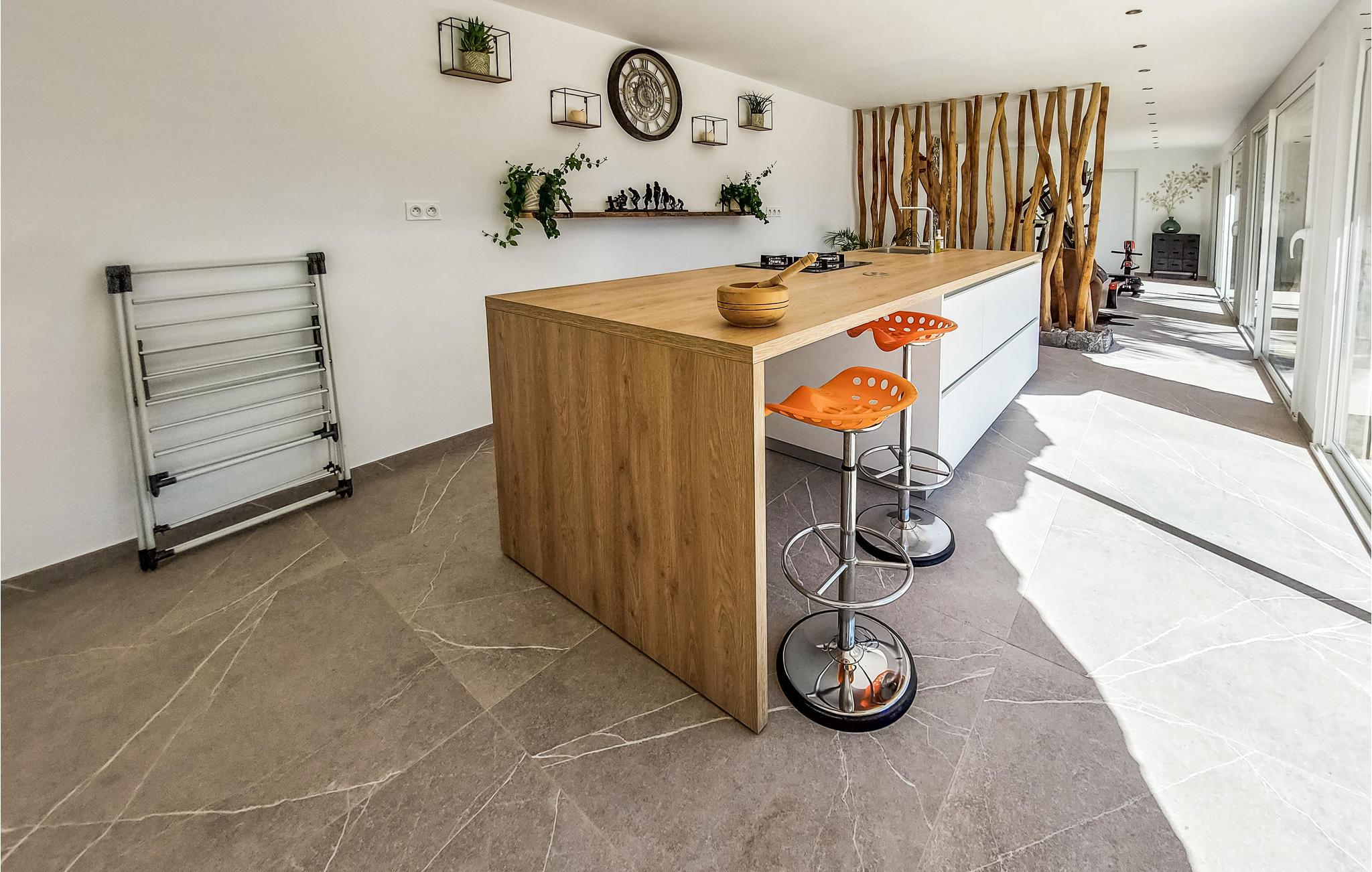 Den skønne terrasse med tilhørende pool leder tankerne hen på en klippehule, da ??husets ydervægge har en flot, ru stenoverflade. Her kan I bade og slappe af, lige når det passer jer. På øverste etage er der desuden en flot, stor terrasse.