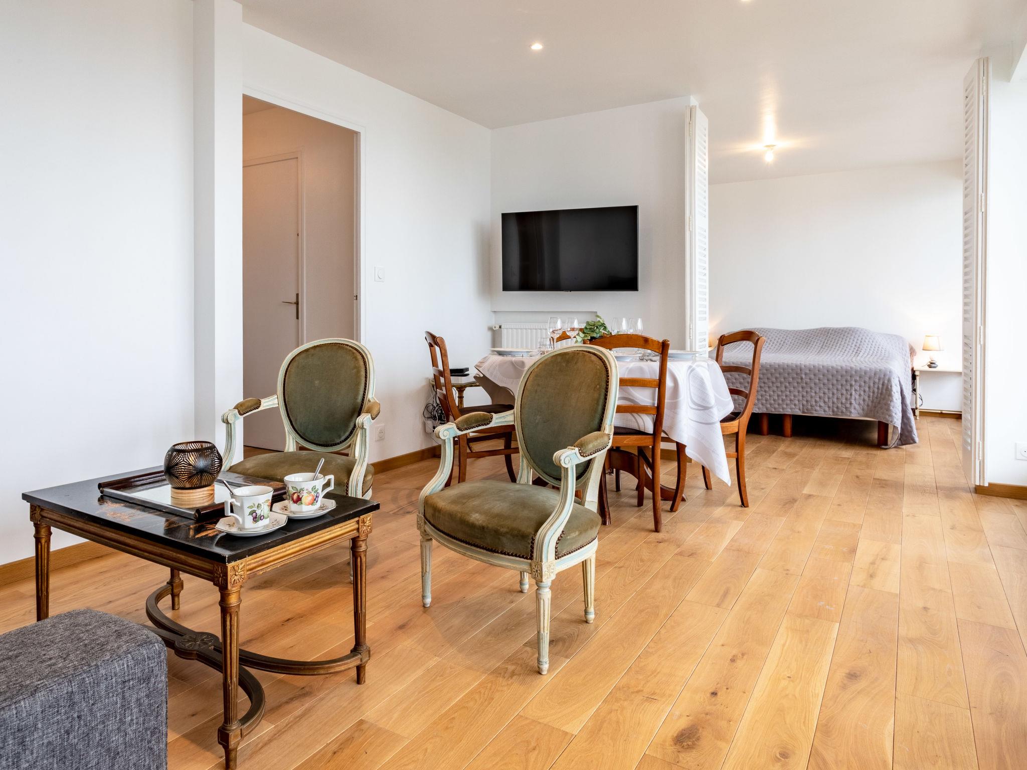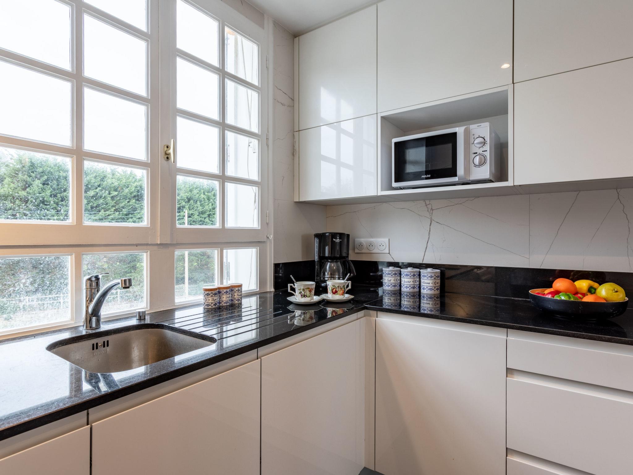 Trouville sur Mer: Residence "Le Parc Cordier". 700 m from the centre, on top of a hill, 800 m from the sea, 800 m from the beach. In the complex: lift. (4 steps). Shop 700 m, grocery 800 m, supermarket 900 m, restaurant 800 m, bus stop "Parc Cordier" 500 m, railway station "Deauville-Trouville" 1.4 km, indoor swimming pool 1.1 km, thermal baths "Trouville sur Mer" 1 km. Golf course (18 hole) 5.2 km, sailing school 1.5 km, tennis 750 m. Nearby attractions: Hippodrome Deauville-La Touques 3 km, Honfleur 15 km, Mémorial de Caen 56 km, Plage du débarquement d'Arromanches 75 km. The keys‘ handover takes place by the agency Interhome in Deauville.