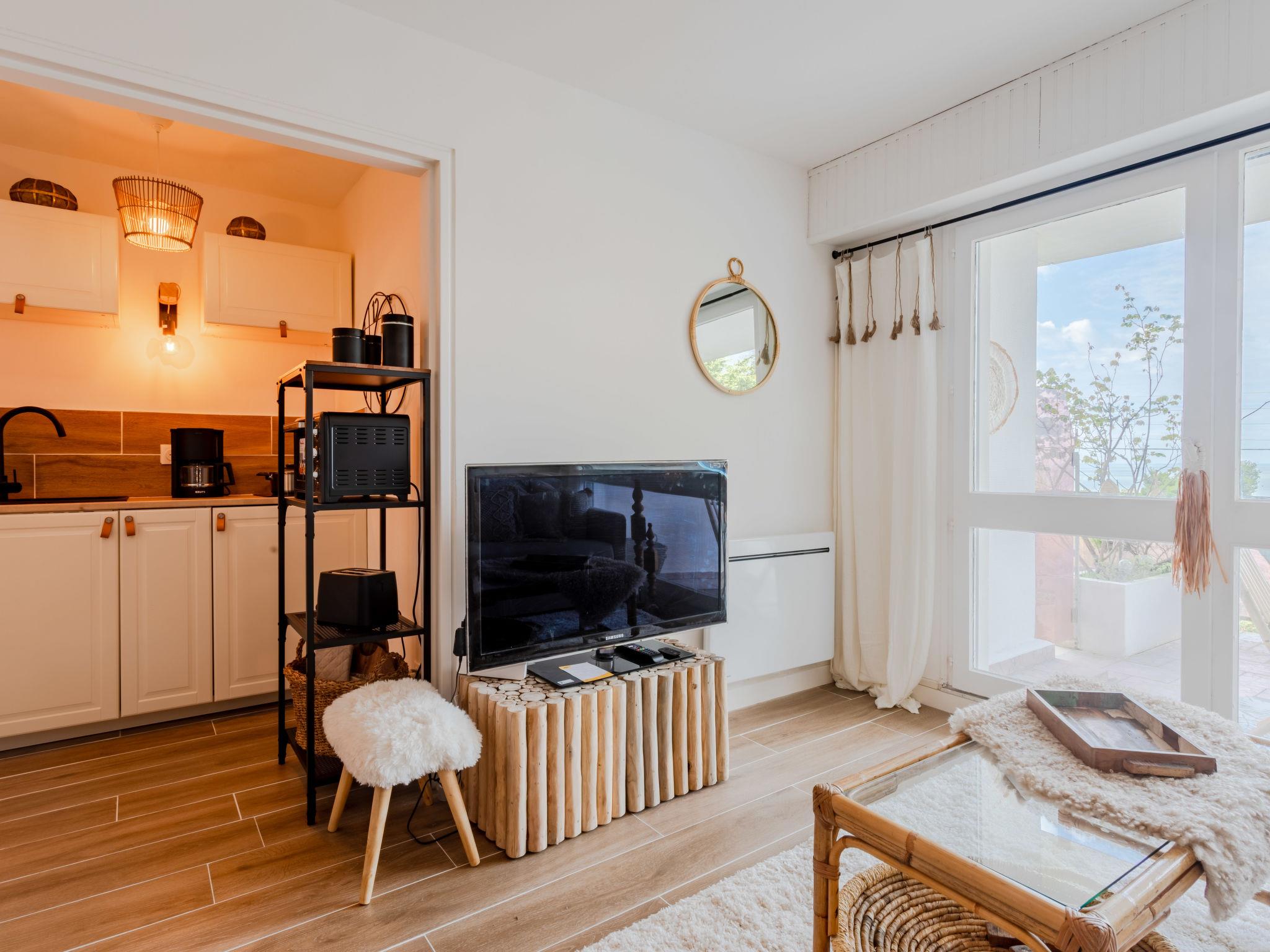 "Les Flots Bleus", 1-room studio 29 m2, on the ground floor, north-west facing position. Renovated in 2023: living/dining room with 1 double sofabed (140 cm, length 200 cm), TV (flat screen). Exit to the terrace. 1 open small room with 1 double bed (1 x 140 cm, length 200 cm). Kitchenette (2 ceramic glass hob hotplates, electric coffee machine). Shower/WC. Electric heating. Terrace 11 m2. View of the sea. Facilities: washing machine. Internet (WiFi, free). Parking (roofed), height 190 cm, width 253 cm. Please note: non-smokers only, parking space for small car only. Smoke alarm. Offer by a private individual according to Art. 155, IV of CGI. 14715000831FB