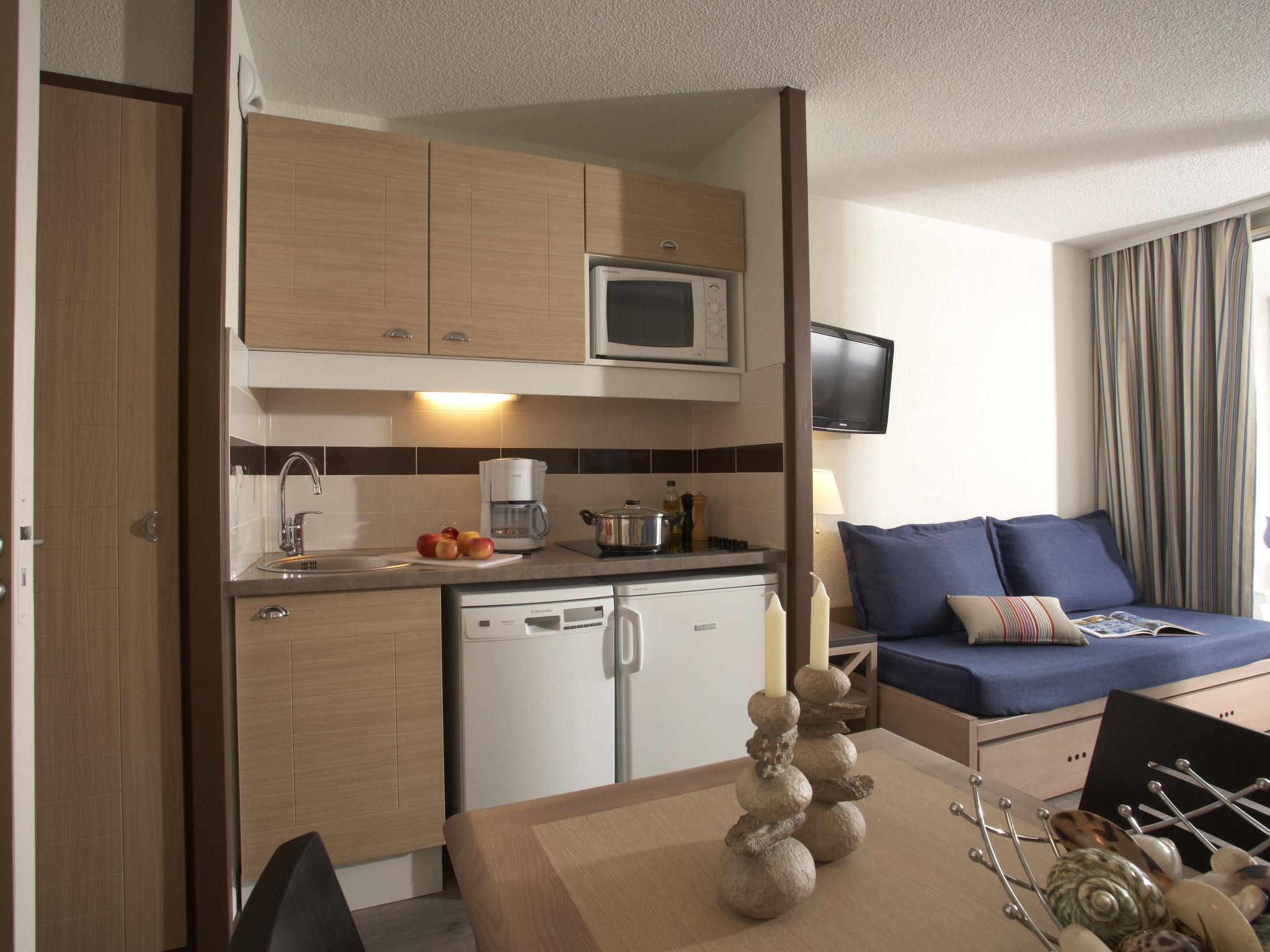 "Le Port", 1-room studio 25 m2. Beautiful furnishings: living/sleeping room with 2 sofabeds (80 cm, length 190 cm), TV (flat screen). Exit to the balcony. Sleeping alcove with 1 x 2 bunk beds (80 cm, length 190 cm). Kitchenette (dishwasher, 2 ceramic glass hob hotplates, toaster, kettle, microwave, electric coffee machine, combination microwave). Sep. WC, bath or shower. Electric heating. Small balcony. View of the port. Facilities: children's high chair, baby cot. Internet (WiFi, free). Please note: maximum 1 pet/ dog allowed. Smoke alarm. Offer by a commercial proprietor according to Art. 155, IV, CGI