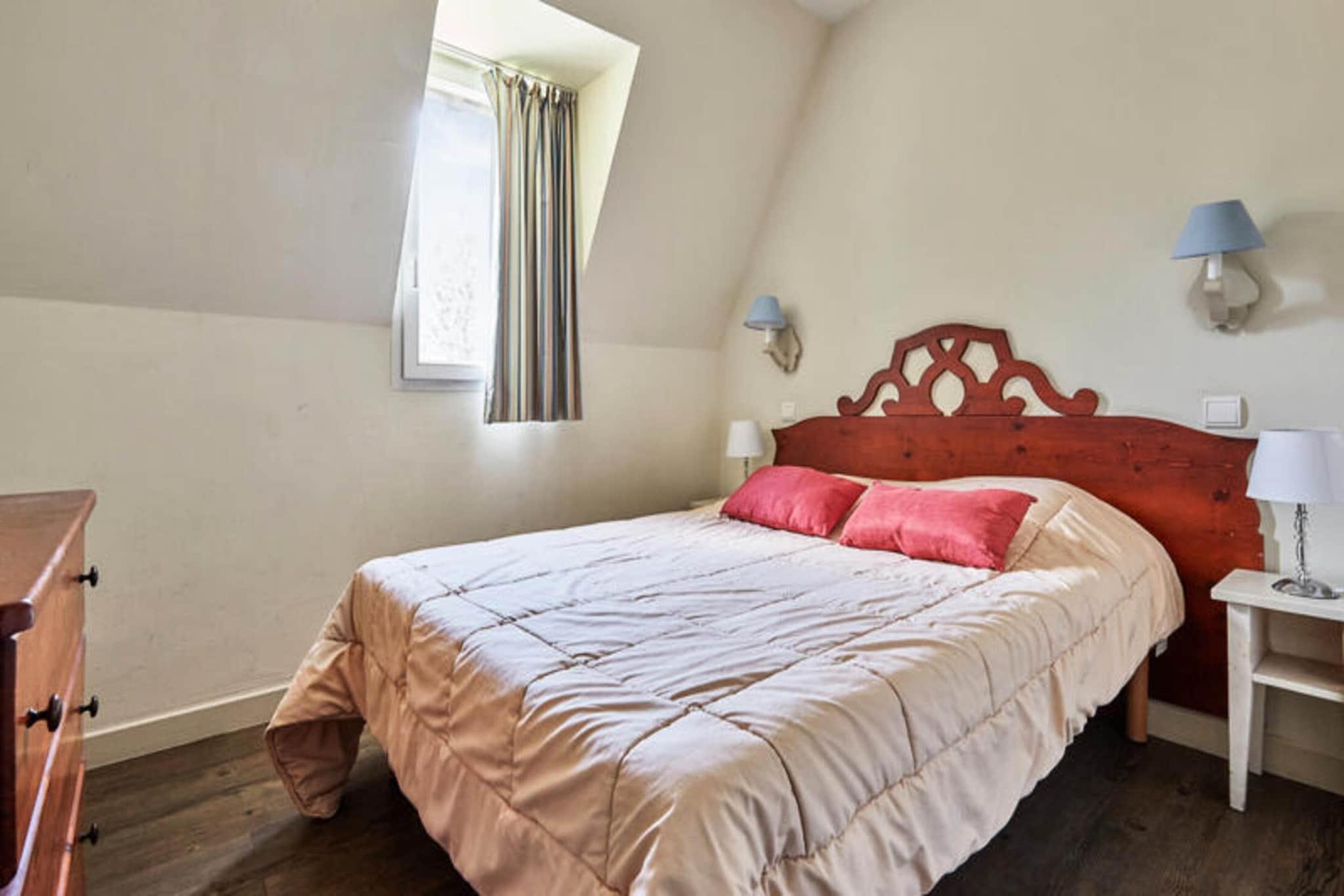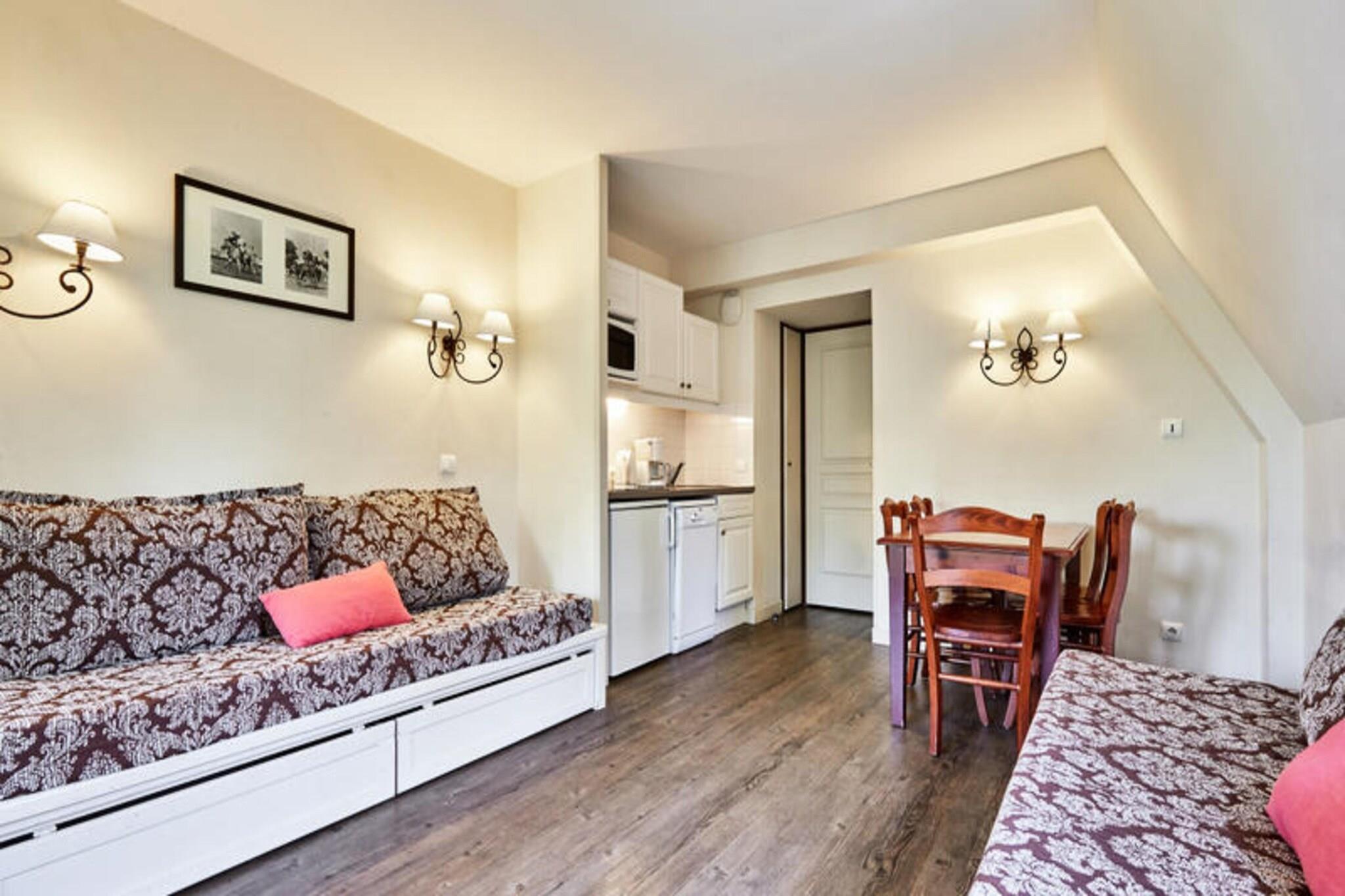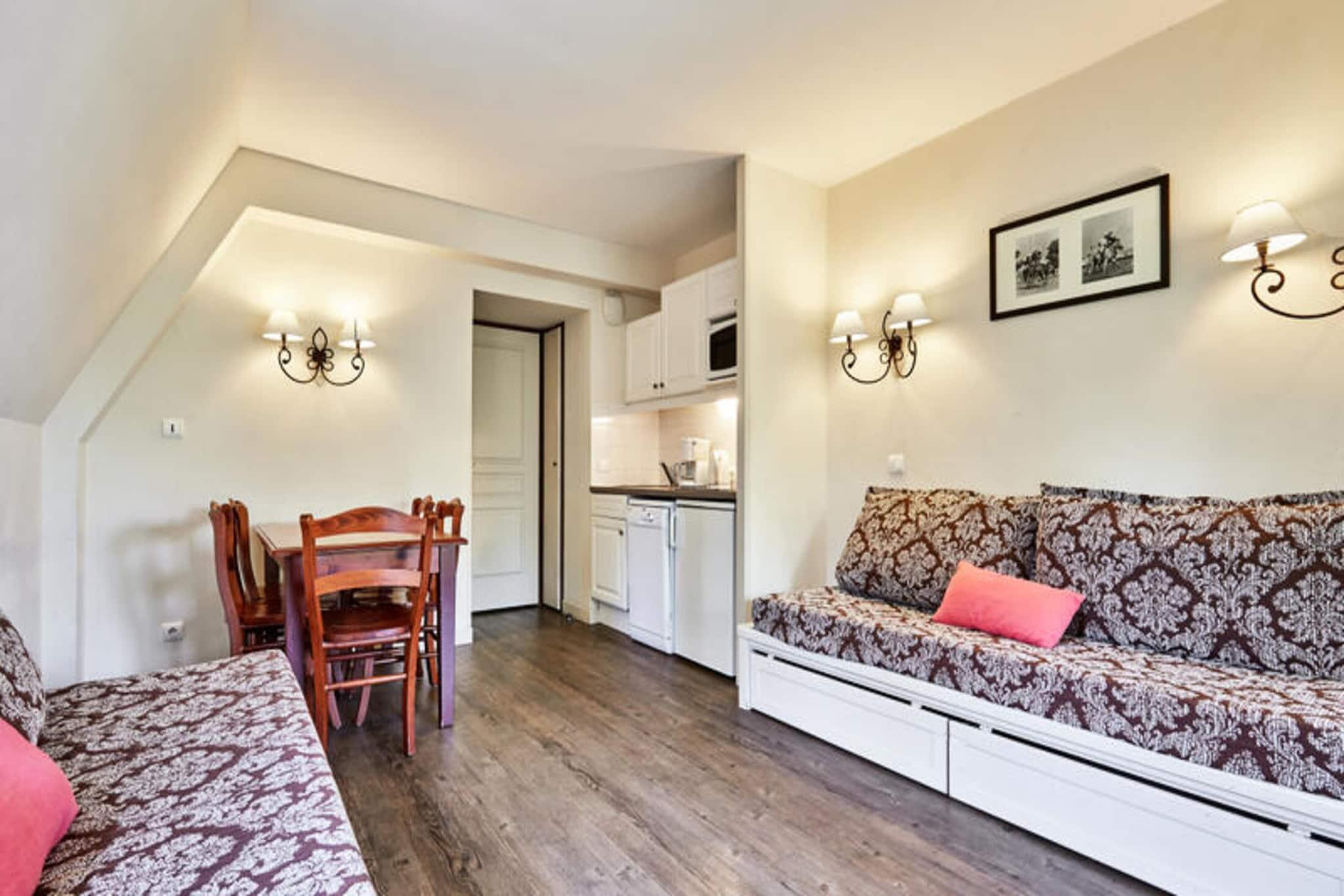 Denne etværelses lejlighed, beliggende i højderne af Deauville, tilbyder en rolig flugt midt i et naturligt miljø. Lejligheden har en stue med en sovesofa (sover to), et soveværelse med to enkeltsenge, et badeværelse med separat toilet og en balkon med bord og stole. Lejligheden har plads til op til fire gæster, og kæledyr er tilladt mod et ekstra gebyr. Gæsterne kan nyde adgang til en fælles opvarmet swimmingpool (åben fra 1. maj til 15. september) og gratis overdækket parkering. Denne lejlighed er beliggende nær Lucien Barrière-golfbanen og tilbyder muligheder for golf, ridning og udforskning af det nærliggende Deauville-område. Deauville-La Touques Hippodrome, der er berømt for sine hestevæddeløb, ligger i kort afstand. De berømte Deauville-planker ligger 2,5 km fra boligen, og det er en populær aktivitet at tilbringe en aften på Deauville Casino Barrière. Mens specifikke detaljer om cafeer og markeder ikke er nævnt, antyder beliggenheden i nærheden af ??butikker bekvem adgang til faciliteter. Lejligheden indeholder et køkkenområde åbent til stuen. Wi-Fi-adgang, adgang til spabadet, leje af babysæt, sengelinned, håndklæder og slutrengøring er alle tilgængelige mod et ekstra gebyr.
