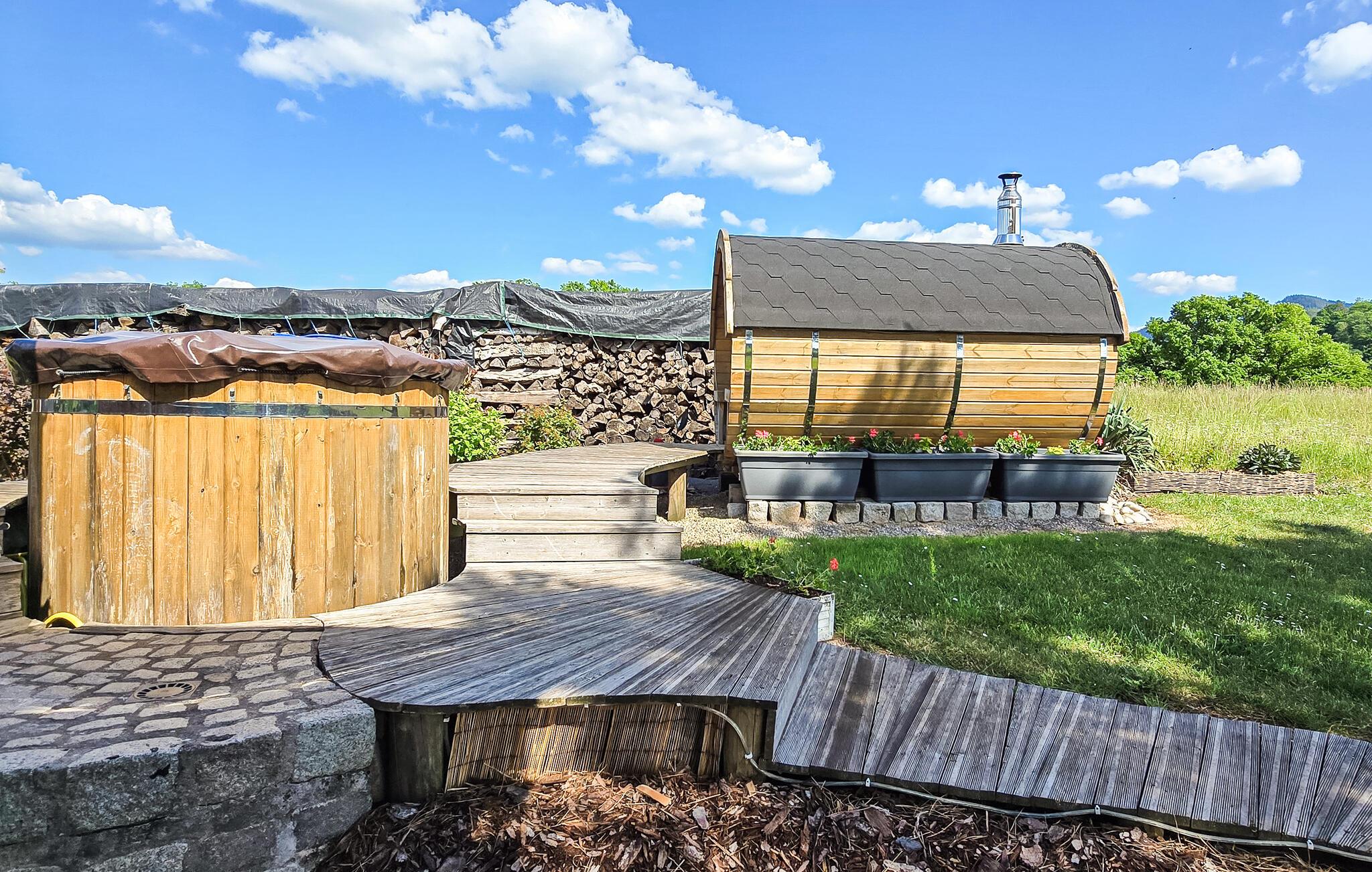 Dette fine lille feriehus ligger i rolige omgivelser på en bakketop i nærheden af landsbyen Denipaire, i Vogesernes nordlige del, 10 km nord for Saint Dié. Med "Parc Naturel Régional des Ballons des Vosges" har I mange muligheder for smukke vandringer og cykelture. Anbefalelsesværdig er også den smukke by Colmar med sine bindingsværkshuse og gamle kirke med orgel. I kan også smage på Elsass’ lækre vine. Denne hyggelige, fritliggende bolig ligger tæt på landsbyen og 25 m fra ejernes hus. Herfra er der en flot udsigt over bakker og marker. På forespørgsel kan I leje to elcykler af husets ejer. Mod betaling kan I benytte et vildmarksbad. Saunaen er indrettet i en trætønde, med vindue og udsigt. Det tager en time at varme op.