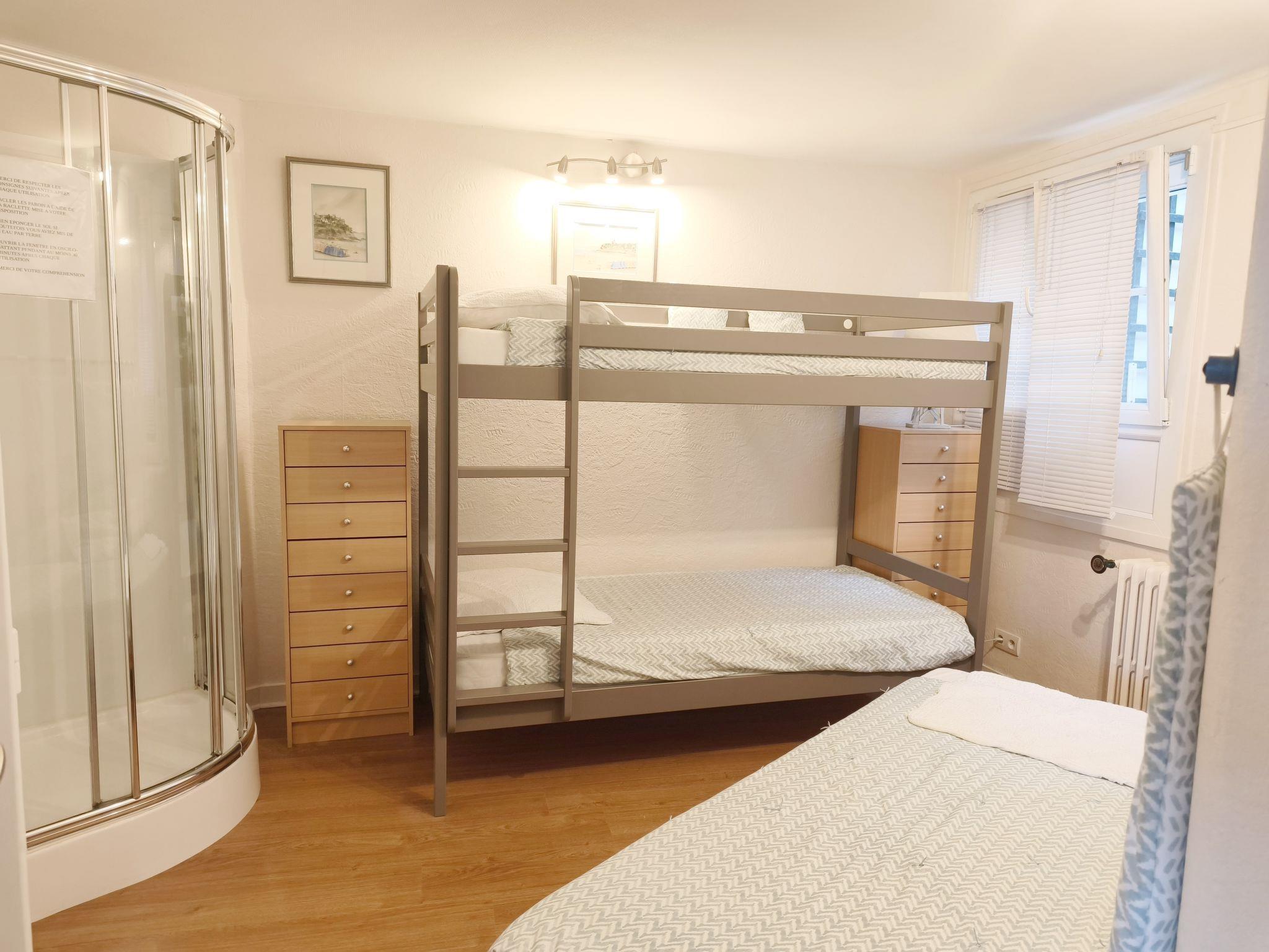 5-room apartment 104 m2 on 2 levels, on the ground floor. Entrance hall. Living/dining room with TV (flat screen). 1 room, window onto the courtyard with 2 beds (90 cm, length 190 cm), shower. Open kitchen (4 hot plates, oven, dishwasher, toaster, kettle, microwave, electric coffee machine, Capsules for coffee machine (Nespresso) extra). Sep. WC. Upper floor: 1 open room with 1 french bed (1 x 180 cm, length 200 cm). 1 open room with 1 french bed (1 x 180 cm, length 200 cm). 1 room, window onto the courtyard with 1 french bed (1 x 180 cm, length 200 cm). Bath/WC. Gas heating. Beautiful view of the sea. Facilities: washing machine. Internet (WiFi). Parking (3 cars). Please note: non-smokers only. Smoke alarm. Please note the mezzanine upstairs bedrooms have a 60 cm high railing.