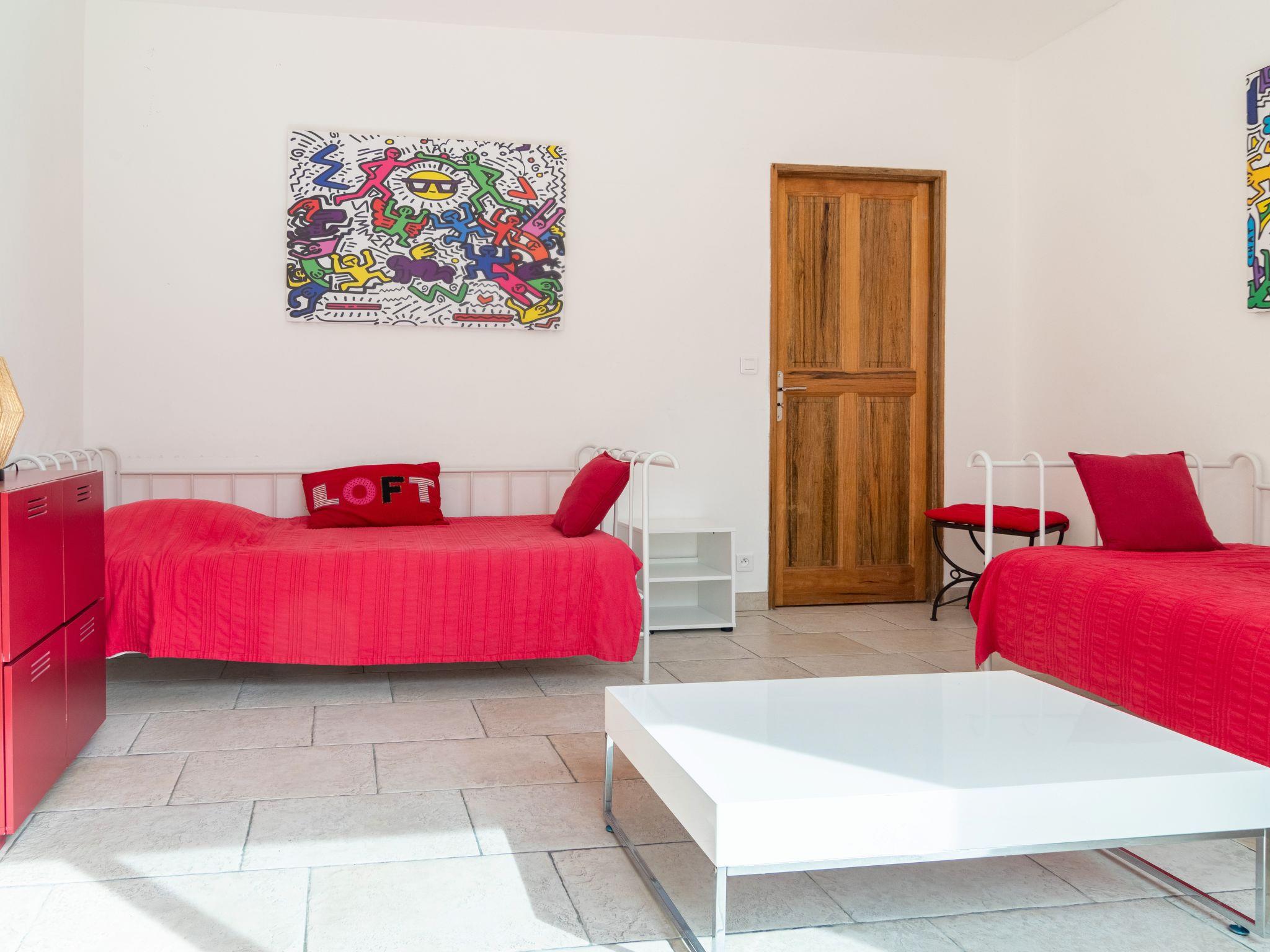 "L'Esquirou", 4-room house 180 m2 on 2 levels. Bright, modern and tasteful furnishings: living/dining room with dining table, satellite TV and DVD. Exit to the terrace. 1 room with 1 french bed (160 cm), shower and air conditioning. 1 room with 2 beds. Open kitchen (oven, dishwasher, 5 induction hot plates, toaster, kettle, microwave, freezer, electric coffee machine). Exit to the terrace. Shower/WC. Upper floor: 1 room with 1 french bed (160 cm), air conditioning. Bathroom, sep. WC. Gas heating. Terrace roofed. Terrace furniture, barbecue, deck chairs (4). View of the garden. Facilities: washing machine, dryer, iron, baby cot. Internet (WiFi, free). Please note: non-smoking house. Maximum 2 pets/ dogs allowed. Smoke alarm.