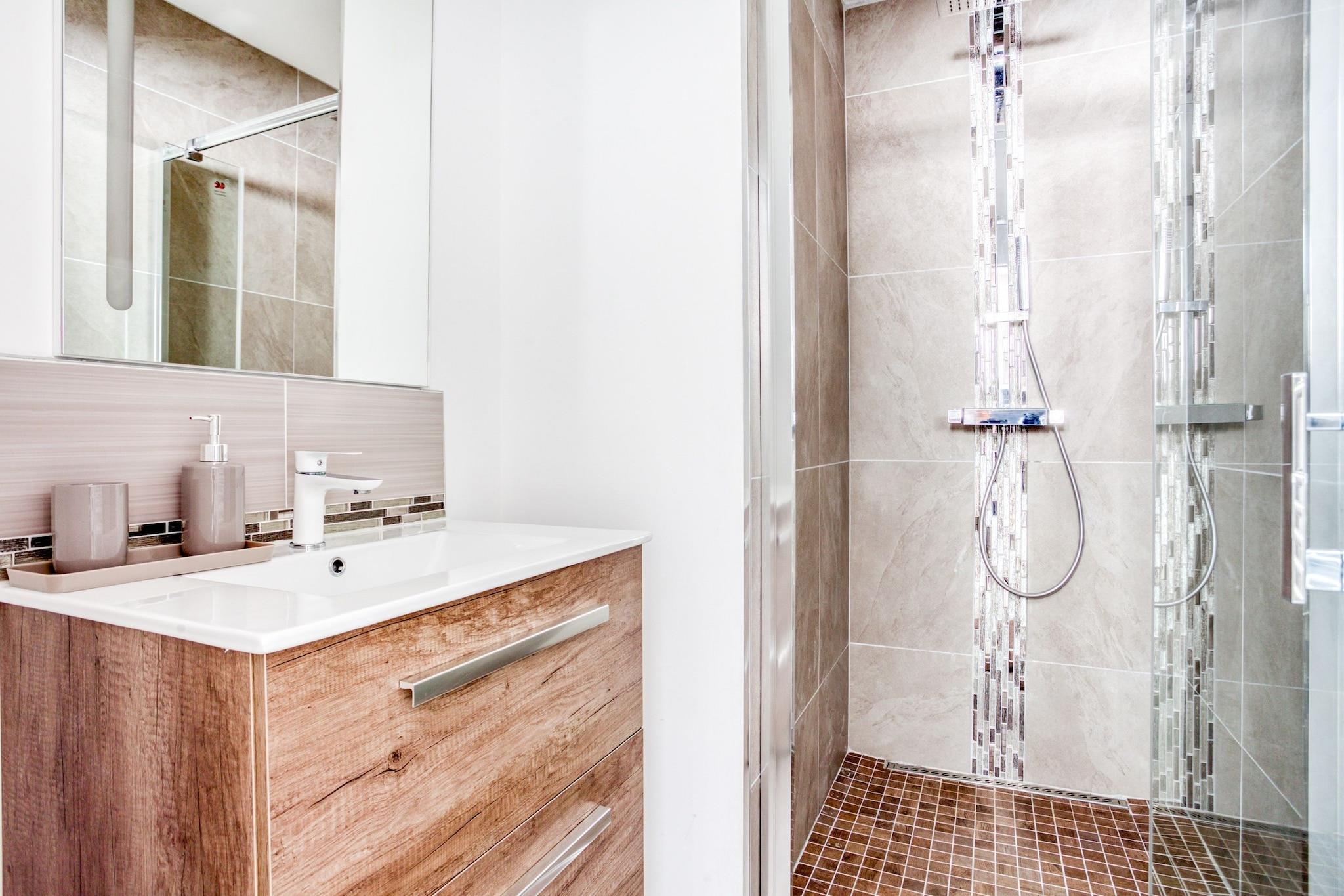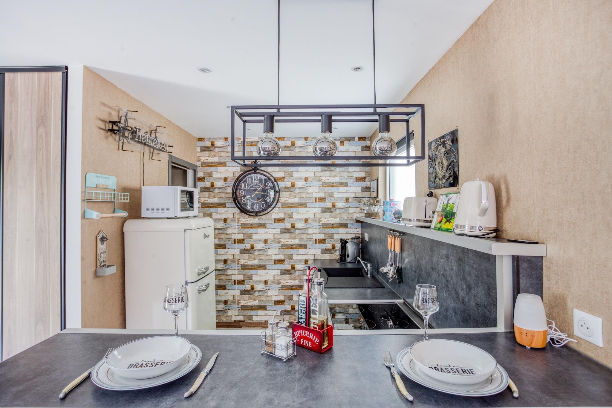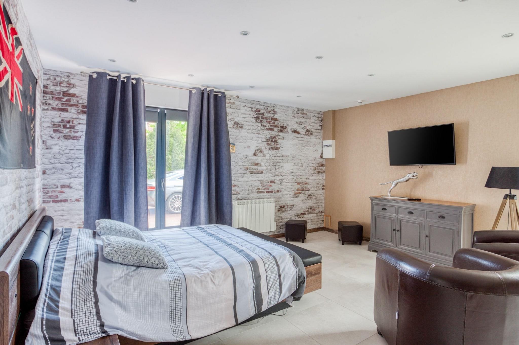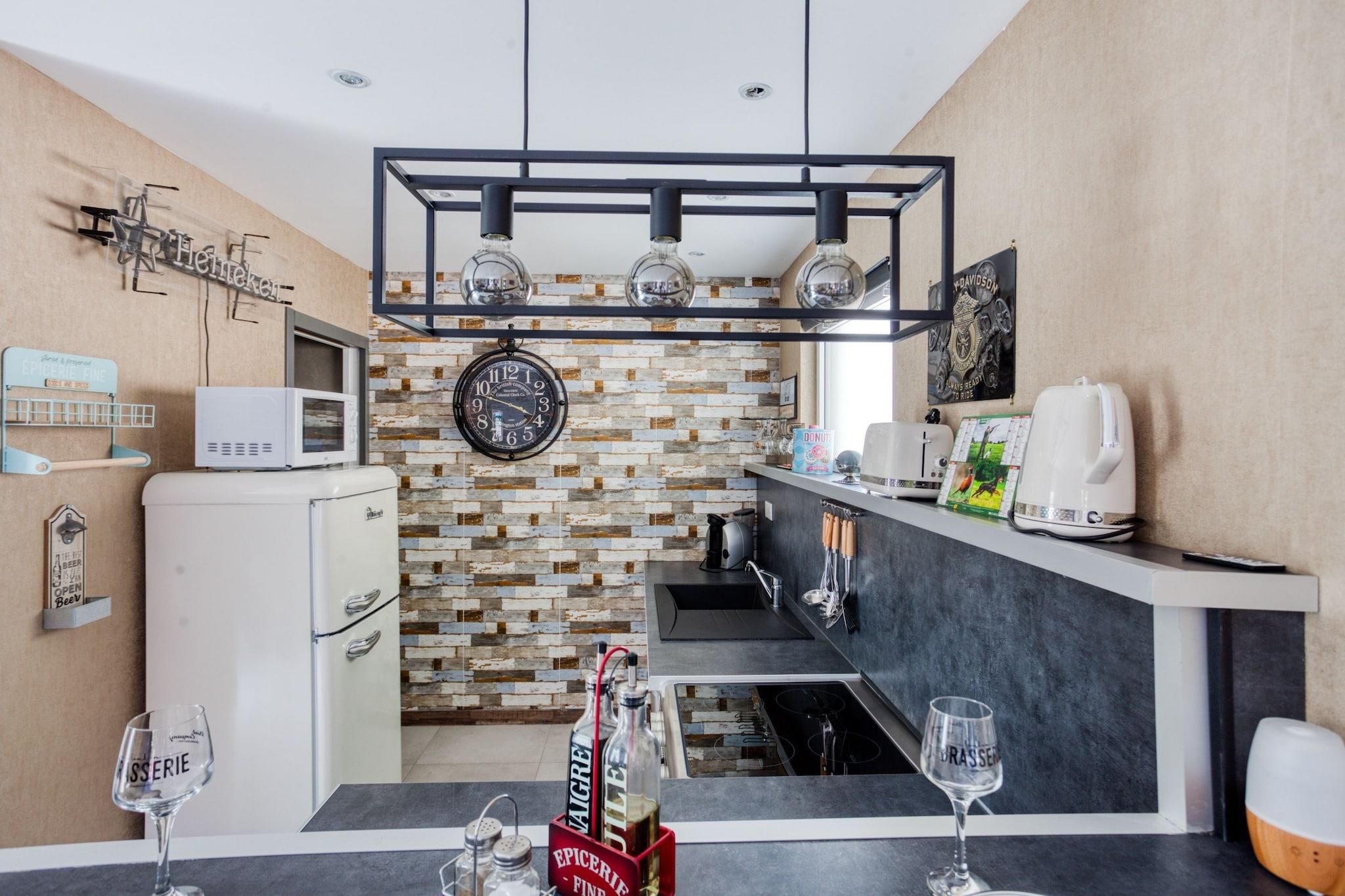 Stueetage: (åbent køkken(bar, elkedel, brødrister, komfur, kaffemaskine, ovn, mikrobølgeovn, køle-fryseskab), Stue/soveværelse(køjeseng(140 x 190 cm), Fjernsyn, pejs, sofahjørne), badeværelse(bruser, håndvask), toilet) terrasse(privat)