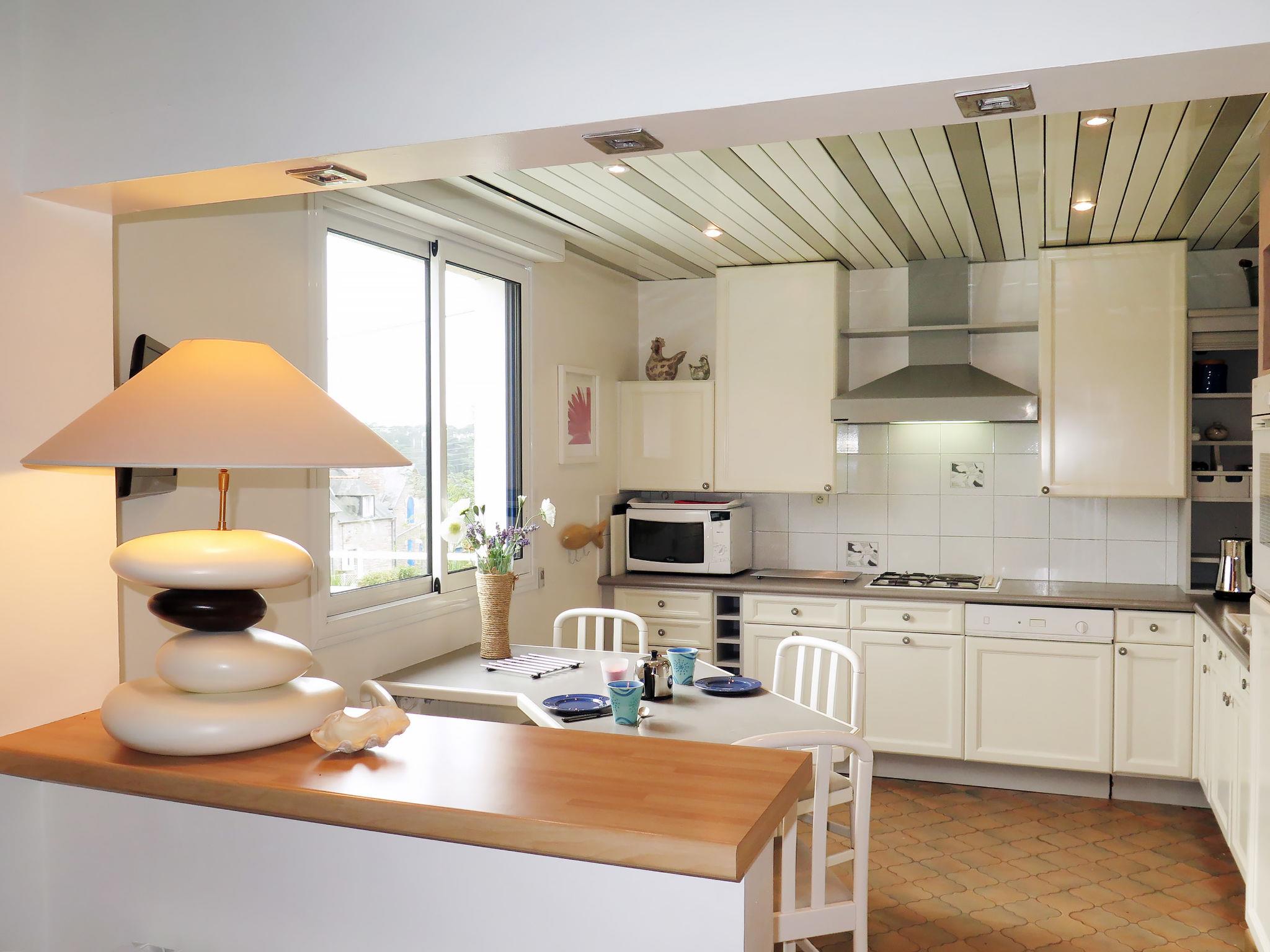 "Etoile de Mer", 4-room house 120 m2 on 3 levels, on the upper ground floor. Object suitable for 6 adults. Beautiful and cosy furnishings: living/dining room with dining table, TV, radio and DVD. Exit to the terrace. Open kitchen (1 hot plate, oven, dishwasher, 2 gas rings, toaster, kettle, microwave, freezer, electric coffee machine) with small dining table. Bathroom, sep. WC. On the lower ground floor: shower, sep. WC. Oil heating. Upper floor: 1 room with sloping ceilings with 1 french bed (140 cm, length 190 cm). 1 room with sloping ceilings with 1 french bed (160 cm, length 200 cm). 1 room with sloping ceilings with 1 bed (90 cm, length 190 cm), 1 french bed (140 cm, length 190 cm). Oil heating. Terrace 30 m2, south facing position. Terrace furniture, barbecue, deck chairs (3). Distant view of the sea. Facilities: washing machine, dryer, iron, baby cot. Internet (WiFi, free). Please note: non-smoking house. Maximum 1 pet/ dog allowed. Smoke alarm. Bed layout is flexible. There are more sleeping options available than the maximum number of people allowed which may, however, not be exceeded.