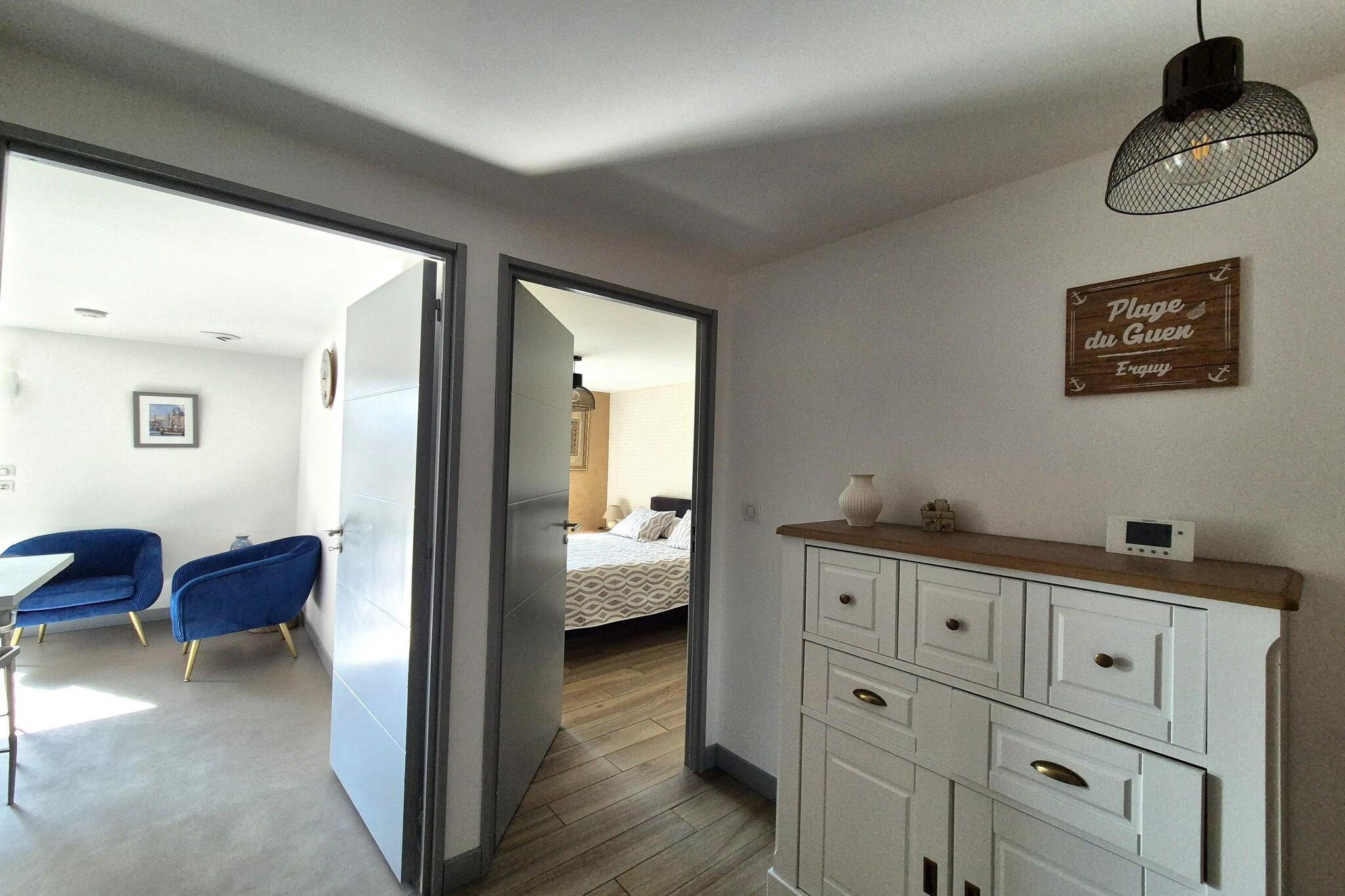 Denne charmerende lejlighed i stueetagen ligger kun en kort gåtur fra stranden og tilbyder ideelle rammer for en romantisk ferie. Den er omhyggeligt designet til to personer og tilbyder et hyggeligt og komfortabelt sted at slappe af, hvor hver eneste detalje er omhyggeligt gennemtænkt for at sikre et mindeværdigt ophold. Højdepunktet er den smukke sydvendte terrasse, perfekt til at nyde solen når som helst, nyde et glas vin eller blot slappe af i den friske havluft. Beliggende kun 800 meter fra kysten og de naturskønne GR34-vandrestier, inviterer dette fredelige tilflugtssted til udforskning af de fantastiske Cap d'Erquy og Cap Fréhel. I nærheden finder du livlige lokale markeder og en række vilde eller familievenlige strande, der passer til ethvert humør. Det rolige miljø gør det til en fremragende base for at udforske den naturlige skønhed og de charmerende landsbyer i regionen. Yderligere faciliteter inkluderer privat parkering og rolige omgivelser, der sikrer bekvemmelighed og privatliv under hele dit ophold. Uanset om du søger afslapning eller eventyr, kombinerer denne dejlige lejlighed komfort, privatliv og nærhed til naturen, hvilket gør den til det perfekte valg for en mindeværdig kystferie.