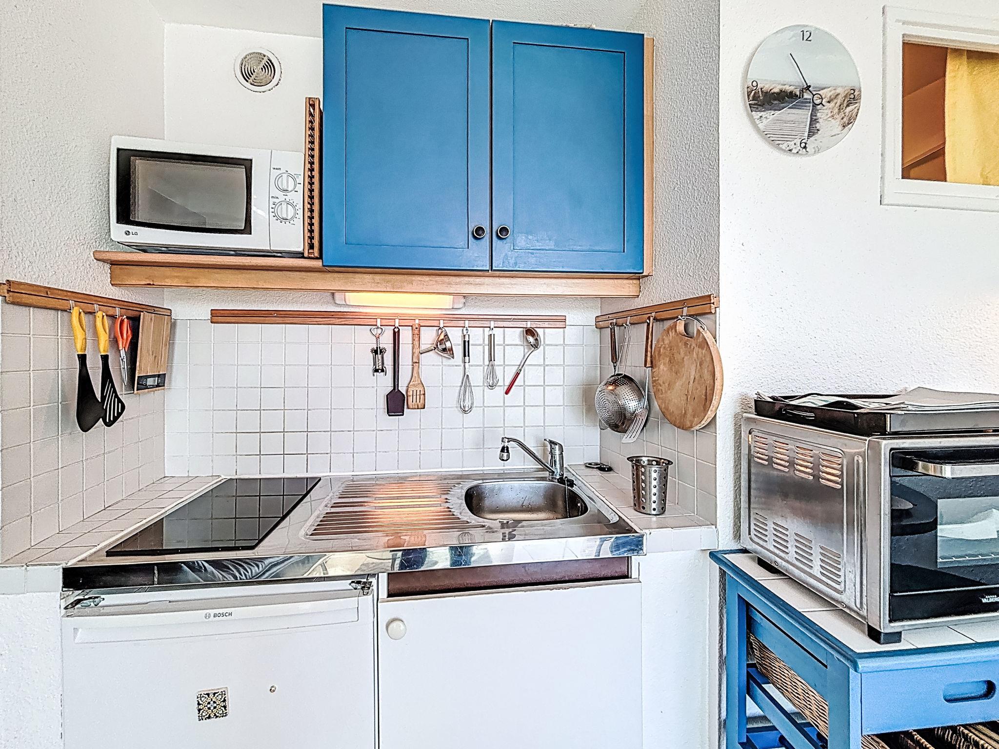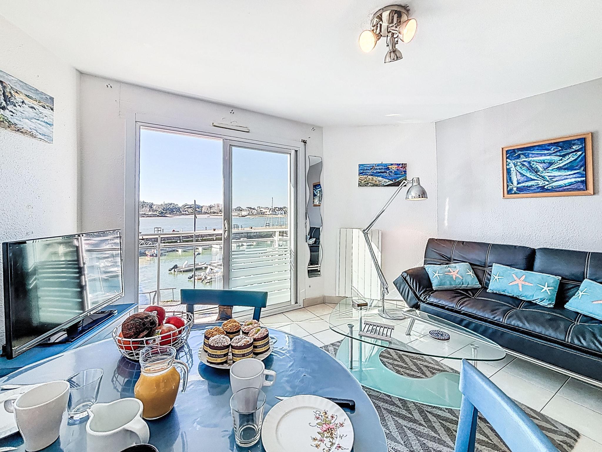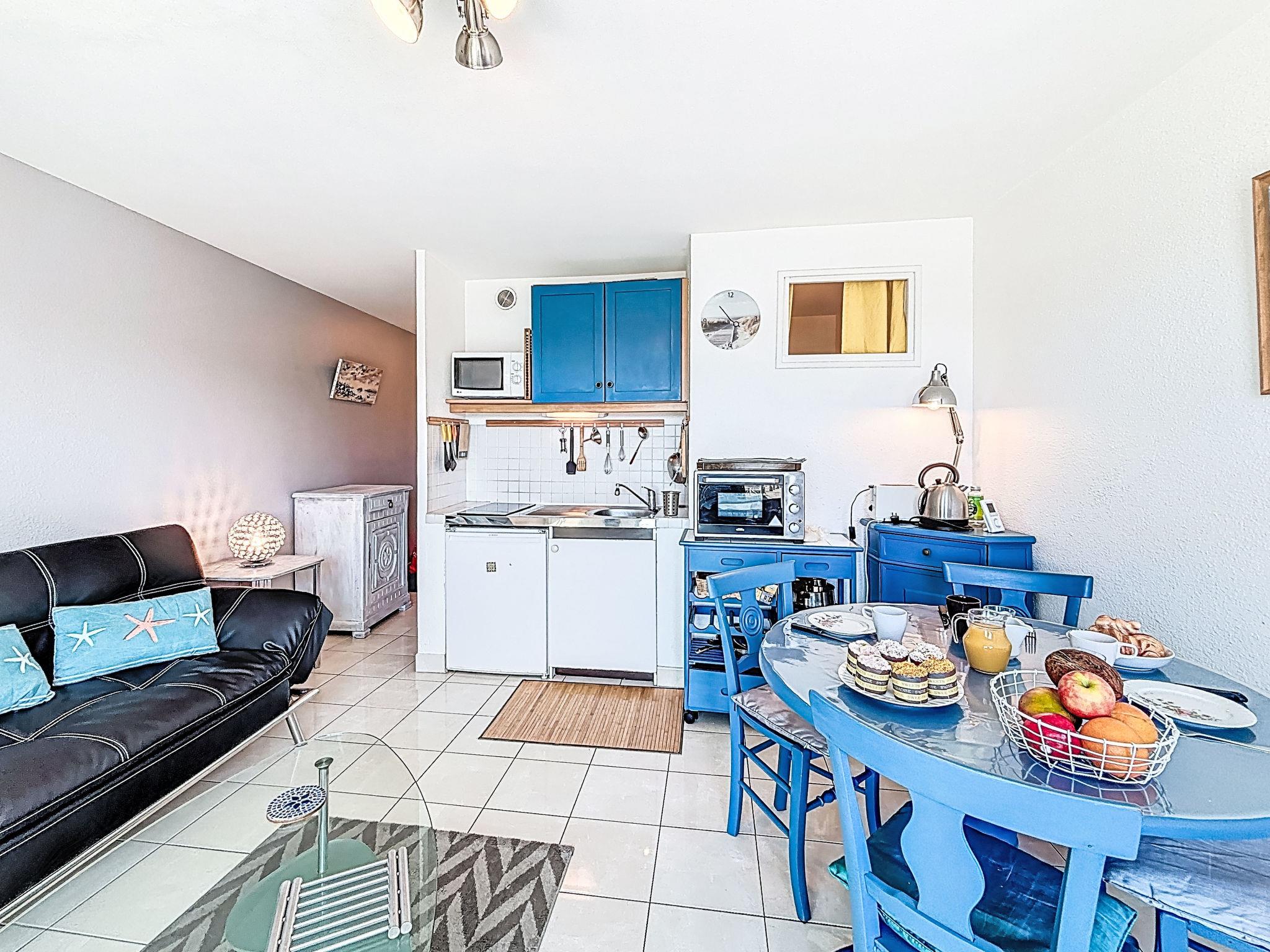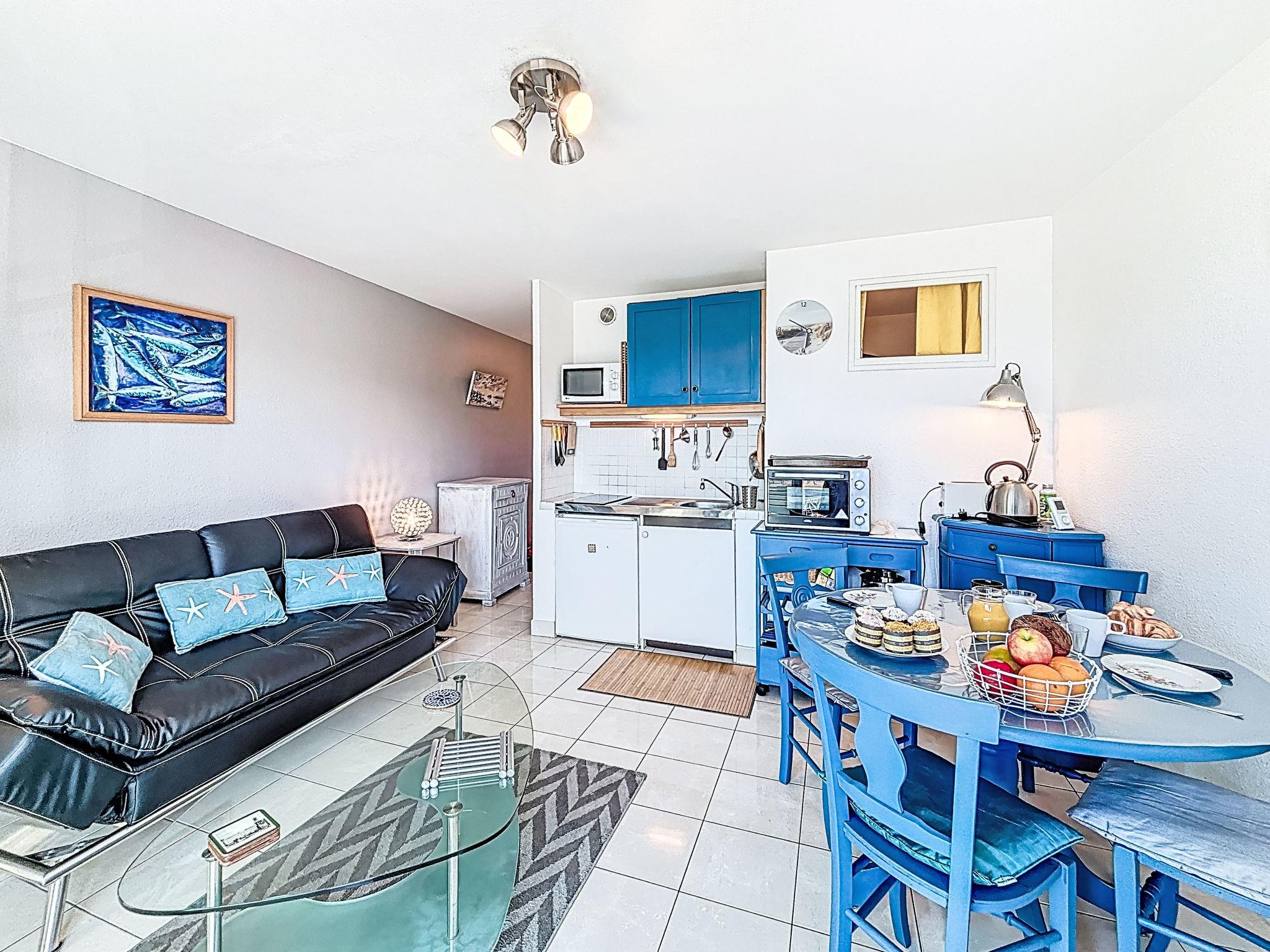 "Appartement La Frégate", 2-room studio 35 m2. Comfortable furnishings: living/dining room with 1 sofabed (140 cm, length 190 cm), TV (flat screen). Sleeping alcove with 1 bed (120 cm, length 190 cm). Kitchen (2 hot plates, oven, toaster, microwave, electric coffee machine). Bath/WC. Electric heating. View of the sea. Facilities: washing machine. Please note: non-smokers only. Smoke alarm. Offer by a private individual according to Art. 155, IV of CGI. 56055000013GD
