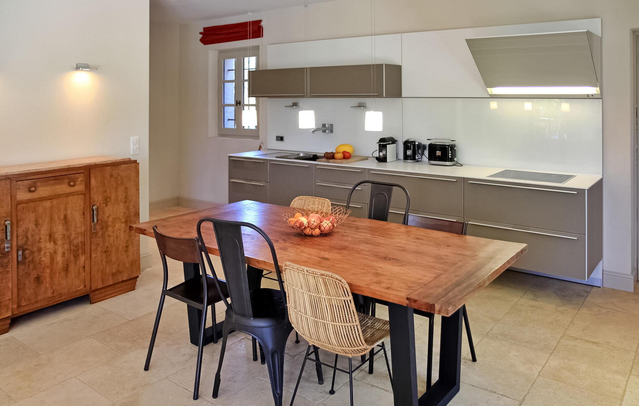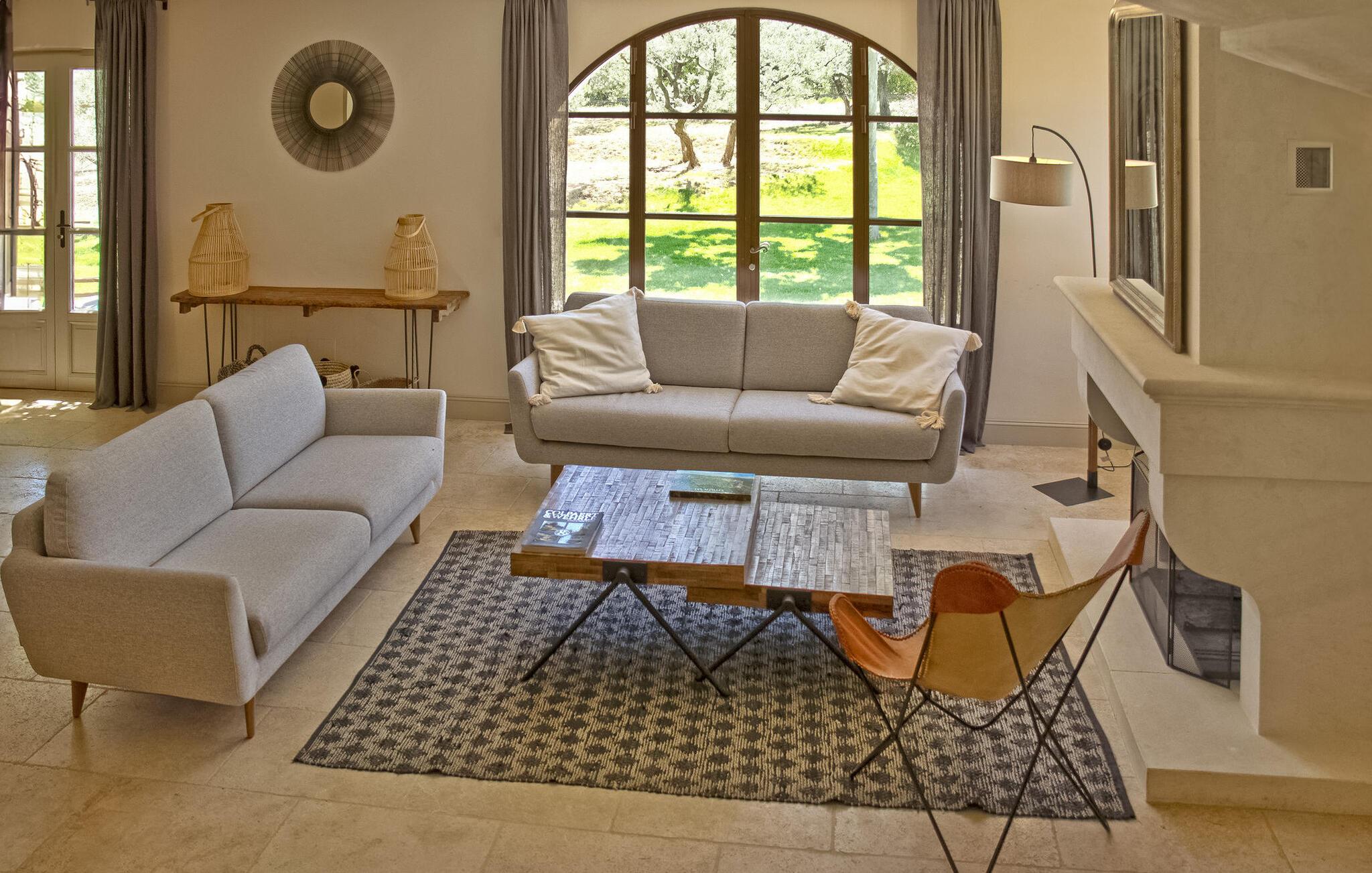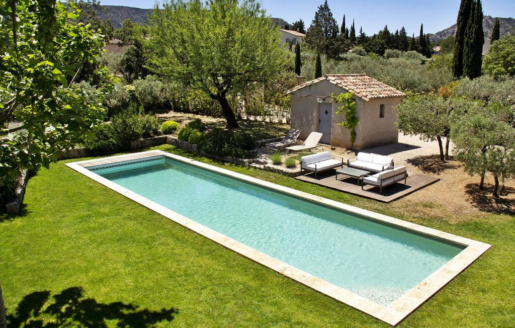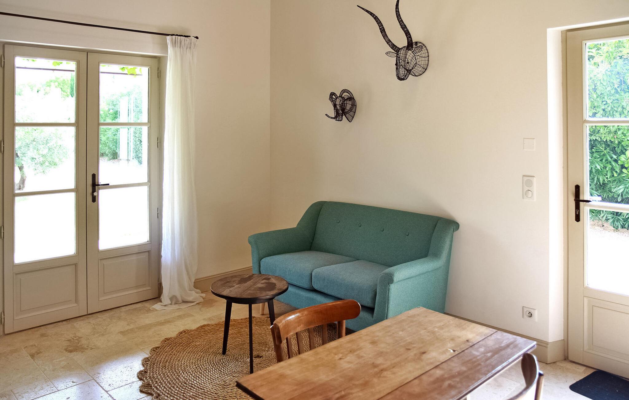 hjertet af Alpilles ligger en charmerende villa, bekvemt opdelt i to separate dele. Dette dejlige feriehus, beliggende i et roligt boligområde kun en kort gåtur fra Eygalières, giver nem adgang til lokale butikker og restauranter. Denne villa har et forfriskende gulvkølesystem overalt. Den første del af huset inviterer gæsterne ind i en indbydende stueetage med stue, spiseplads og et veludstyret åbent køkken med moderne bekvemmeligheder. Ovenpå er der komfortable sovepladser og fælles badefaciliteter. Den anden del af villaen henvender sig til mindre grupper og giver et stueetage med køkkenplads, soveværelse og separate sovearrangementer i et loftsrum. Udenfor byder ejendommen på en smukt anlagt have med olivenlund, en overdækket terrasse perfekt til udendørs spisning og en grillplads. Højdepunktet er den indbydende opvarmede pool, et fredeligt tilflugtssted for afslapning. Denne villa giver en fredfyldt flugt til en ferieoplevelse i Alpilles-regionen, og tilbyder en rengøring midt på ugen for ekstra bekvemmelighed. Bemærk venligst, at selvom denne villa ikke har aircondition, sikrer den et behageligt ophold med sit gulvkølesystem. Den charmerende landsby Eygalières med butikker og restauranter og marked fredag morgen ligger i gåafstand fra huset. Eygalières er en livlig landsby i hjertet af Alpilles Naturpark.
