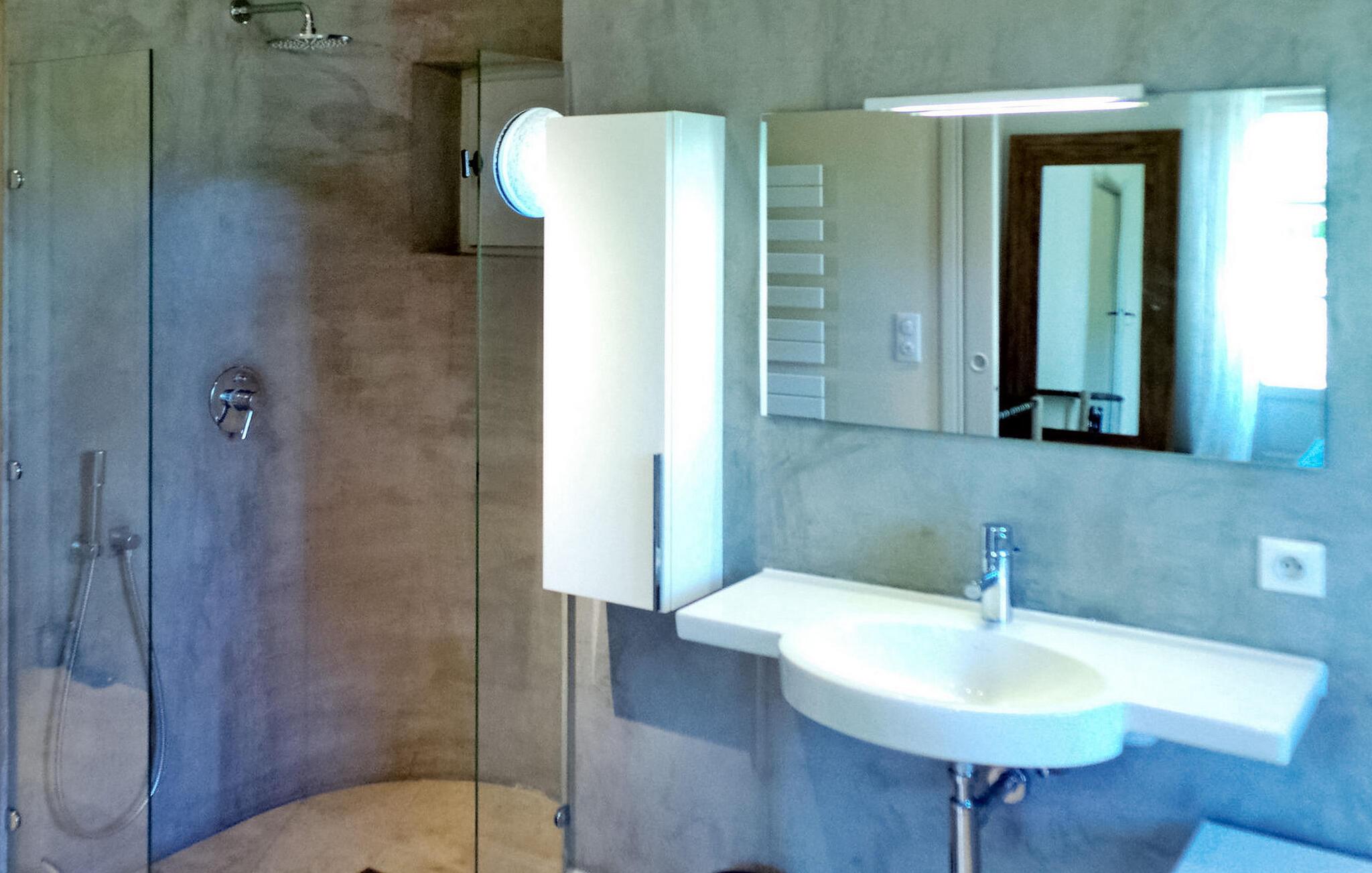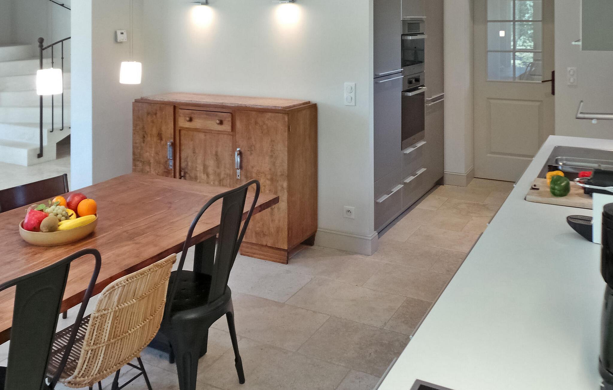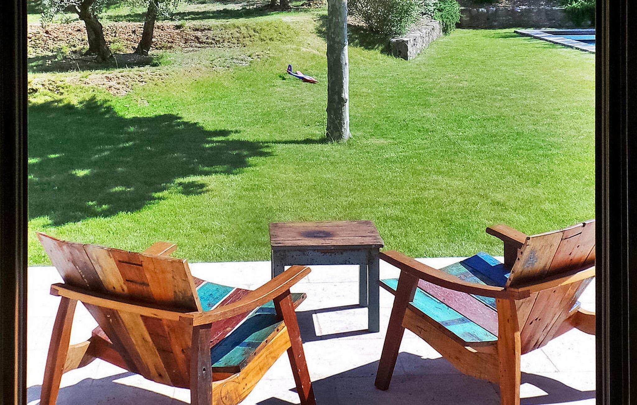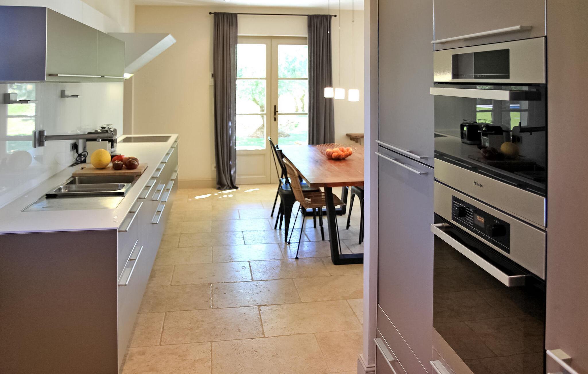 hjertet af Alpilles ligger en charmerende villa, bekvemt opdelt i to separate dele. Dette dejlige feriehus, beliggende i et roligt boligområde kun en kort gåtur fra Eygalières, giver nem adgang til lokale butikker og restauranter. Denne villa har et forfriskende gulvkølesystem overalt. Den første del af huset inviterer gæsterne ind i en indbydende stueetage med stue, spiseplads og et veludstyret åbent køkken med moderne bekvemmeligheder. Ovenpå er der komfortable sovepladser og fælles badefaciliteter. Den anden del af villaen henvender sig til mindre grupper og giver et stueetage med køkkenplads, soveværelse og separate sovearrangementer i et loftsrum. Udenfor byder ejendommen på en smukt anlagt have med olivenlund, en overdækket terrasse perfekt til udendørs spisning og en grillplads. Højdepunktet er den indbydende opvarmede pool, et fredeligt tilflugtssted for afslapning. Denne villa giver en fredfyldt flugt til en ferieoplevelse i Alpilles-regionen, og tilbyder en rengøring midt på ugen for ekstra bekvemmelighed. Bemærk venligst, at selvom denne villa ikke har aircondition, sikrer den et behageligt ophold med sit gulvkølesystem. Den charmerende landsby Eygalières med butikker og restauranter og marked fredag morgen ligger i gåafstand fra huset. Eygalières er en livlig landsby i hjertet af Alpilles Naturpark.