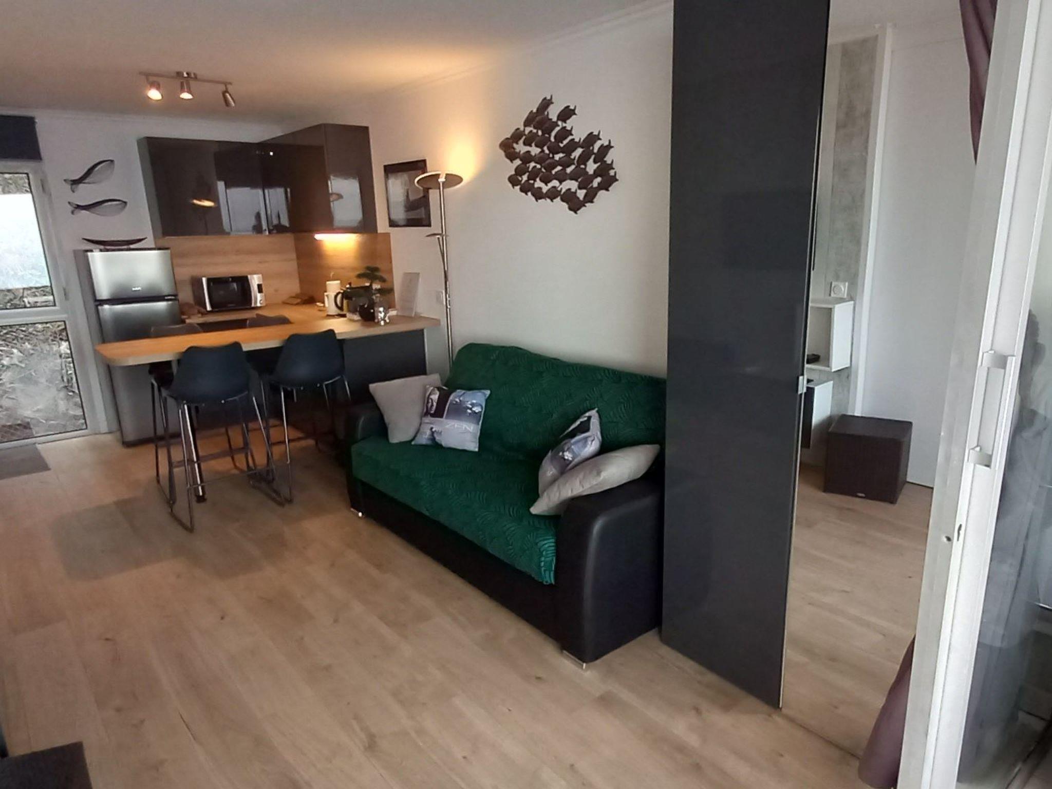 Un salon avec canapé convertible 2 places TV DVD et mini chaîne, une chambre avec un lit 2 places, une cuisine aménagée avec tous les accessoires indispensables, table induction, four, four micro onde, cafetière, lave-vaisselle, une salle de bains avec baignoire, un petit coffre.