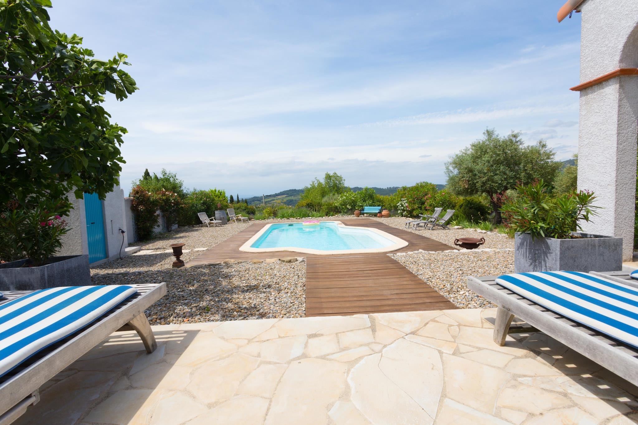 Flygt til denne smukke 4-værelses villa beliggende i Camplong nær Félines-Minervois, perfekt til familier, der søger ro og plads. Designet til komfortabelt at rumme 8 gæster, det har to hyggelige soveværelser med dobbeltsenge, et værelse med to enkeltsenge og et værelse med køjeseng, der er ideelt til børn. Villaen kombinerer moderne bekvemmeligheder med rustik charme, herunder en brændeovn, aircondition overalt og streamingklar underholdning med internationale tv-kanaler, dvd-afspiller og internetradio. Nyd afslappende aftener ved bålet eller slap af med en kølig brise indendørs. Træd udenfor til en privat, varmeovervåget swimmingpool omgivet af liggestole - dit perfekte sted til at slikke den sydfranske sol. Den ekspansive terrasse kan prale af et stort spisebord, grill og havemøbler i hårdttræ, ideel til al fresco-måltider med udsigt over den fantastiske Aude-dal og de bølgende vinmarker i Minervois og Corbières. Villaen ligger kun få minutter fra vinmarkerne og maleriske landsbyer og giver en port til kulturelle skatte såsom Carcassonnes middelaldercitadel og naturskønne bådture på Canal du Midi. Golfentusiaster kan spille golf på den nærliggende Golf de Carcassonne, kun 37 km væk. For at spise kan du nyde autentisk fransk køkken på Restaurant la Citadelle (15 km) eller nyde hyggelige caféstemninger på Café de la Terrasse (23 km). Med Carcassonne Lufthavn under 40 km, venter din problemfri ferie - fordyb dig i skønheden og gastronomien i Sydfrankrig.